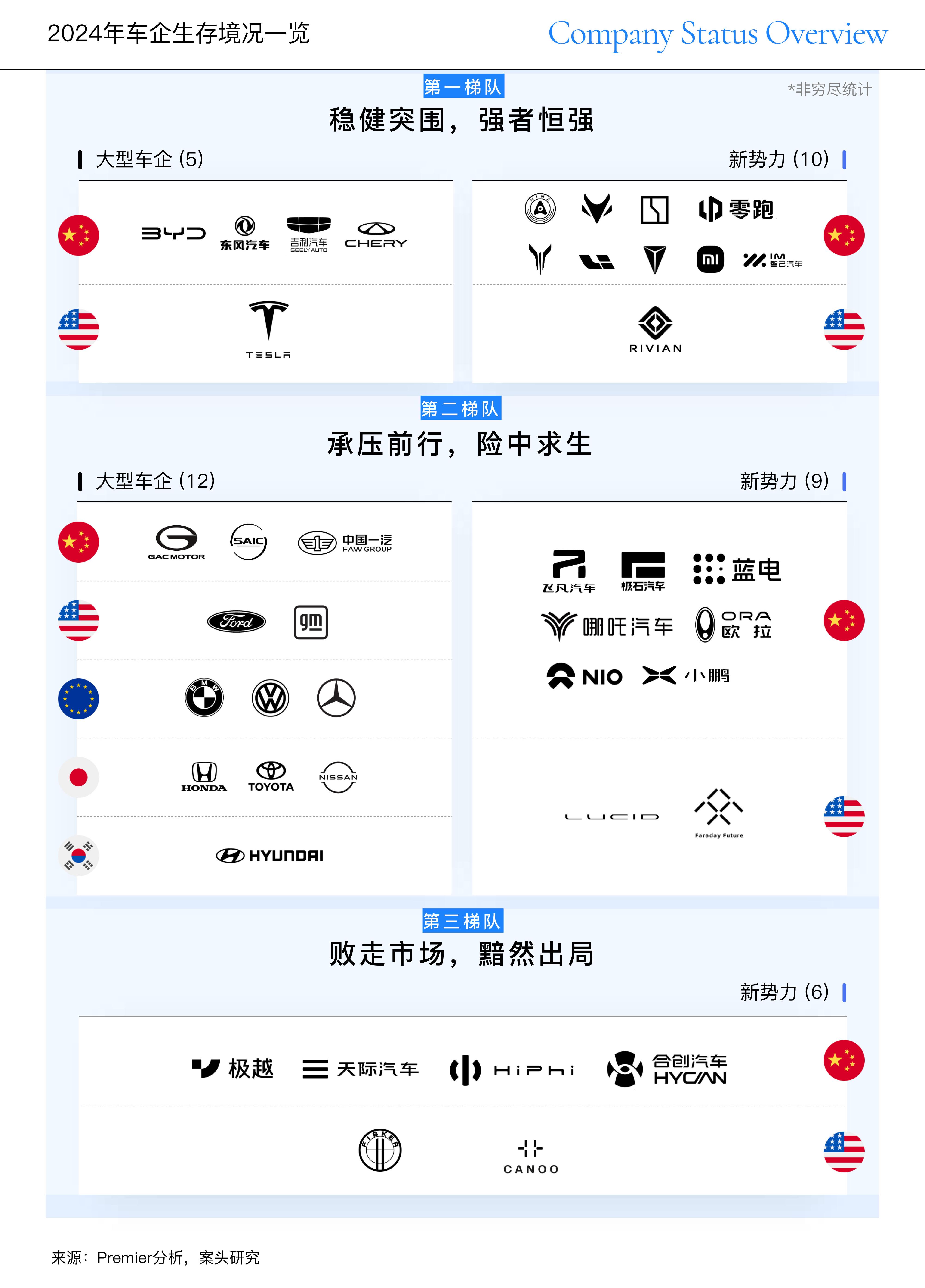 2024年,汽车行业无疑经历了一场大洗牌浪潮。据Premier全年观察统计,大型车企和新势力两大类别中各个企业生存境况迥异,可进一步归纳为三大梯队。其中,15家车企经营稳健,包括5家大型车企和10家新势力;21家车企面临挑战,包括12家大型车企和9家新势力;6家车企离席,且均为新势力。