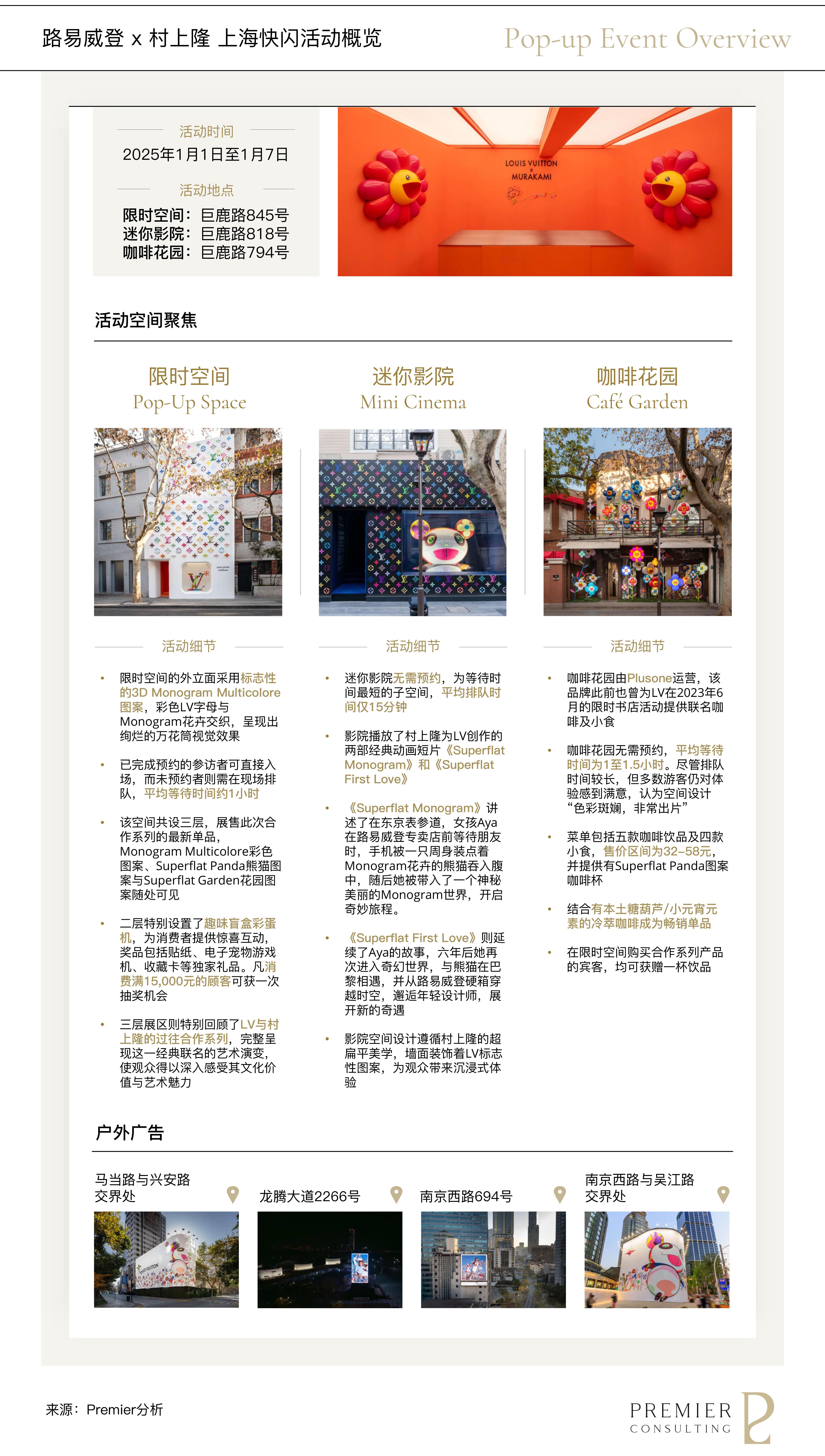 限时空间早已成为品牌营销的常规玩法,头部品牌梯队在预算加持下的“城市接管” (City Take-over) 近年来亦屡见不鲜。而此次路易威登 × 村上隆合作系列 (Louis Vuitton × Takashi Murakami Collaboration) 的快闪活动再度升维,在沉浸式零售空间外设置迷你影院与咖啡花园,以复合体验空间模式进一步刷新快闪活动的行业标杆。