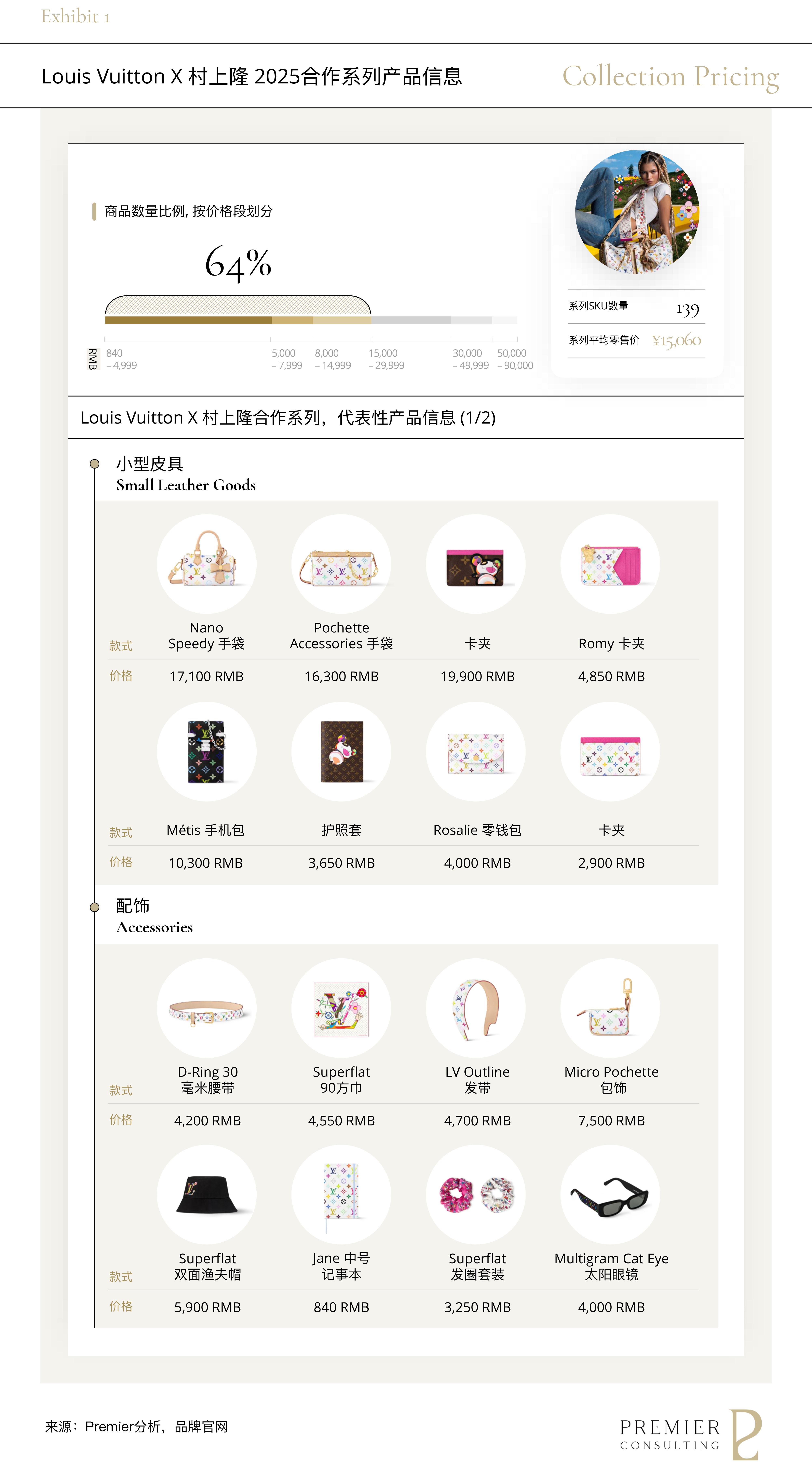 Premier研究统计,在品牌中国区官网发布的路易威登x村上隆合作系列中,单品定价低于15,000元的产品占比高达64%[Exhibit 1],其中5,000元以下的产品配置更超过50款。这一抽奖机制的设立,无疑大幅提升了入门级产品的购买率,推动消费者在原本的购物预算上增加投入。