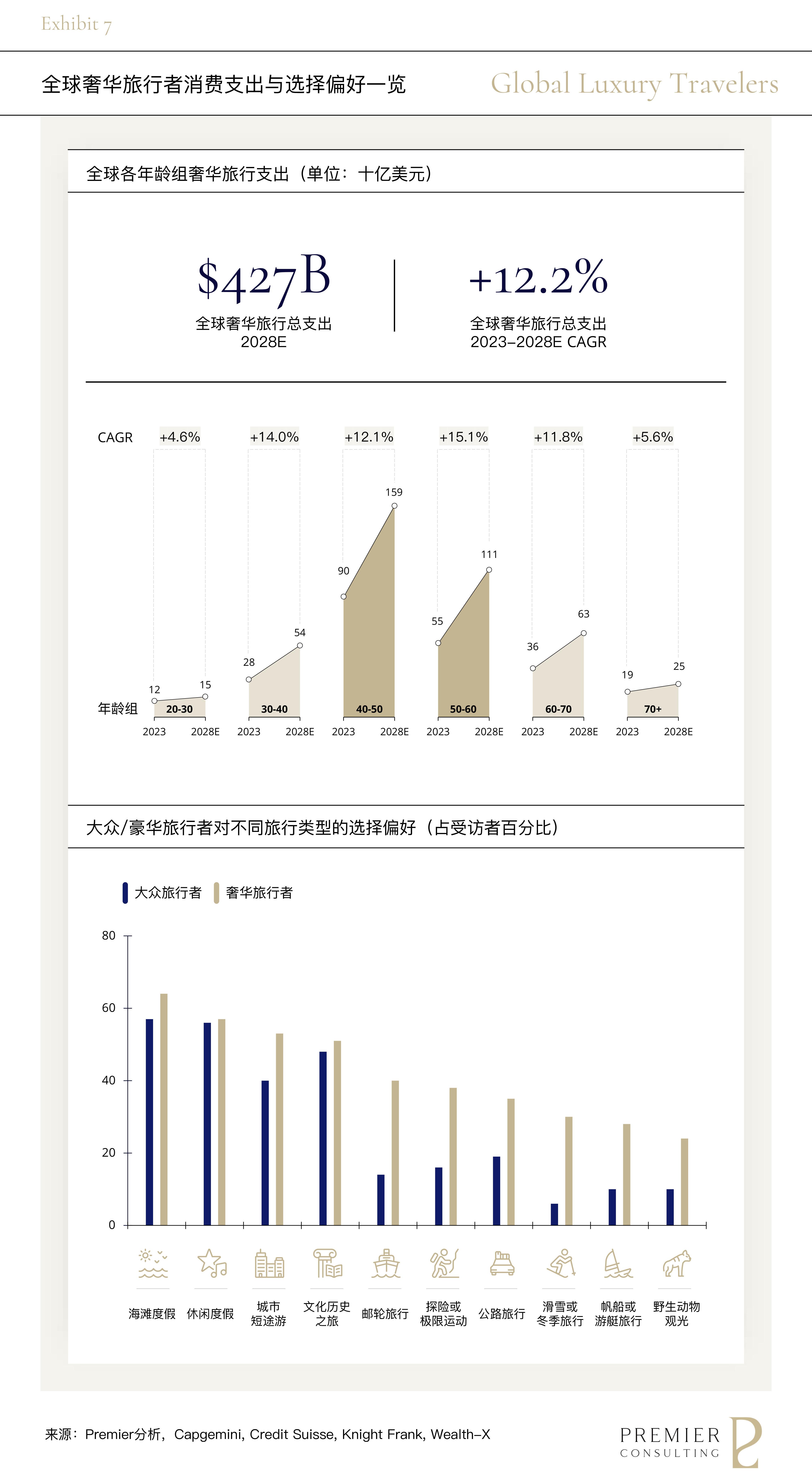 - 经典度假仍是主流:65%的奢华旅行者首选阳光海滩,55%倾向于放松型度假[Exhibit 7],他们对极致舒适的追求,使得马尔代夫、巴厘岛、南法蔚蓝海岸等目的地依旧是奢华旅行市场的宠儿。