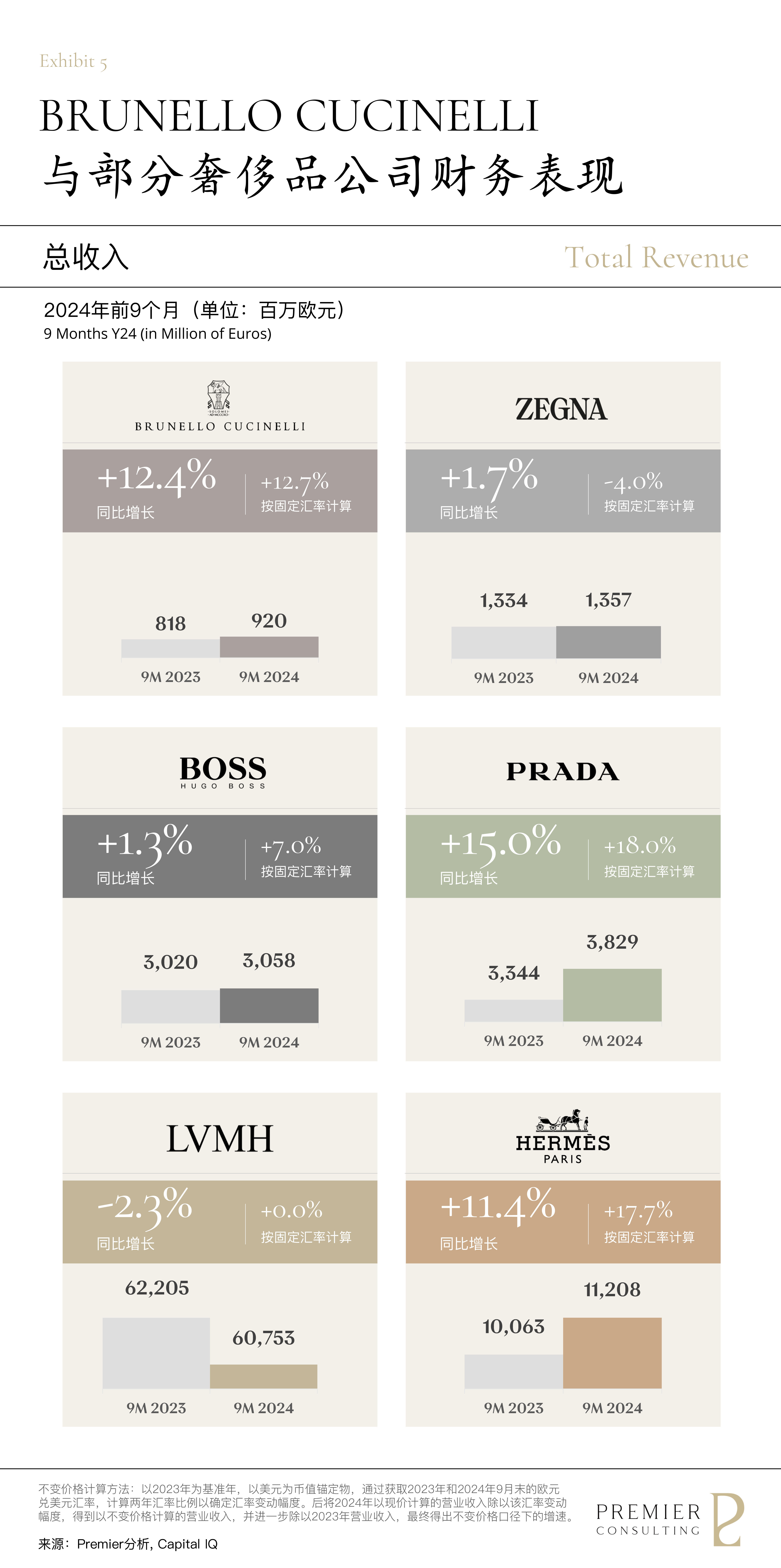 在全球奢侈品市场需求放缓的背景下,Brunello Cucinelli依然实现了稳健增长。2024第三季度全球营收同比增长9.2%,达3亿欧元;截至9月30日的前九个月,收入同比增长12.4%,达9.202亿欧元 [Exhibit 5]。