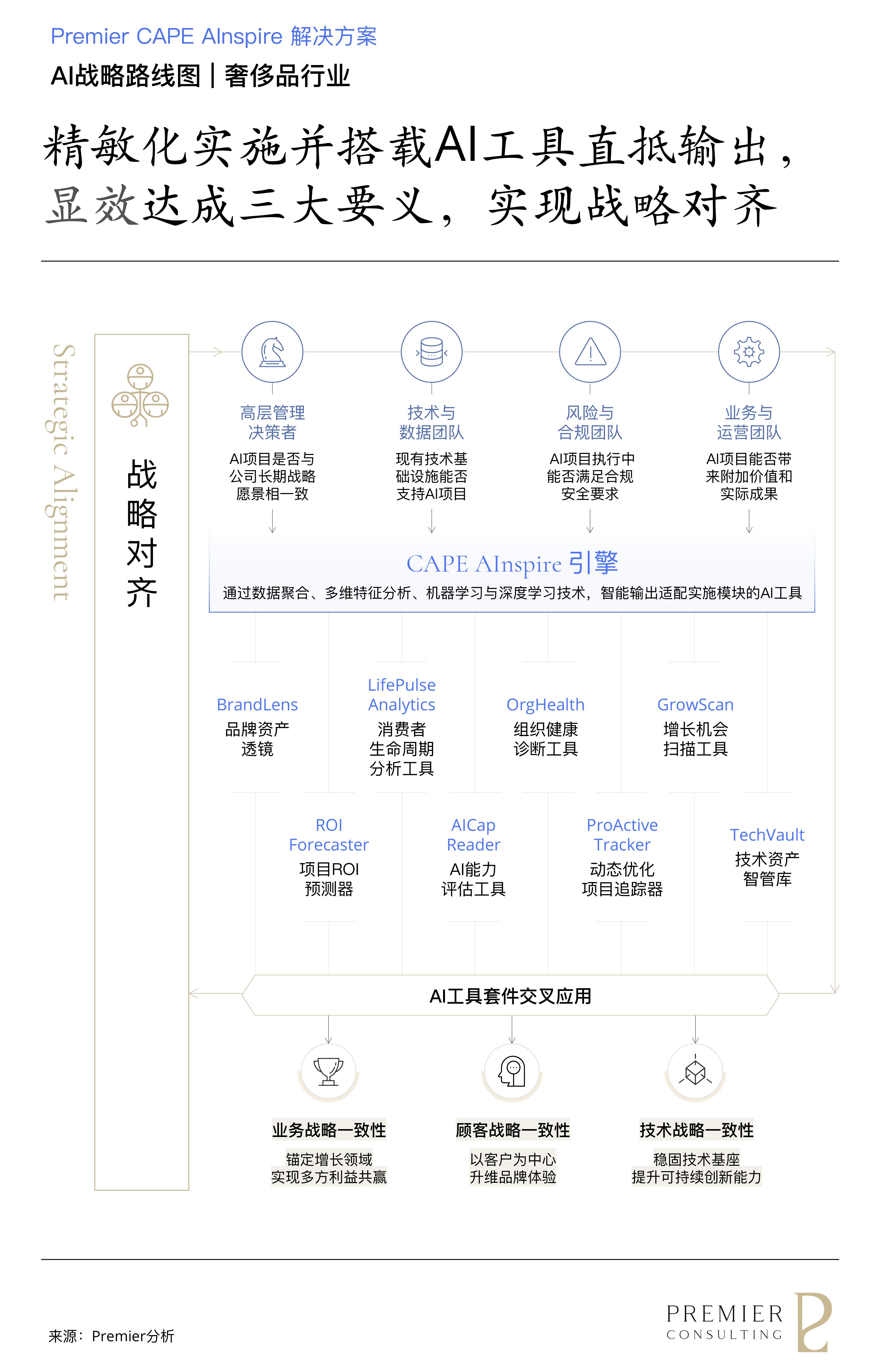 适配奢侈品行业的强品牌价值特性,Premier的CAPE AInspire 解决方案将领导力旋钮拆解为三大战略要义:业务战略一致性、顾客战略一致性与技术战略一致性。通过精敏化实施并搭载AI工具直抵输出,帮助企业在保护品牌遗产的同时,开拓技术驱动的增长路径,实现人、品牌与创新共生发展的三象平衡。