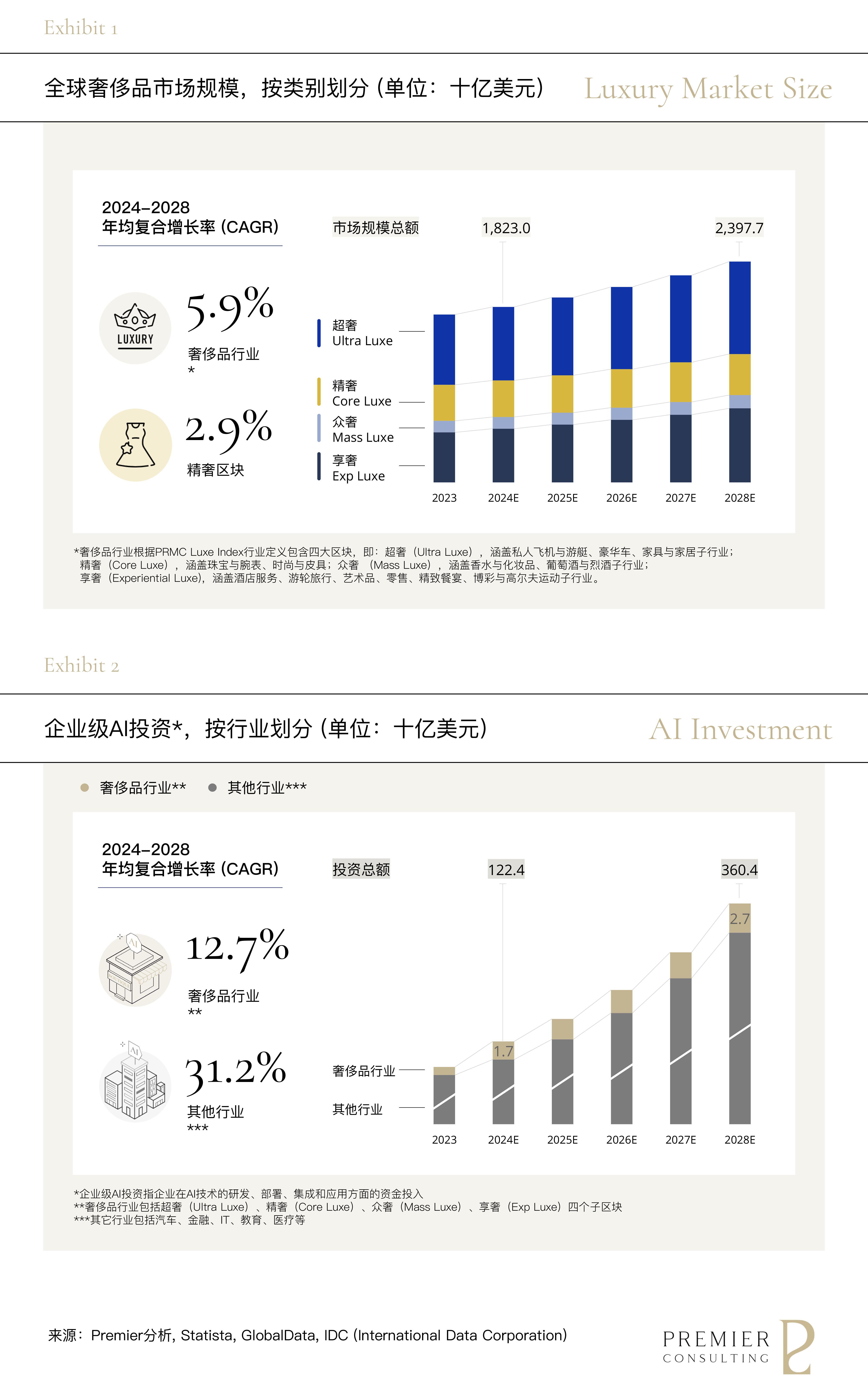 然而,整体行业对AI的投入增速依旧可观。GlobalData研究显示,奢侈品行业在过去三年对AI的累计投资逾3.6亿美元,较前三年期同比增长79%。Premier预计,2024至2028年间,全球奢侈品公司的AI相关投入CAGR将维持在约12.7%;至2028年,奢侈品行业企业级AI投入将达27亿美元[Exhibit 2],相当于同期全球奢侈品市场规模的1‰。