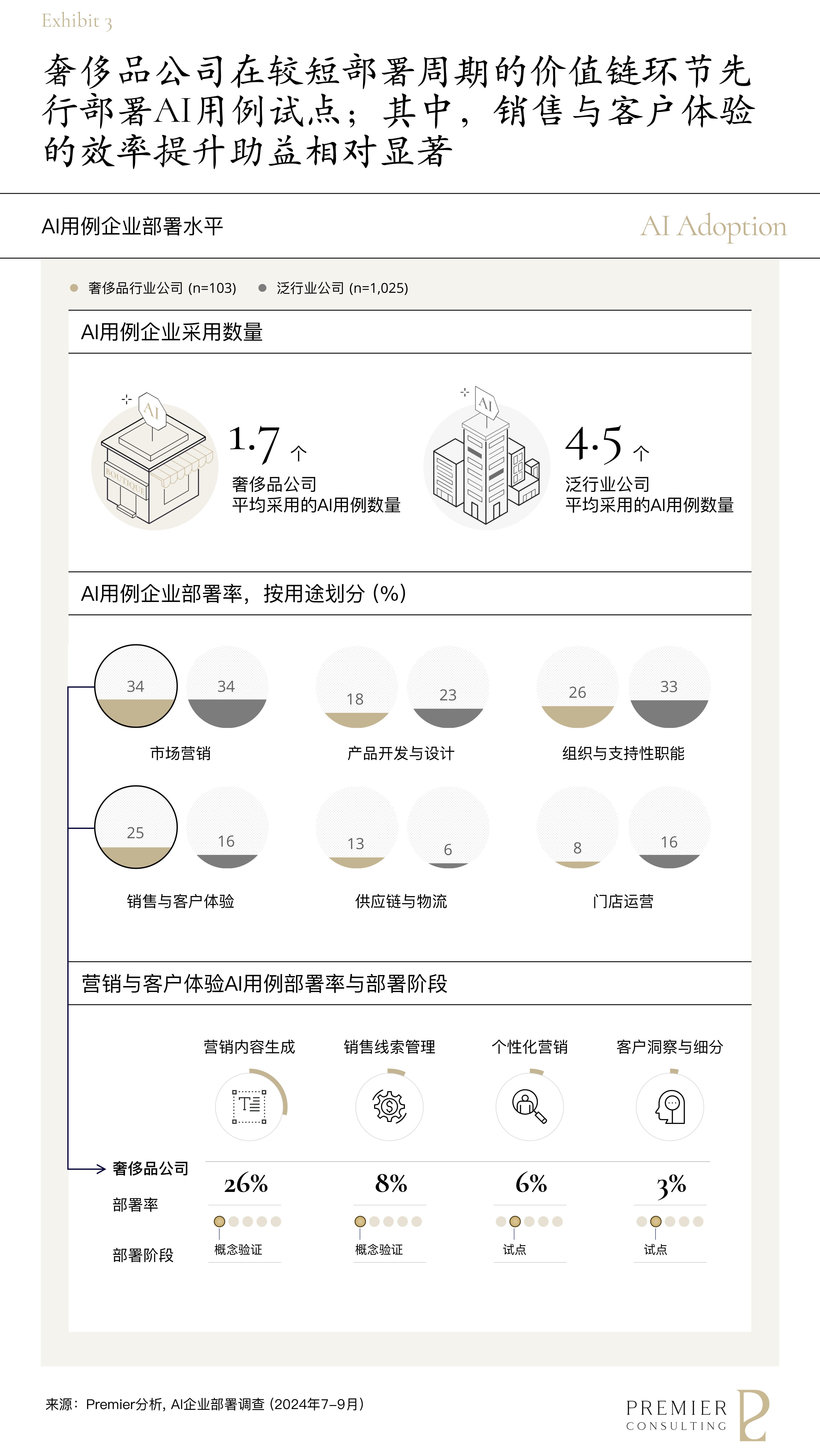 符合预期的是,相较其他行业,奢侈品公司的自身AI采用更谨小慎微。根据今年AI企业部署研究结果显示[Exhibit 3],奢侈品公司的平均AI用例 (AI Use Case) 采用数量仅为1.7个,低于其他行业公司均数近3个用例;而近1/3的奢侈品公司尚未对AI进行商用布点。