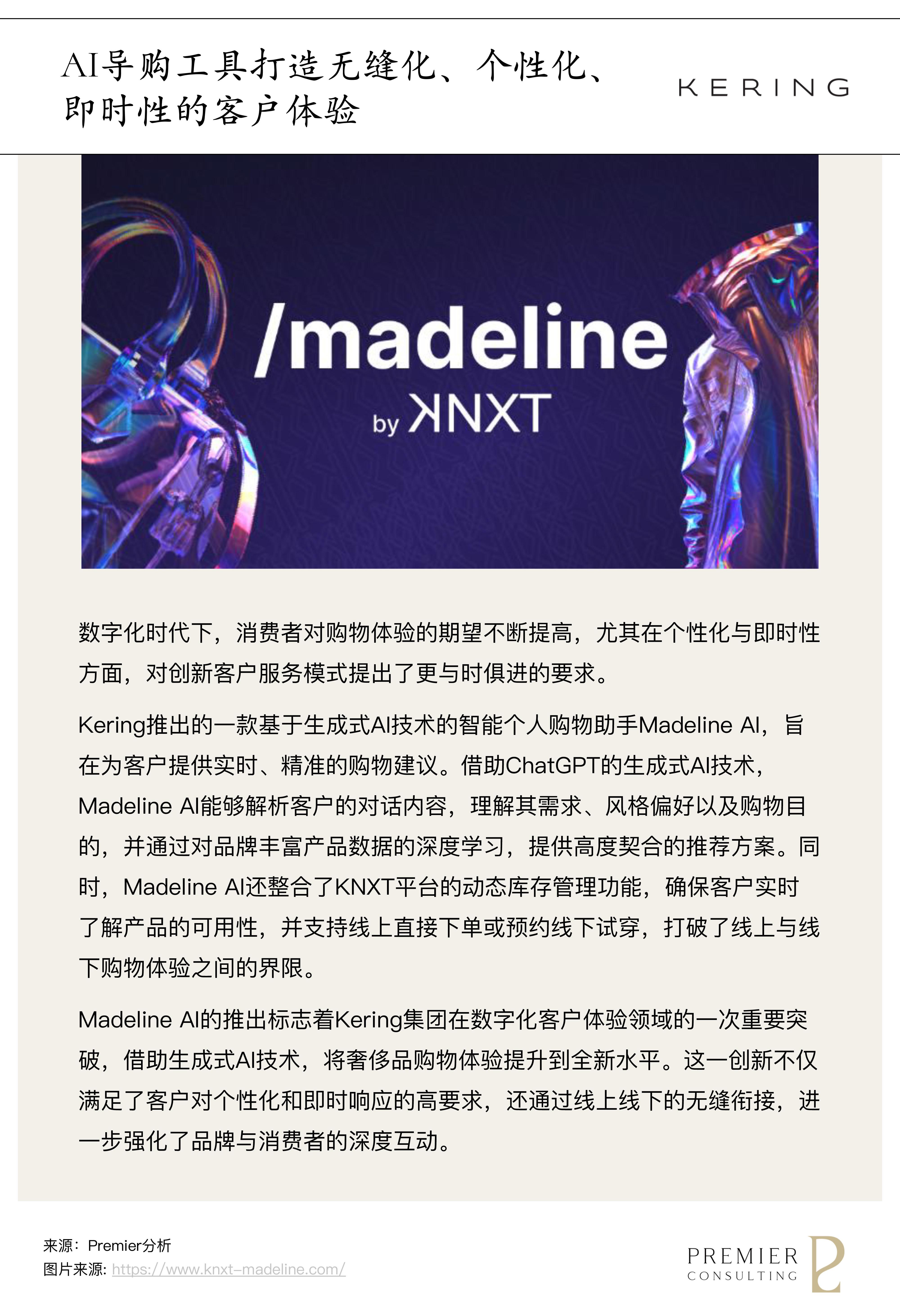 - 个性化营销和客户洞察与细分作为品牌联结客户的有形工具,在预测性AI (Predictive AI) 技术基座更为成熟之时,多在大型奢侈品集团落地或临近实施;