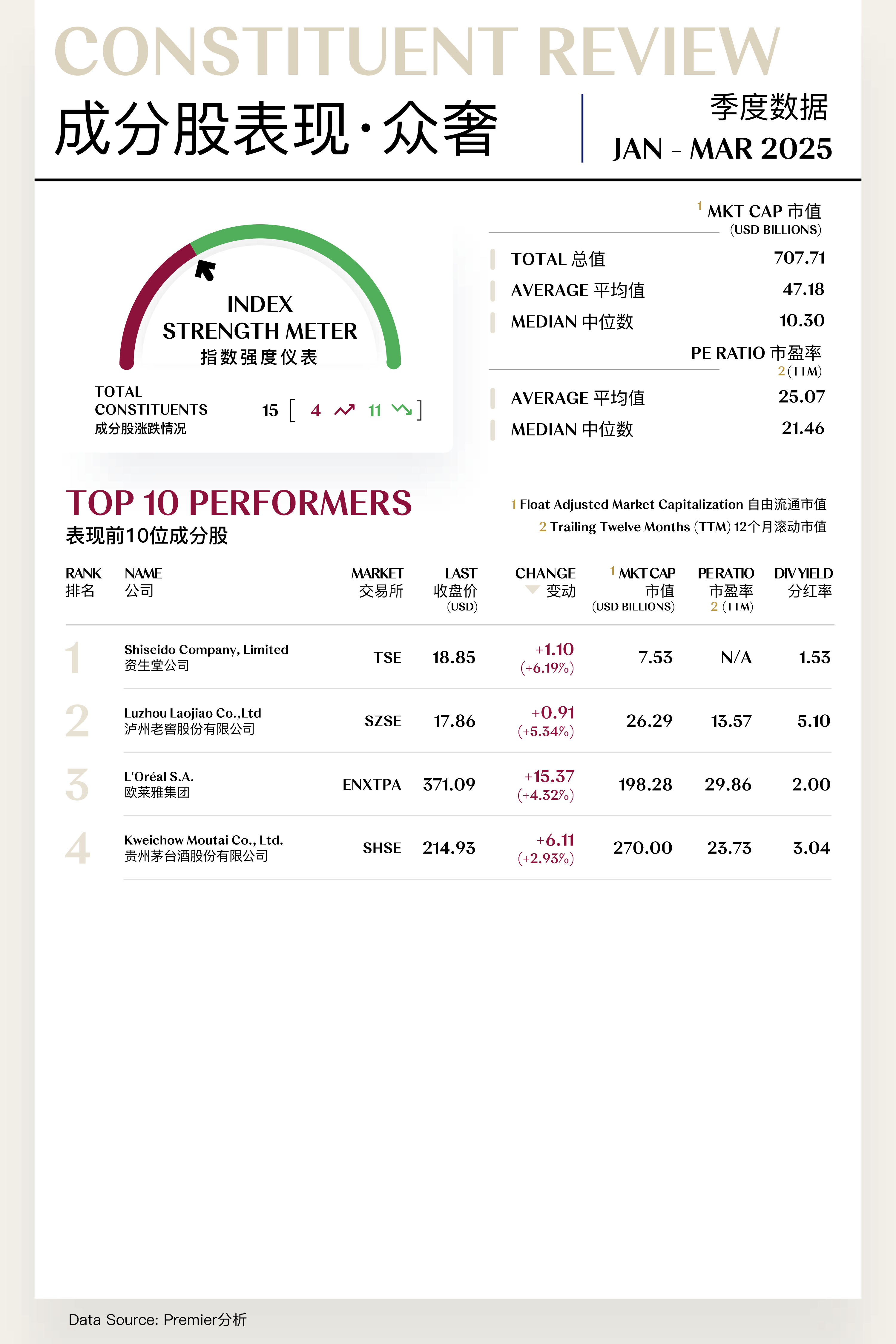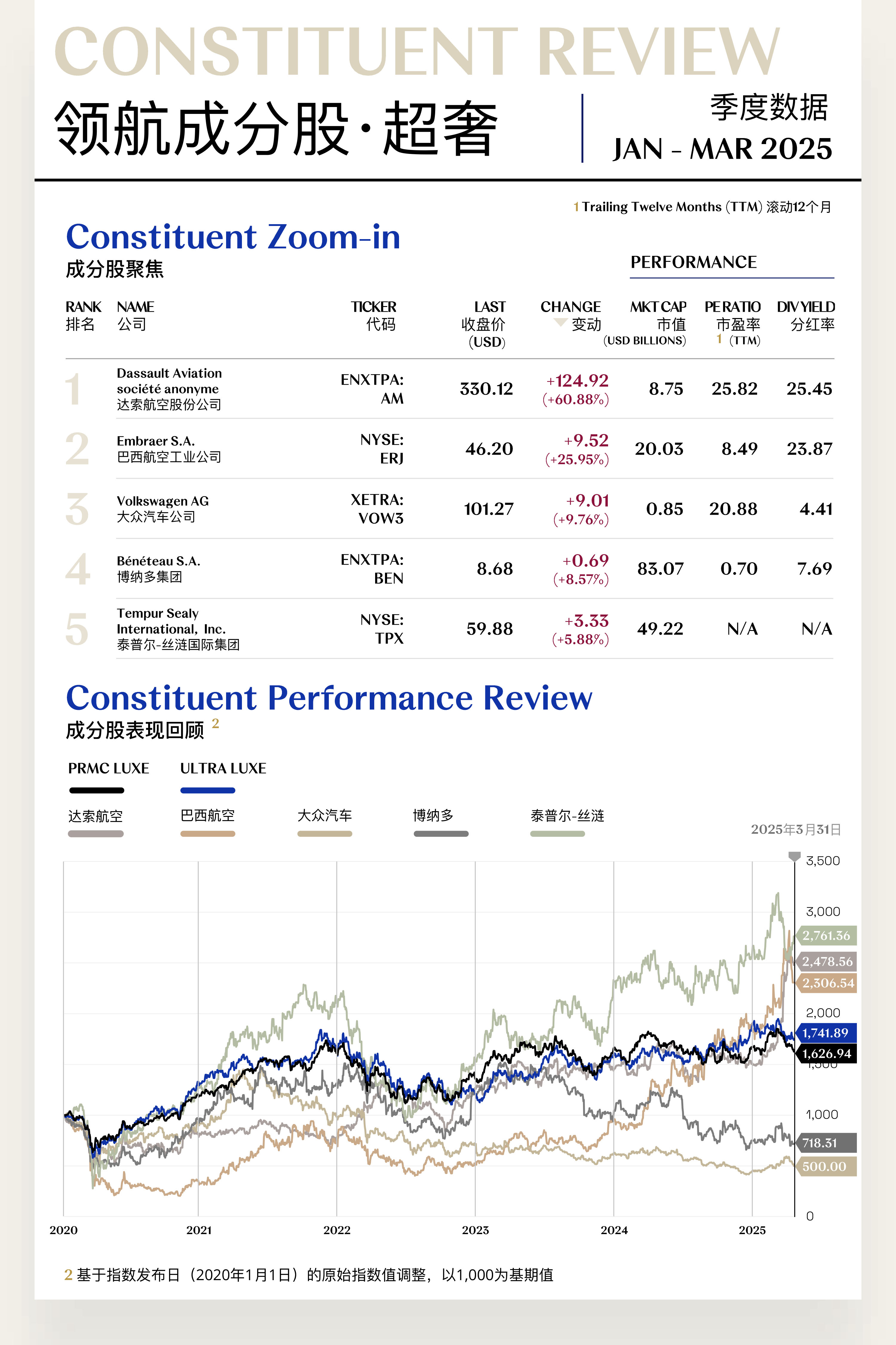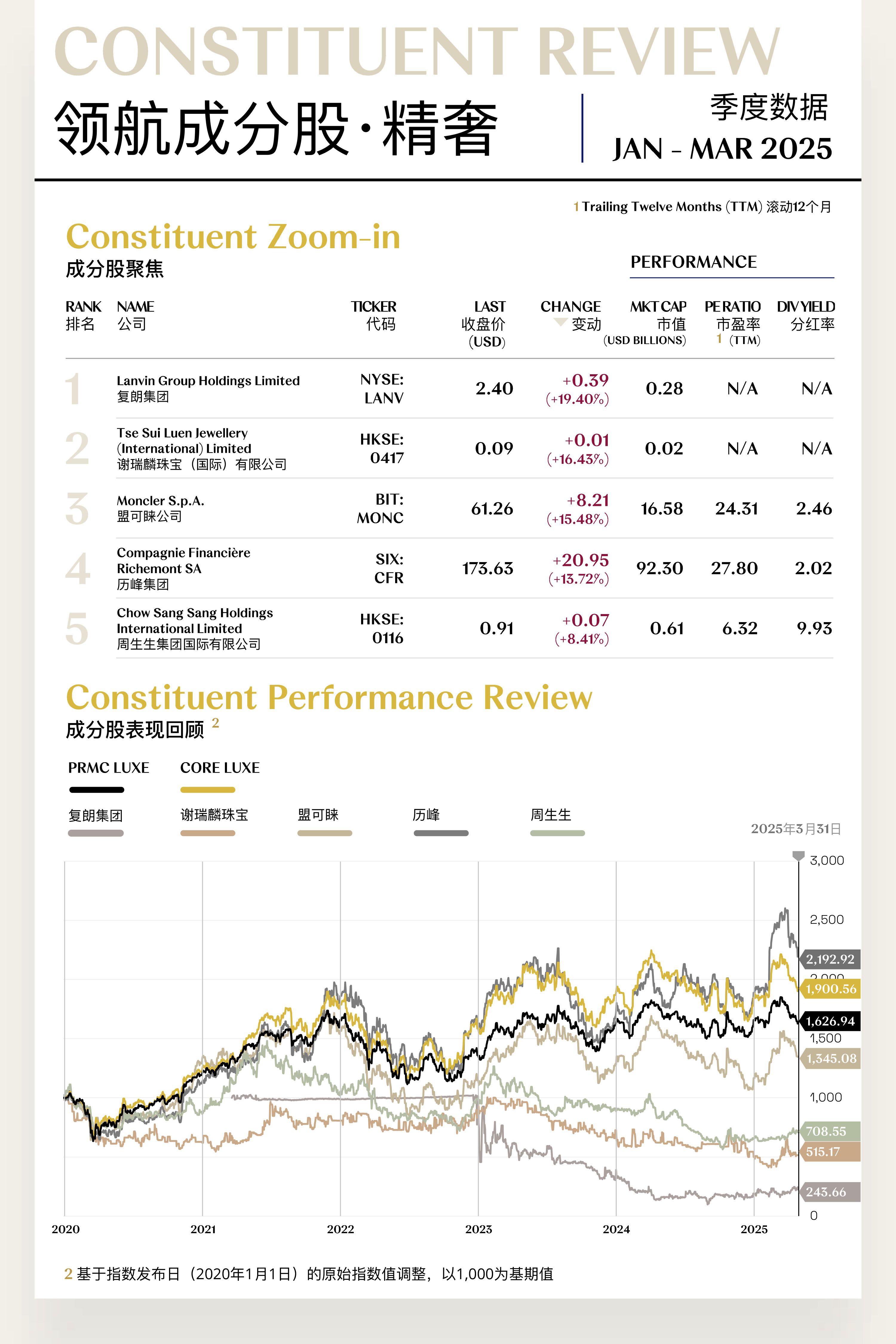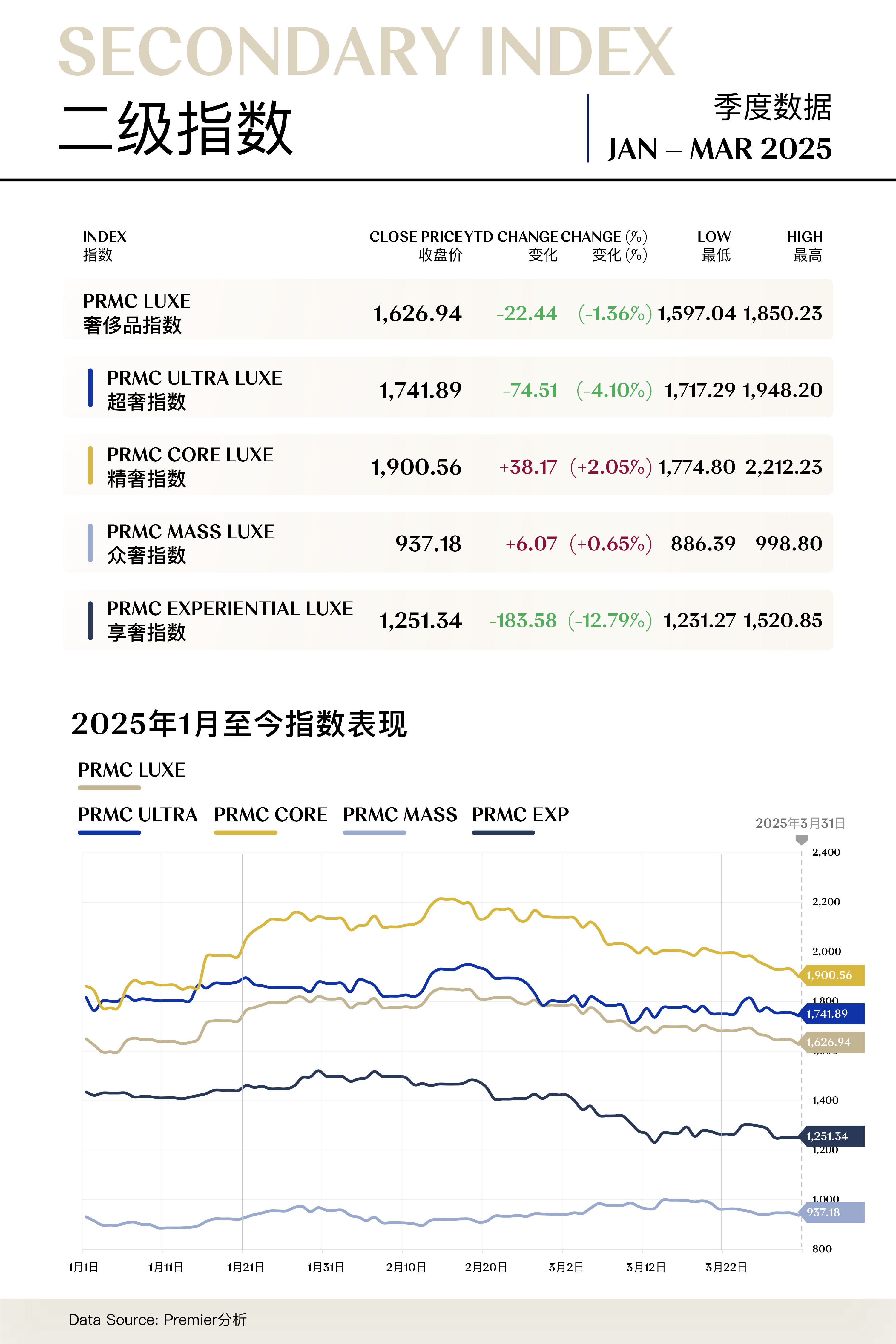 溥元奢侈品指数(PRMC Luxe Index)第一季度收于1,626.94点,季内下跌22.44点(-1.36%),表现逊于MSCI ASIA PACIFIC及EURO STOXX 100,但优于MSCI ACWI及S&P 500等全球主要指数。二级指数方面,精奢指数(+2.05%)逆势上行,众奢指数(+0.65%)运行稳定,超奢指数(-4.10%)略有下行,享奢指数(-12.79%)则大幅回退。