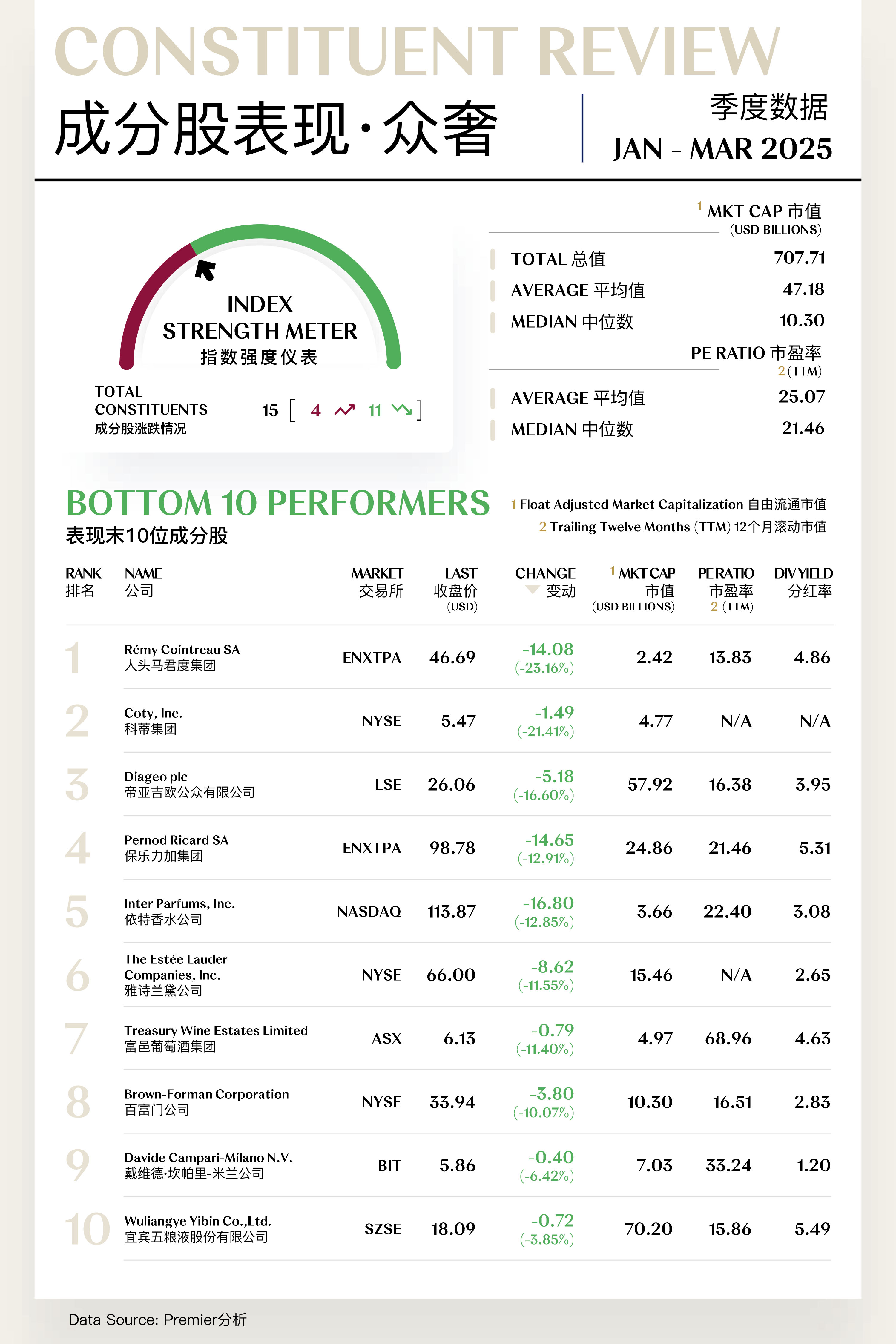 公司于2025年第一季度发布2024全年财报。尽管净销售额同比增长2.4%,至30.7亿欧元,但调整后净利润下降3.7%,至3.76亿欧元,未调整净利润更是同比大幅下降39%,至2.02亿欧元。业绩下行主要由Courvoisier收购带来的整合成本、美国市场关税不确定性、以及极端天气影响等多重因素共同驱动。管理层将2025年定位为“过渡期”,提示全年将面临增长趋缓和利润率承压的挑战,市场对此反应审慎,进而拉低公司估值水平。