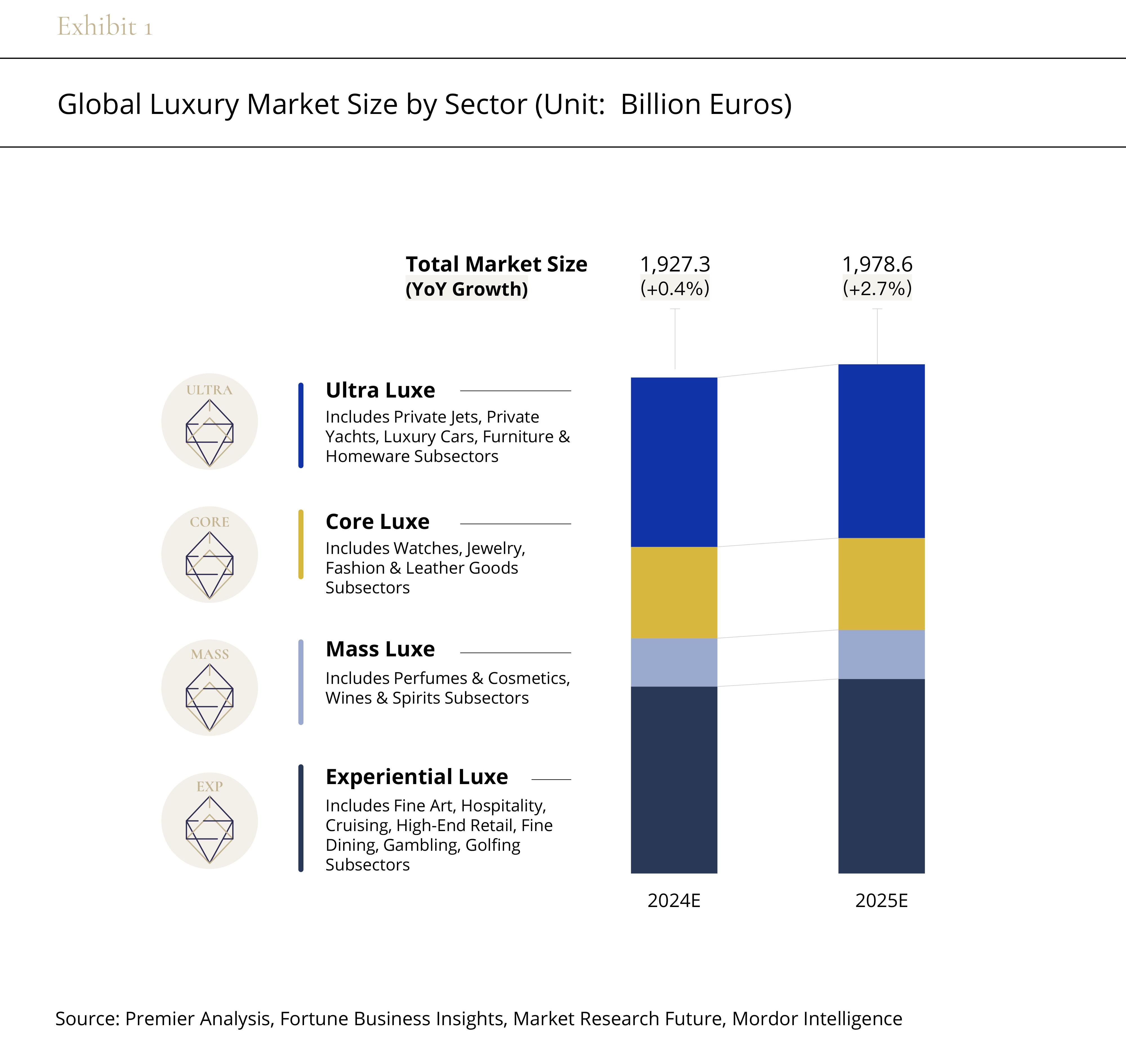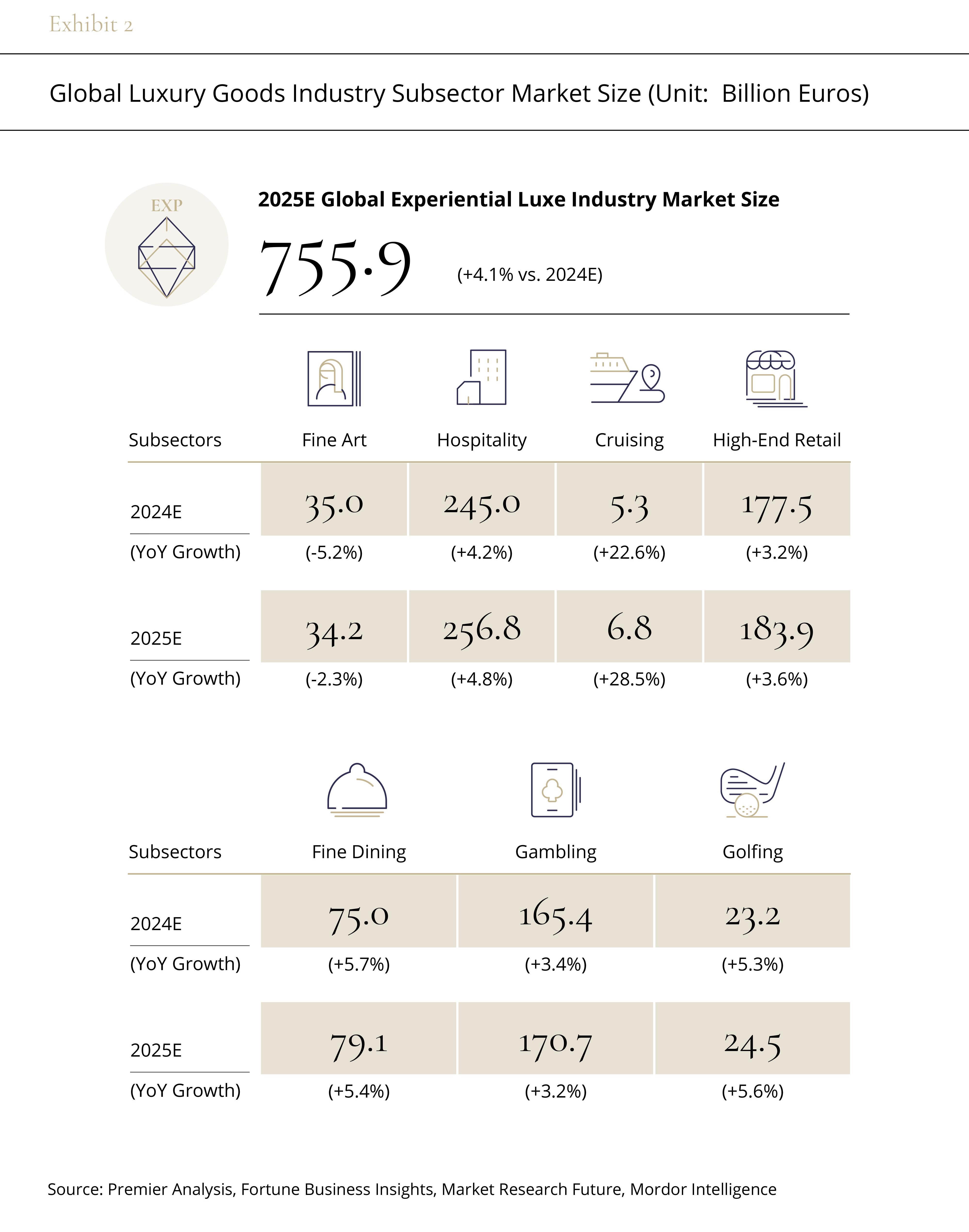 According to Premier's segmentation and estimation of the luxury goods market, in 2025, the global luxury market is expected to grow by 2.7%, primarily driven by the growing demand from high-net-worth individuals for holistic luxury experiences. In response, the Experiential Luxe sector, which includes luxury services such as hospitality, cruising, fine dining, gambling, and golfing, is becoming a key engine driving market growth.