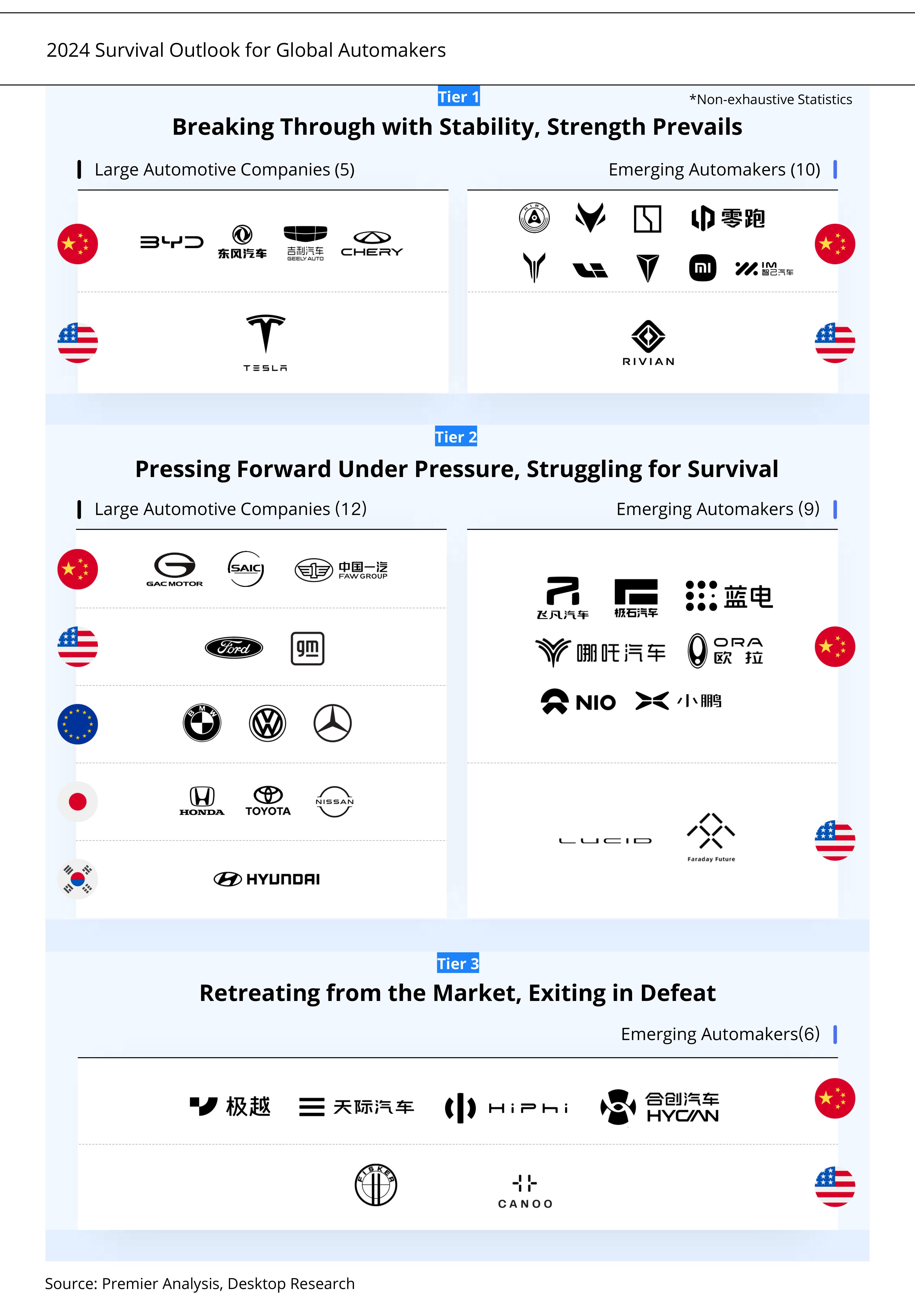 In 2024, the automotive industry underwent a major reshuffling. According to Premier’s annual observations, the survival landscape of major automakers and emerging EV startups has diverged significantly, forming three distinct tiers. Among them, 15 companies—including 5 major automakers and 10 startups—maintained stable operations, while 21 companies—12 major automakers and 9 startups—faced significant challenges. Additionally, 6 companies—all startups—were forced to exit the market.