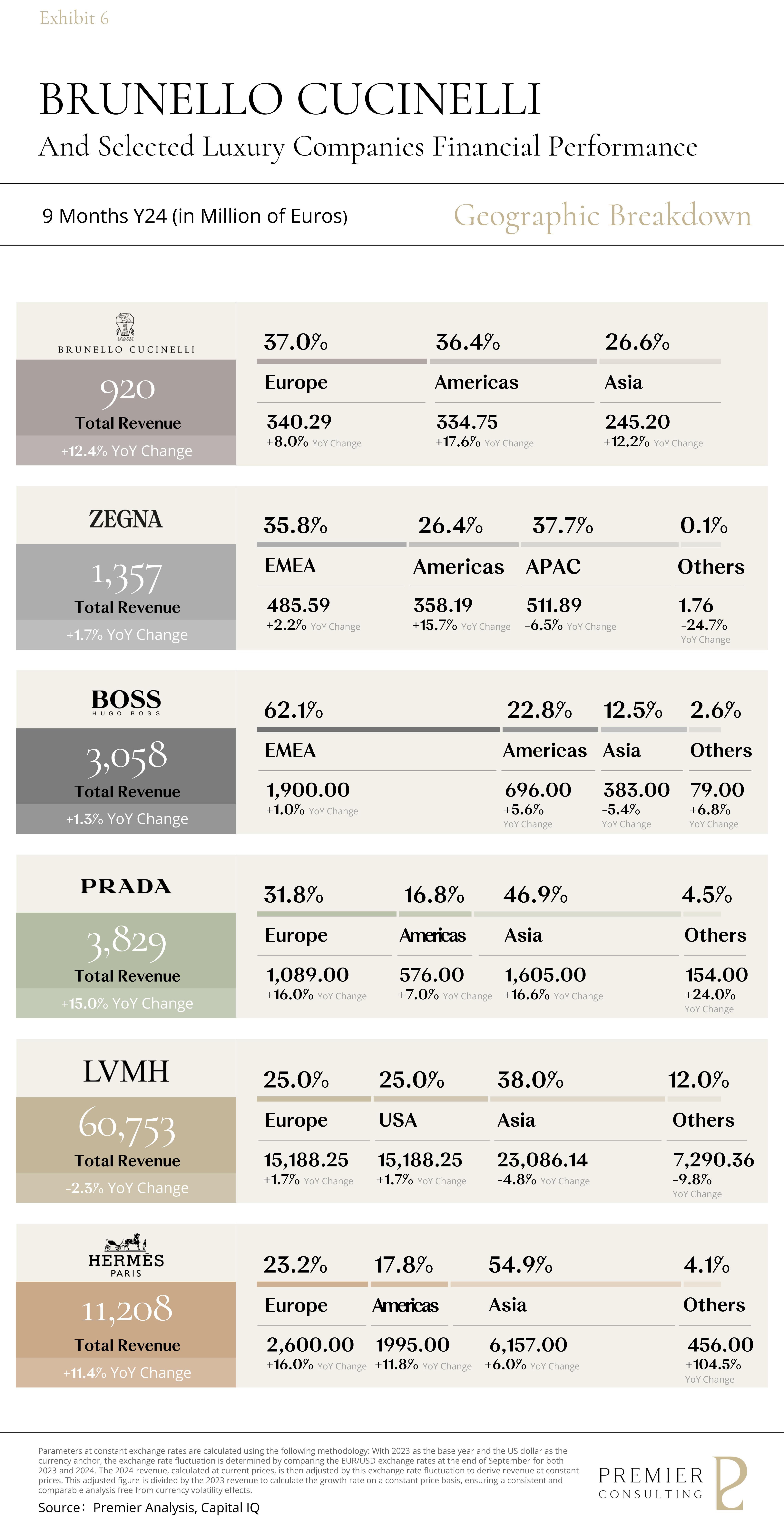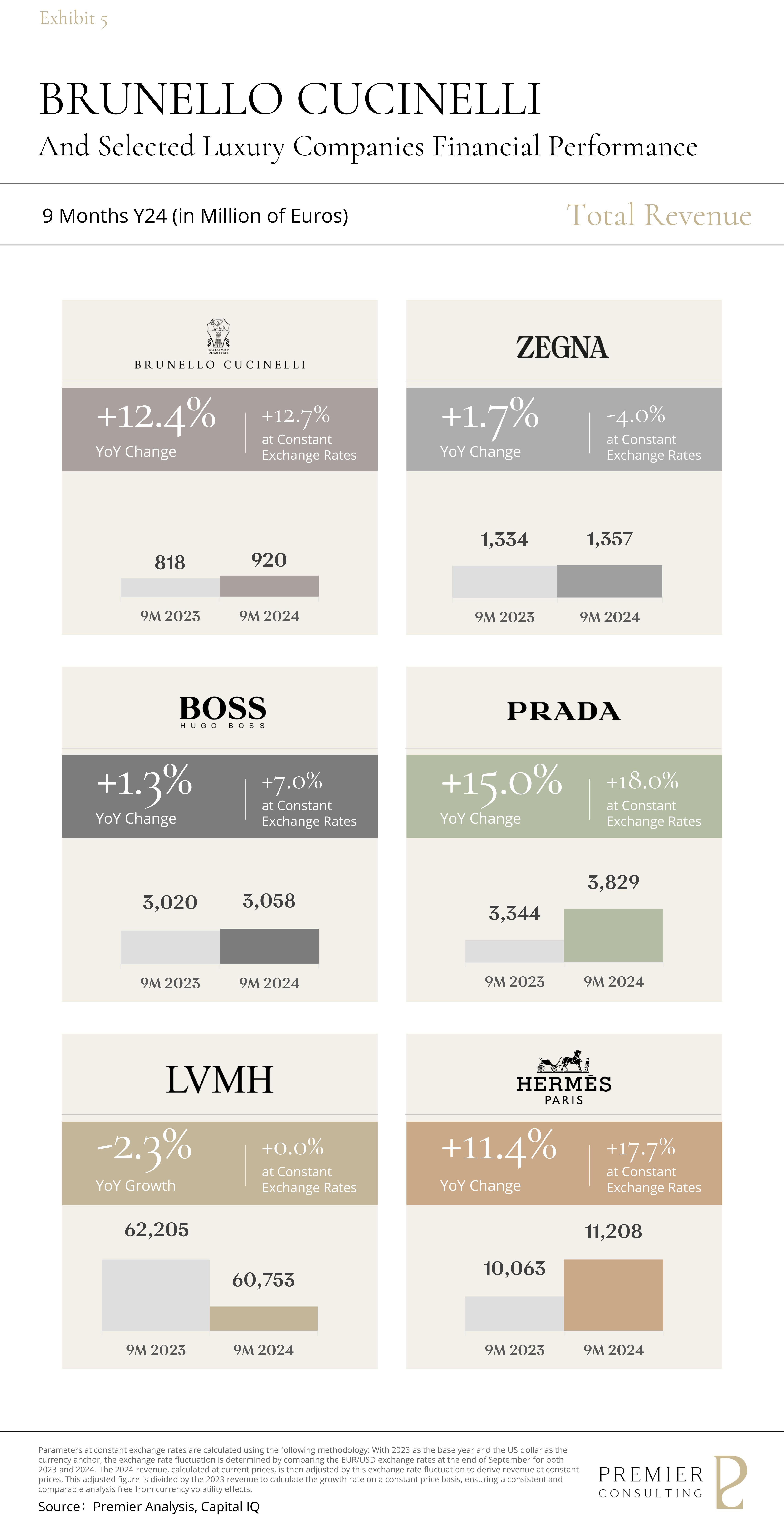 Despite a global slowdown in luxury goods market demand, Brunello Cucinelli has demonstrated consistent growth. In the third quarter of 2024, global revenues rose by 9.2% year-on-year, reaching €300 million. For the first nine months of the year ending on September 30, revenues grew by 12.4%, totaling €920.2 million [Exhibit 5].