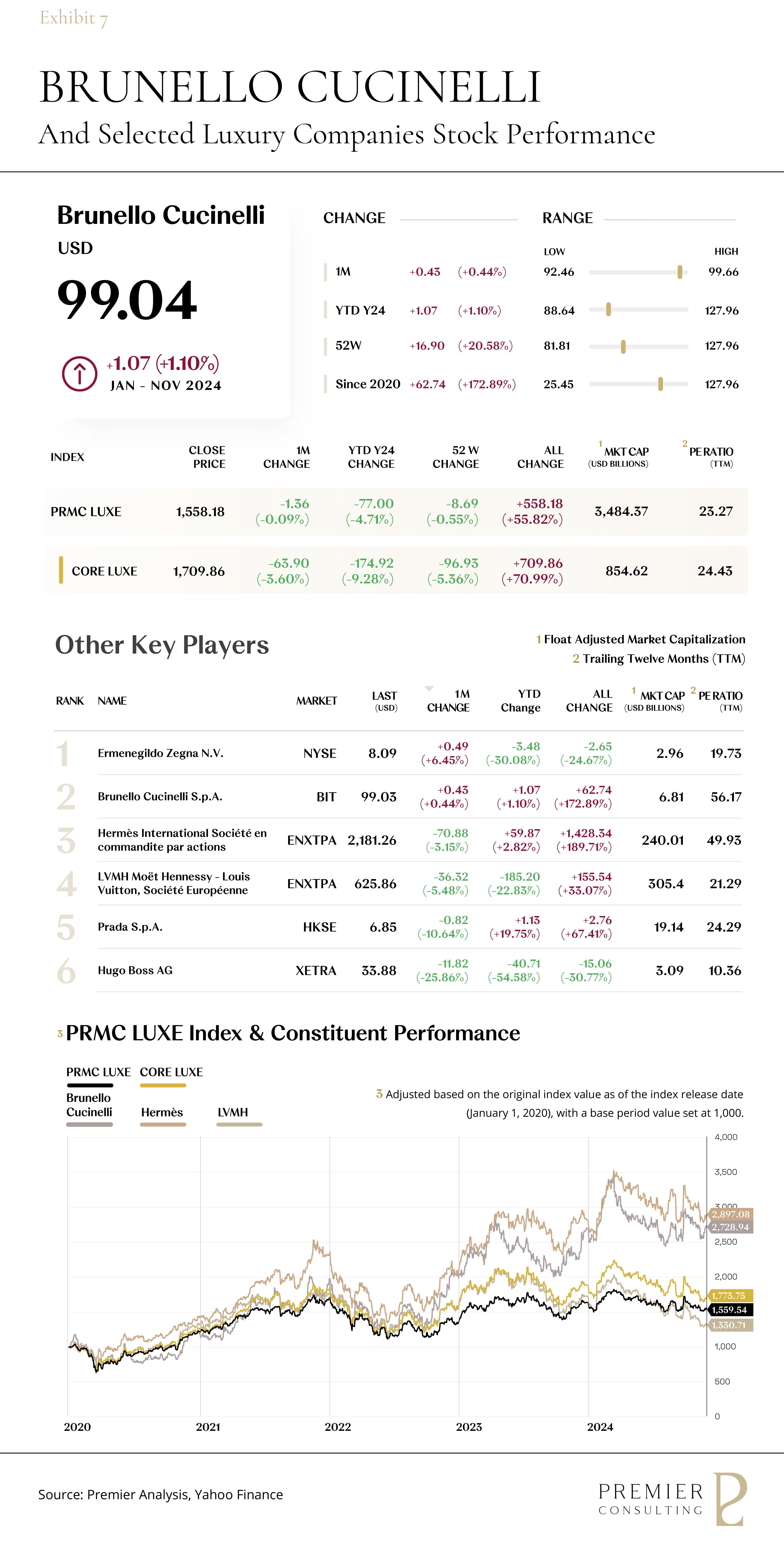 Brunello Cucinelli’s 2024 stock performance underscores the market’s strong conviction in the brand’s financial strength and long-term growth trajectory. As of December 20, 2024, the company’s share price closed at €105.00, representing an 18.51% increase year-to-date and a 21.32% rise over the past 12 months. Amid a broader downturn across the premium luxury index, Cucinelli stood out as a rare outperformer, delivering a standout result in a challenging market environment [Exhibit 7].