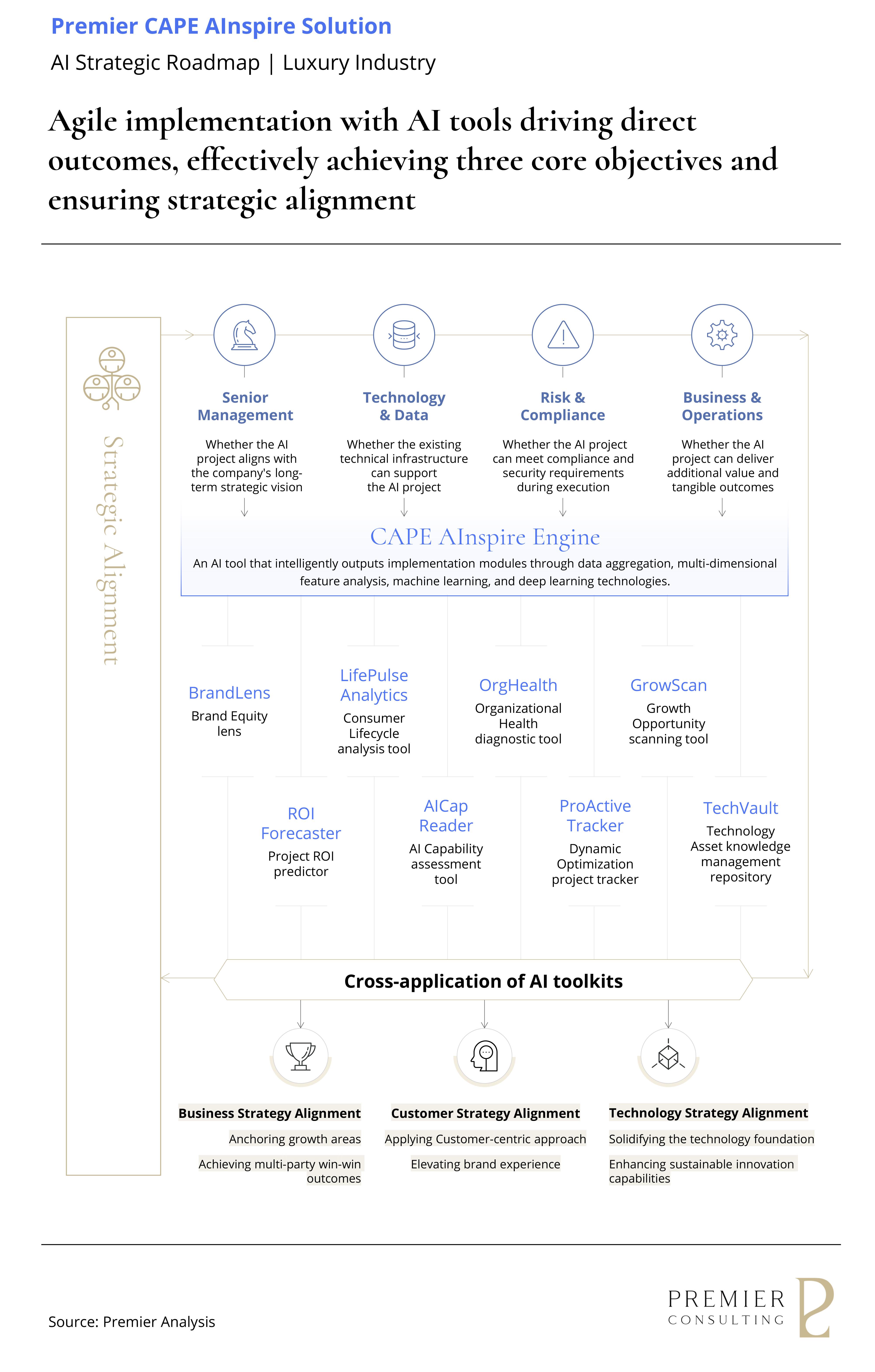 Tailored to the luxury industry’s focus on brand values, Premier’s CAPE AInspire solution breaks down leadership alignment into three strategic pillars: consistency in business strategy, alignment with customer strategy, and technological coherence. By optimizing implementation and integrating AI tools for direct impact, Premier helps businesses preserve their brand legacy while exploring technology-driven growth. This approach nurtures a balanced, symbiotic relationship between people, brand, and innovation.