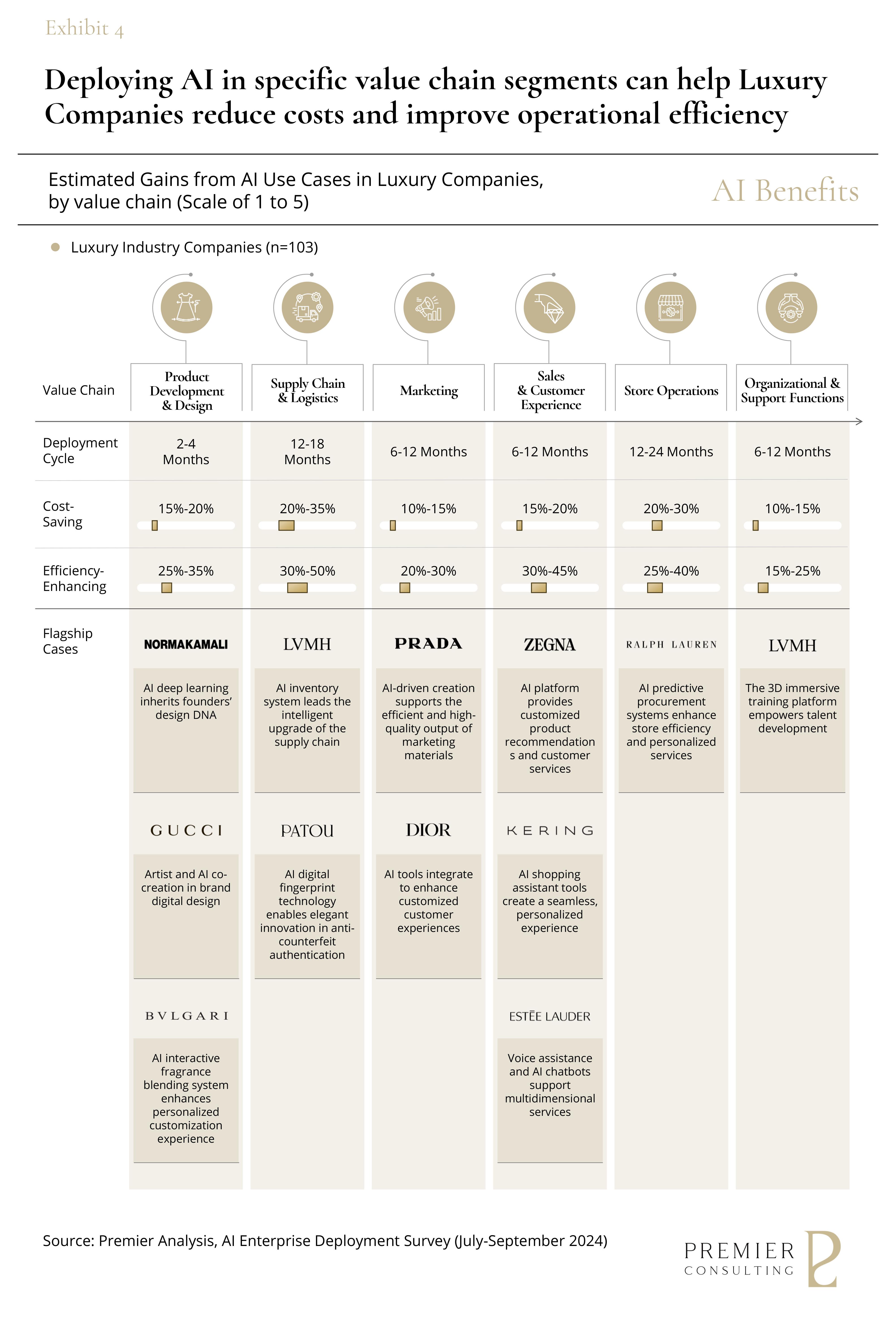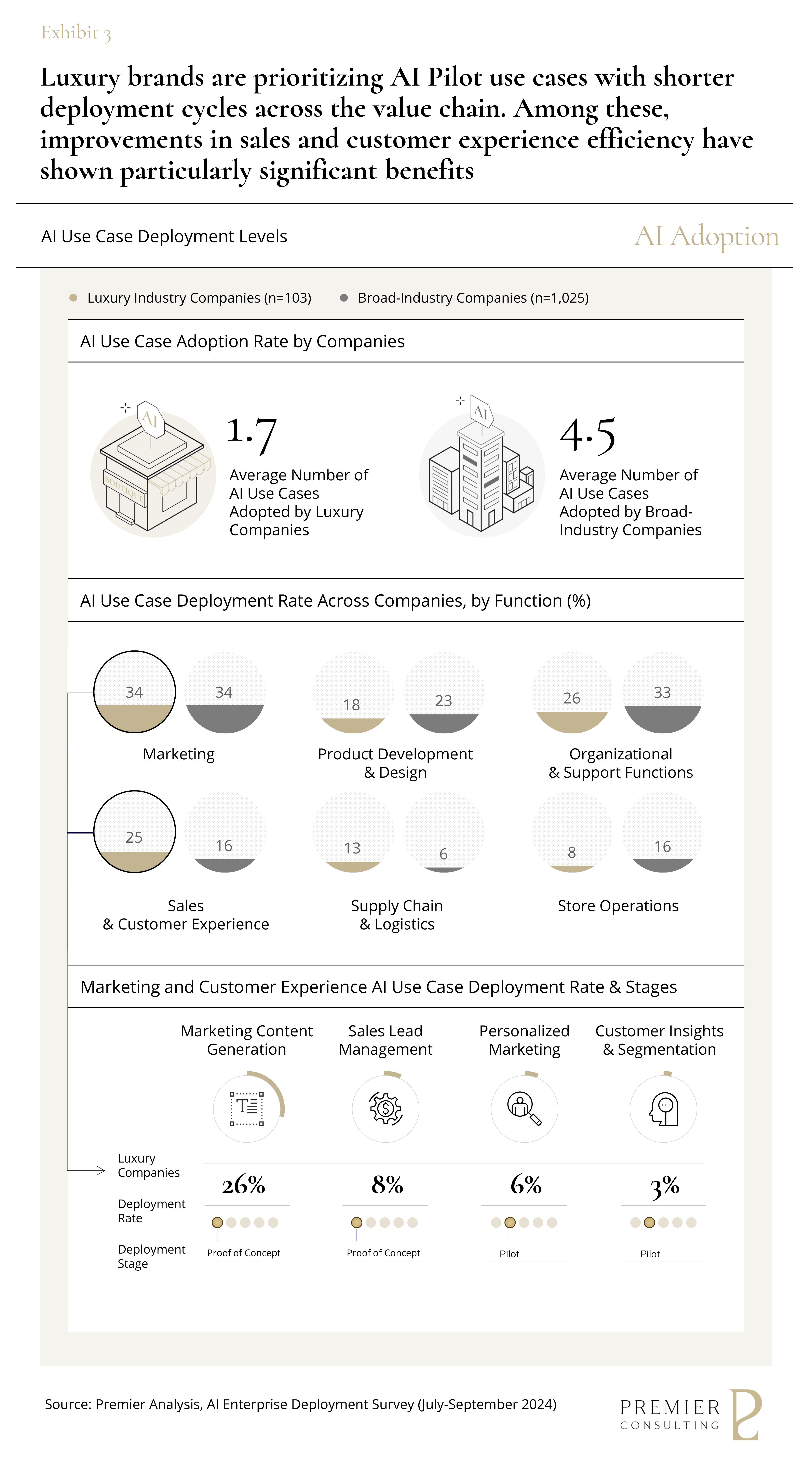 As expected, luxury companies are more cautious in adopting AI compared to other industries. According to this year's AI deployment research [Exhibit 3], the average number of AI use cases among luxury companies is only 1.7, significantly lower than the average of nearly 3 use cases in other industries. Additionally, nearly one-third of luxury companies have yet to implement AI for commercial purposes.