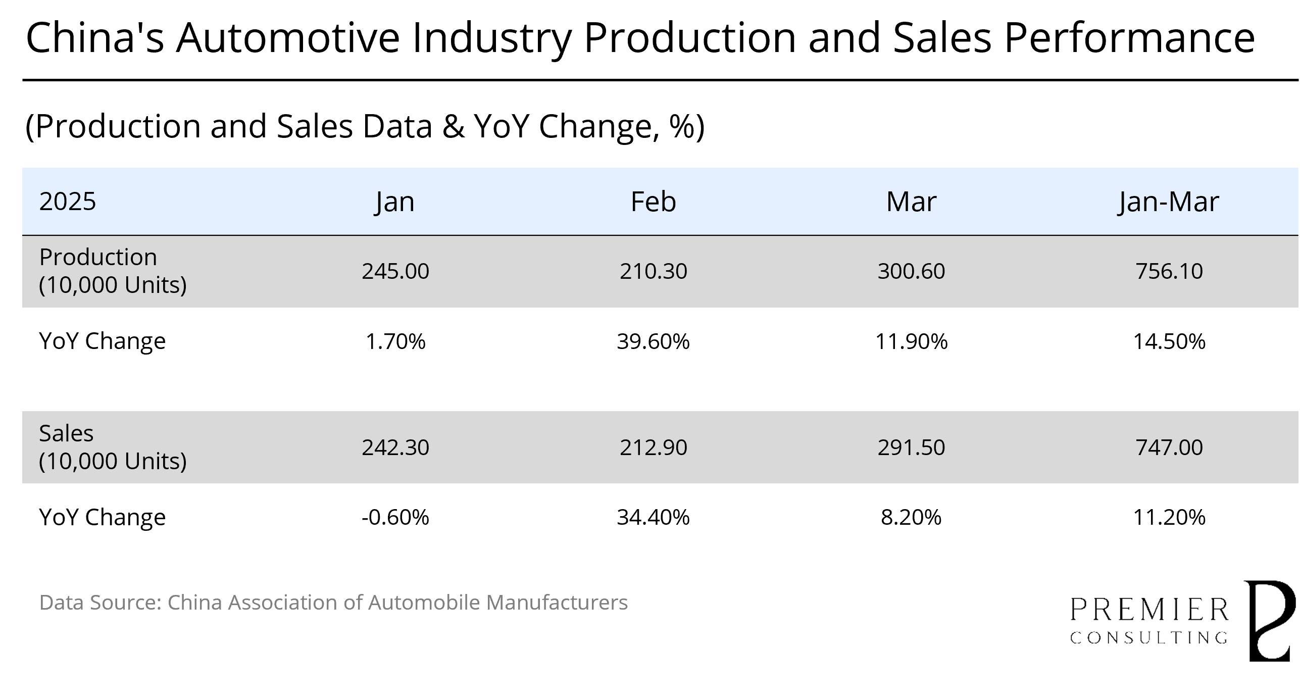 From January to March 2025, China’s automotive production and sales reached 7.561 million and 7.470 million units respectively, representing year-on-year growth of 14.5% and 11.2%. Compared to the January–February period, the growth rates for production and sales narrowed by 1.7 and 1.9 percentage points, respectively. In March alone, automotive production and sales totaled 3.006 million and 2.915 million units, achieving month-on-month increases of 42.9% and 37.0%, and year-on-year growth of 11.9% and 8.2%, respectively.