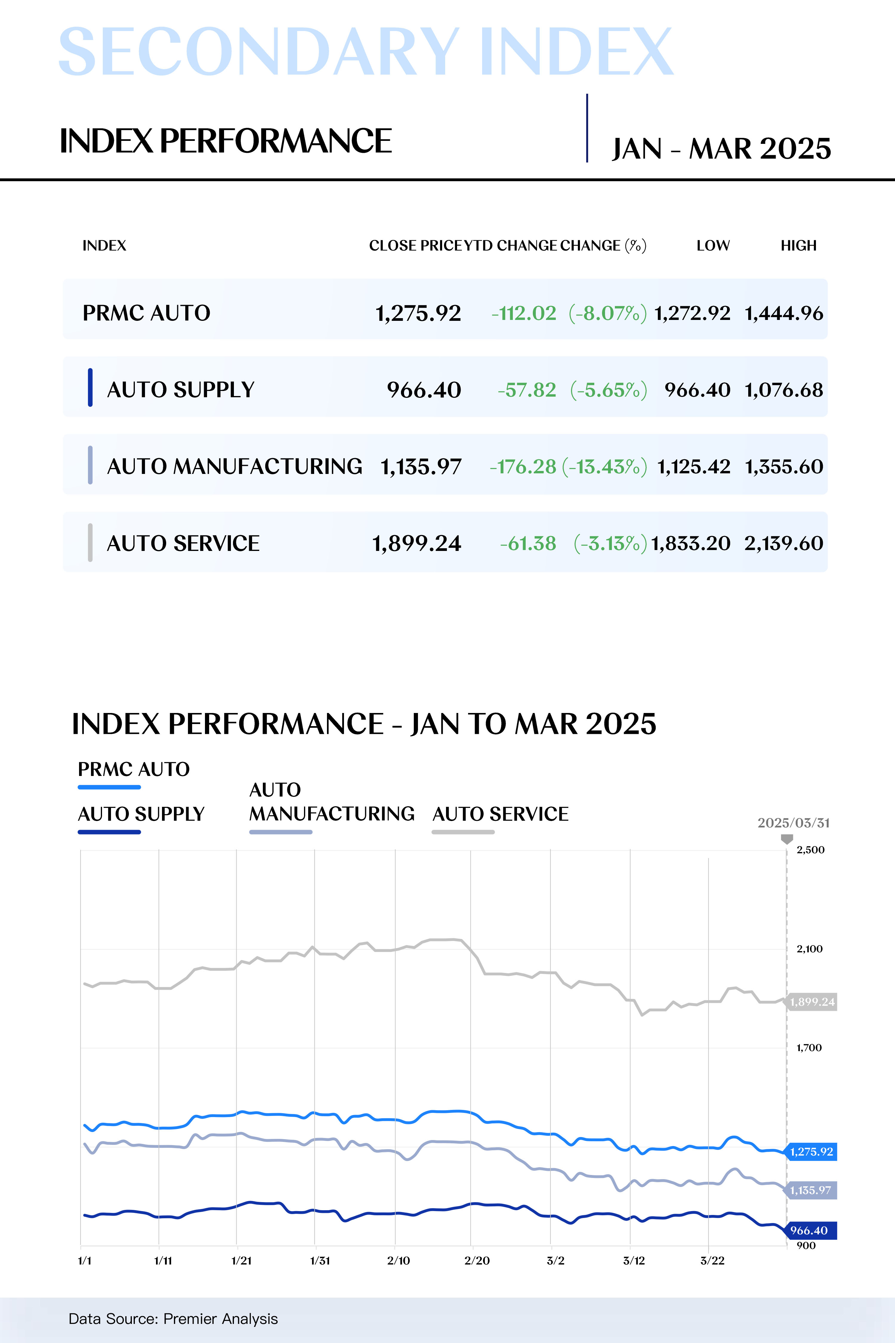 The PRMC Auto Index closed at 1,275.73 points in Q1, declining by 111.13 points (-8.01%), underperforming key global indices such as the NASDAQ Composite, STAR & CHINEXT 50, STOXX Europe 600 Technology, and Hang Seng Tech. Among the secondary indices, the Auto Manufacturing Index recorded the largest drop (-13.43%), followed by the Auto Supply Index (-5.65%), while the Auto Service Index proved more resilient (-3.13%).