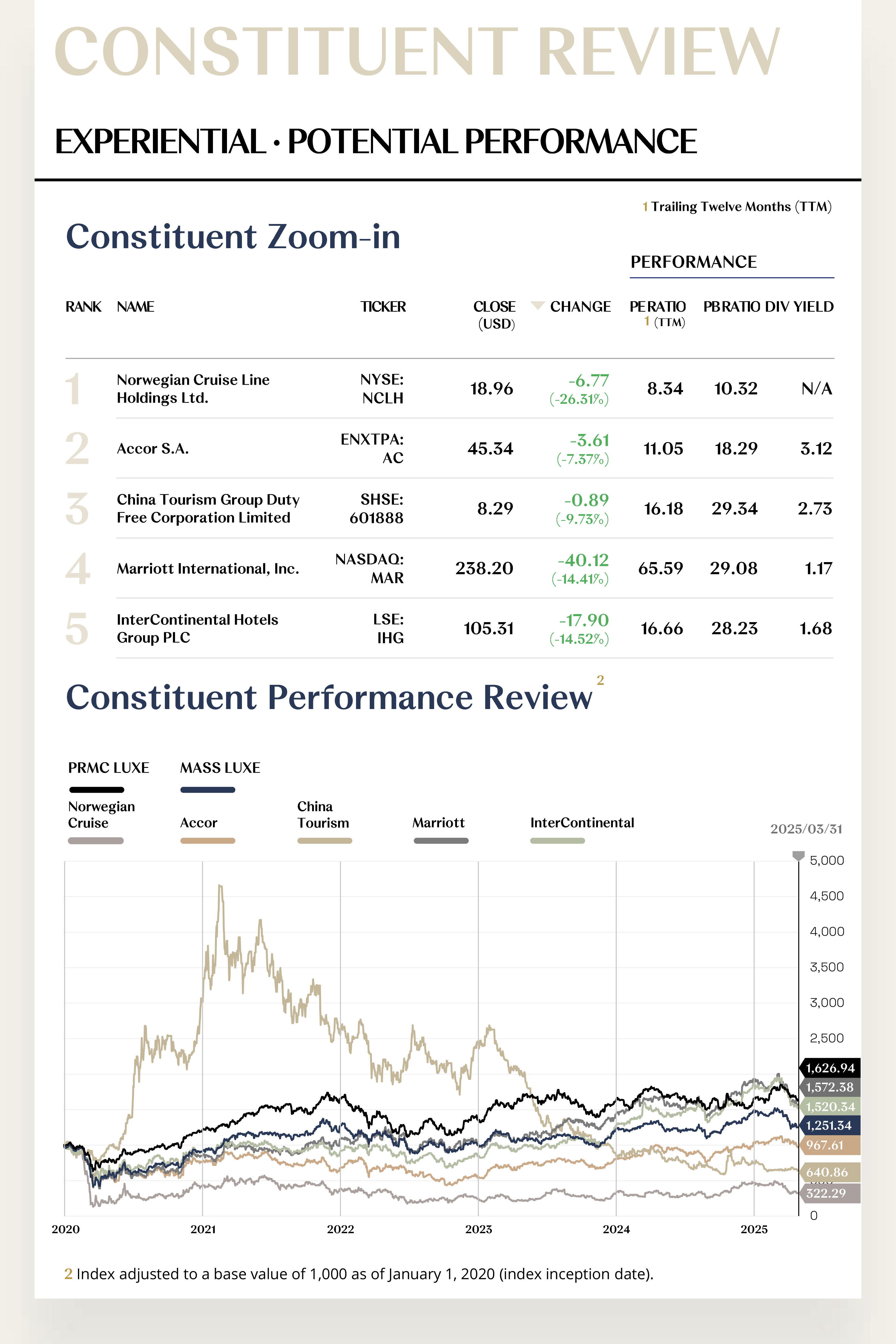 The Experiential Luxe Index closed at 1,251.34 points, down 183.58 points or 12.79%, marking the largest decline among secondary indices in Q1. The Experiential Luxe sector had previously benefited from the global tourism recovery and the deepening trend of experiential consumption, showing strong performance. However, since February 2025, rising global geopolitical tensions, coupled with escalating international trade friction, particularly affecting shipping and cross-border travel, have had a direct negative impact on high-experience service industries such as hotels and cruises. This has significantly dampened investor sentiment and triggered a sharp decline in the index. Looking ahead to Q2, although market confidence will take time to recover, the Experiential Luxe Index is expected to enter a period of stabilization and gradual recovery, supported by the ongoing recovery in experiential consumption.