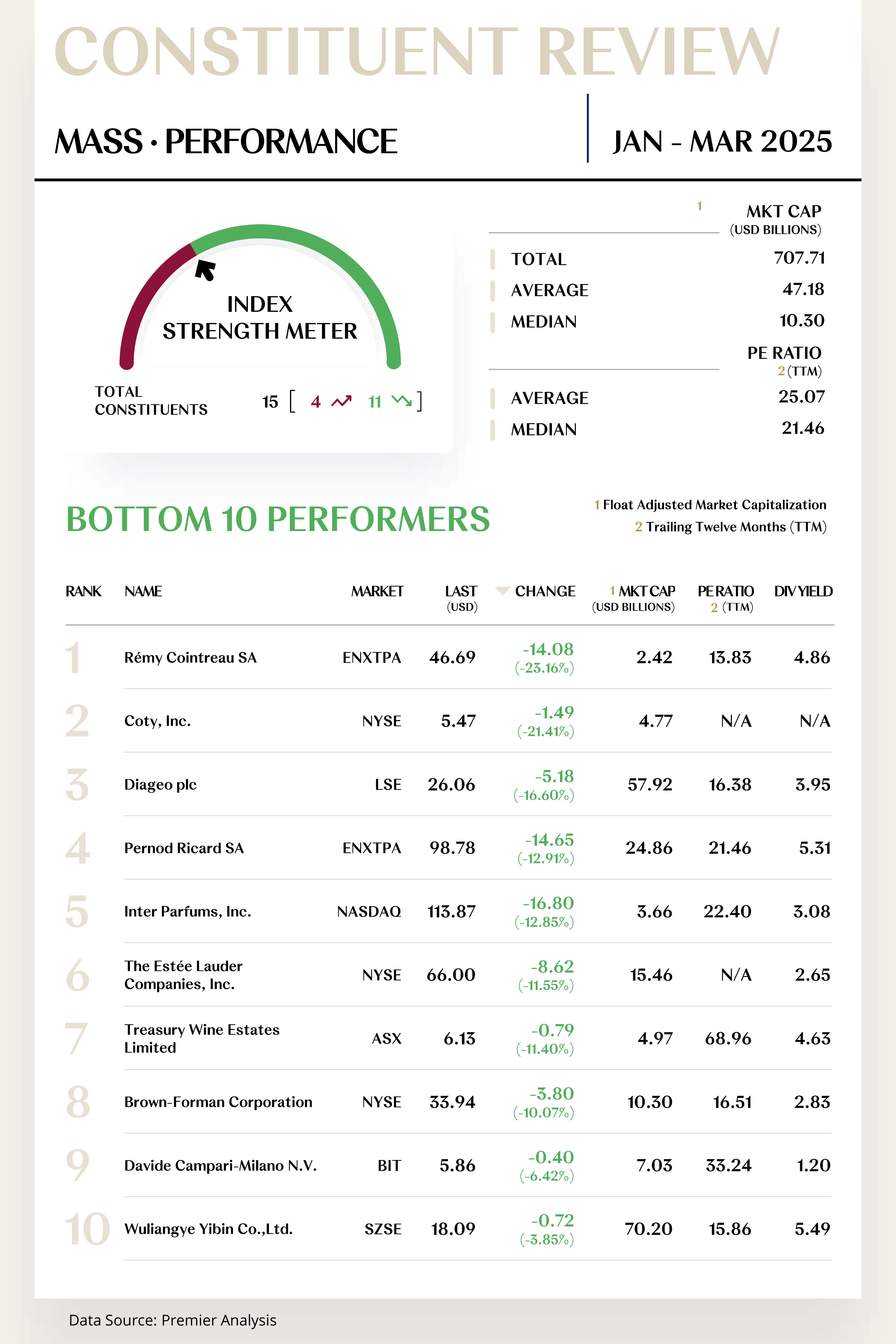 The Mass Luxe Index comprises 15 stocks, with 4 rising and 11 falling.