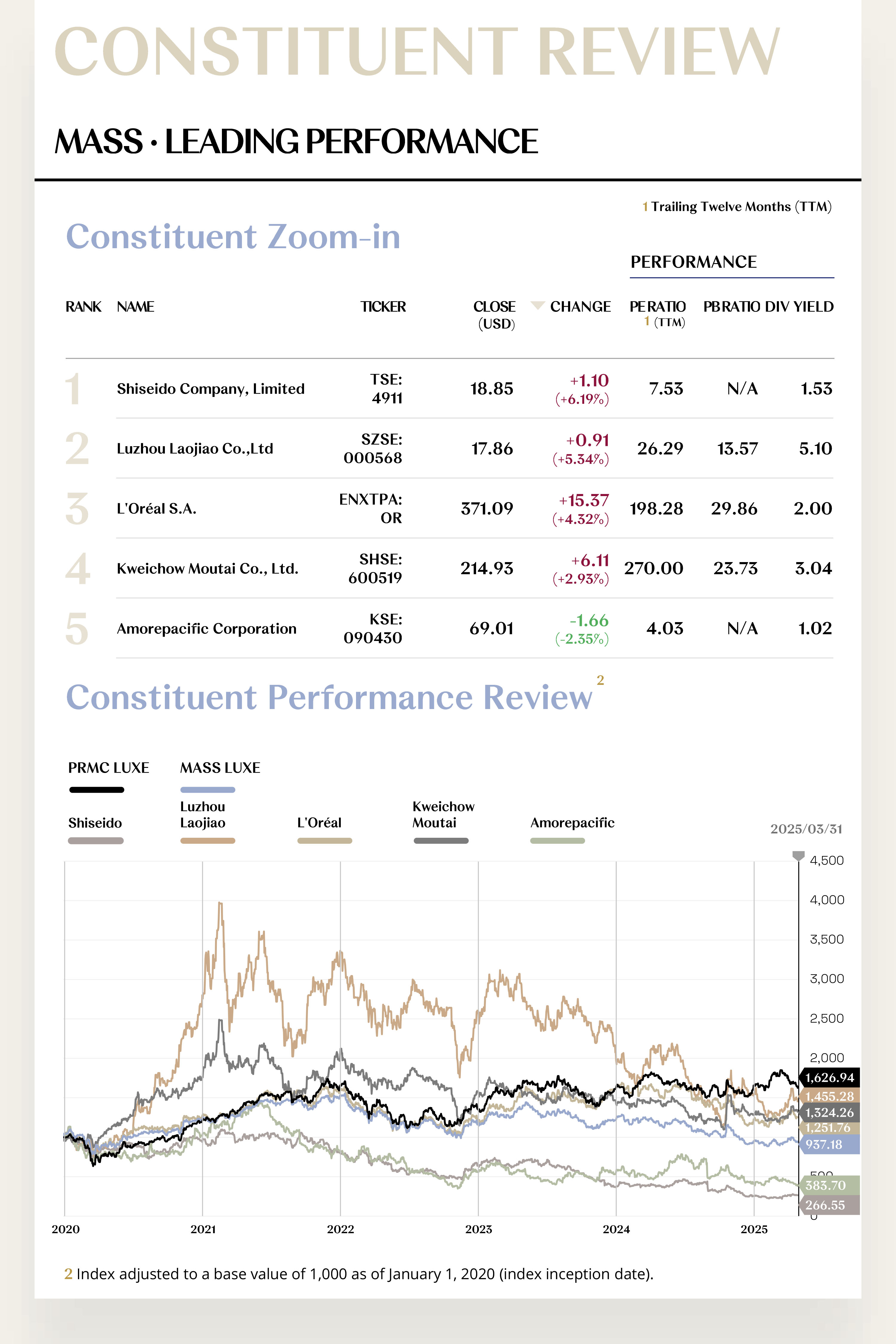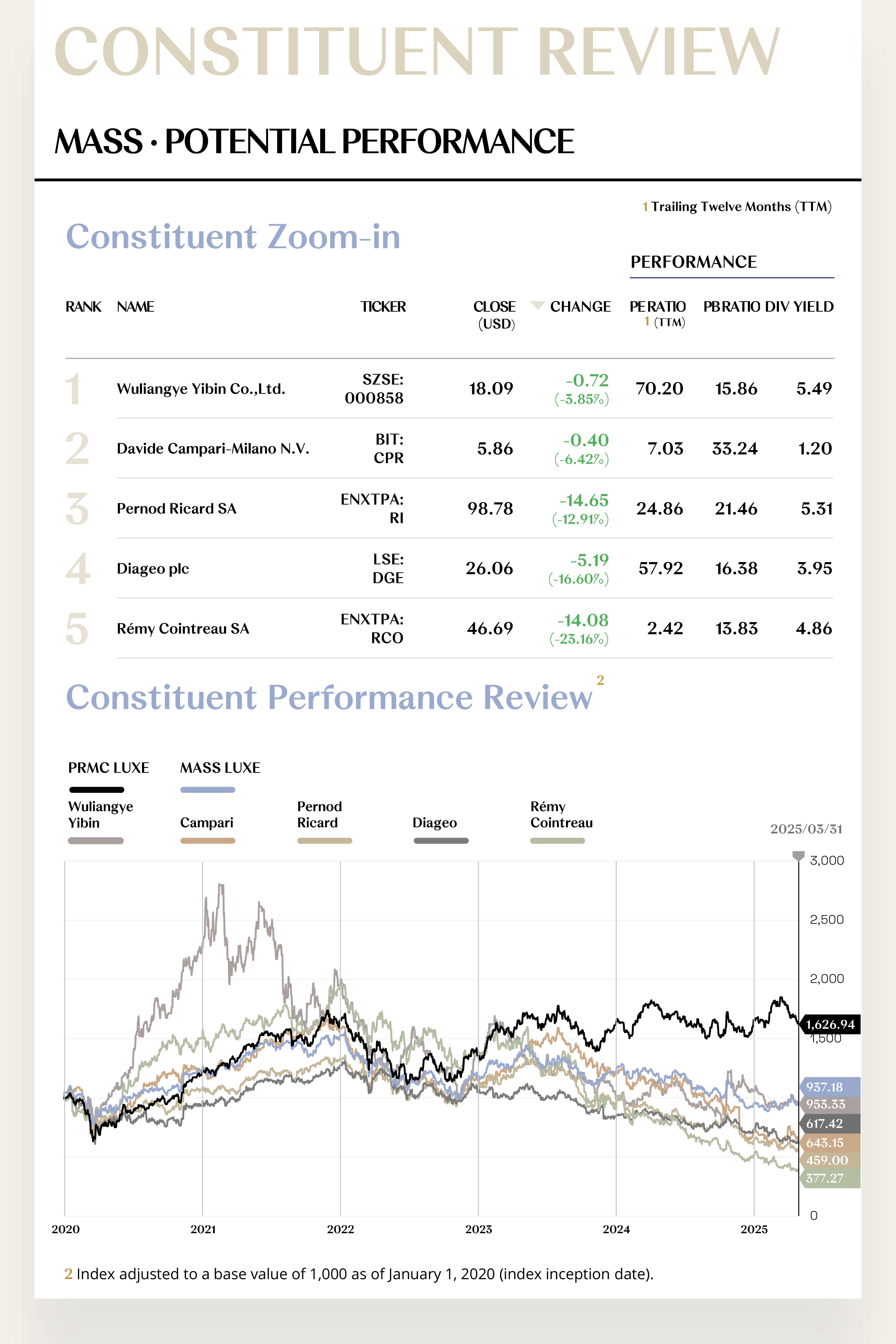 The PRMC Luxe Index closed the first quarter at 1,626.94 points, declining by 22.44 points (-1.36%) over the period. Its performance lagged behind the MSCI ASIA PACIFIC and EURO STOXX 100 indices but outperformed major global benchmarks such as the MSCI ACWI and S&P 500. At the sub-index level, the Core Luxe Index (+2.05%) recorded a counter-trend increase, the Mass Luxe Index (+0.65%) remained stable, the Ultra Luxe Index (-4.10%) edged lower, while the Experiential Luxe Index (-12.79%) saw a notable retreat.