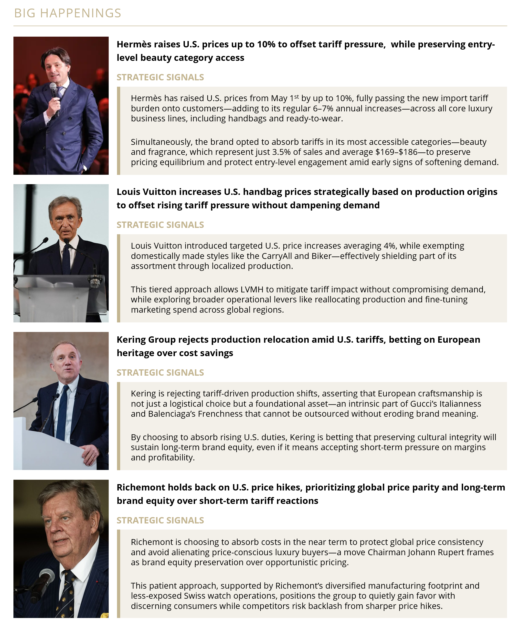 Navigating intensified geopolitical pressures and tariff volatility, luxury houses prioritize pricing prudence over sweeping increases. By selectively calibrating price points, reassessing supply chain tactics, and absorbing targeted costs, brands sustain consumer trust, desirability, and profitability. This deliberate, trust-aligned pricing discipline underscores strategic resilience amid turbulent market dynamics.