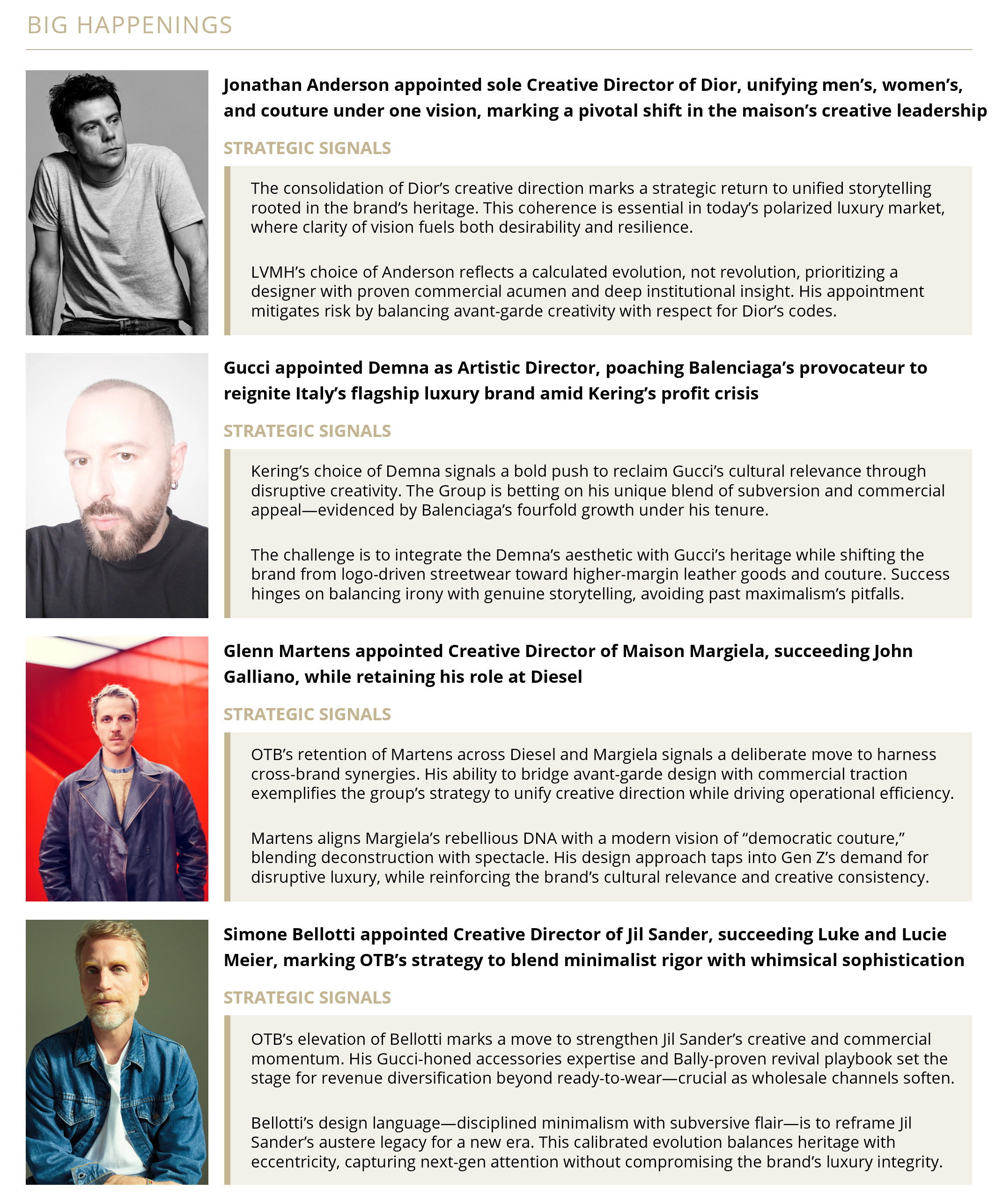 Amid evolving market conditions, luxury brands strategically refresh creative leadership to balance innovation with intrinsic brand heritage. These calibrated appointments—focused on continuity yet infused with new vision—revitalize maison desirability and resonance. Such controlled renewal positions brands for revitalized market traction without sacrificing historical DNA or institutional coherence.