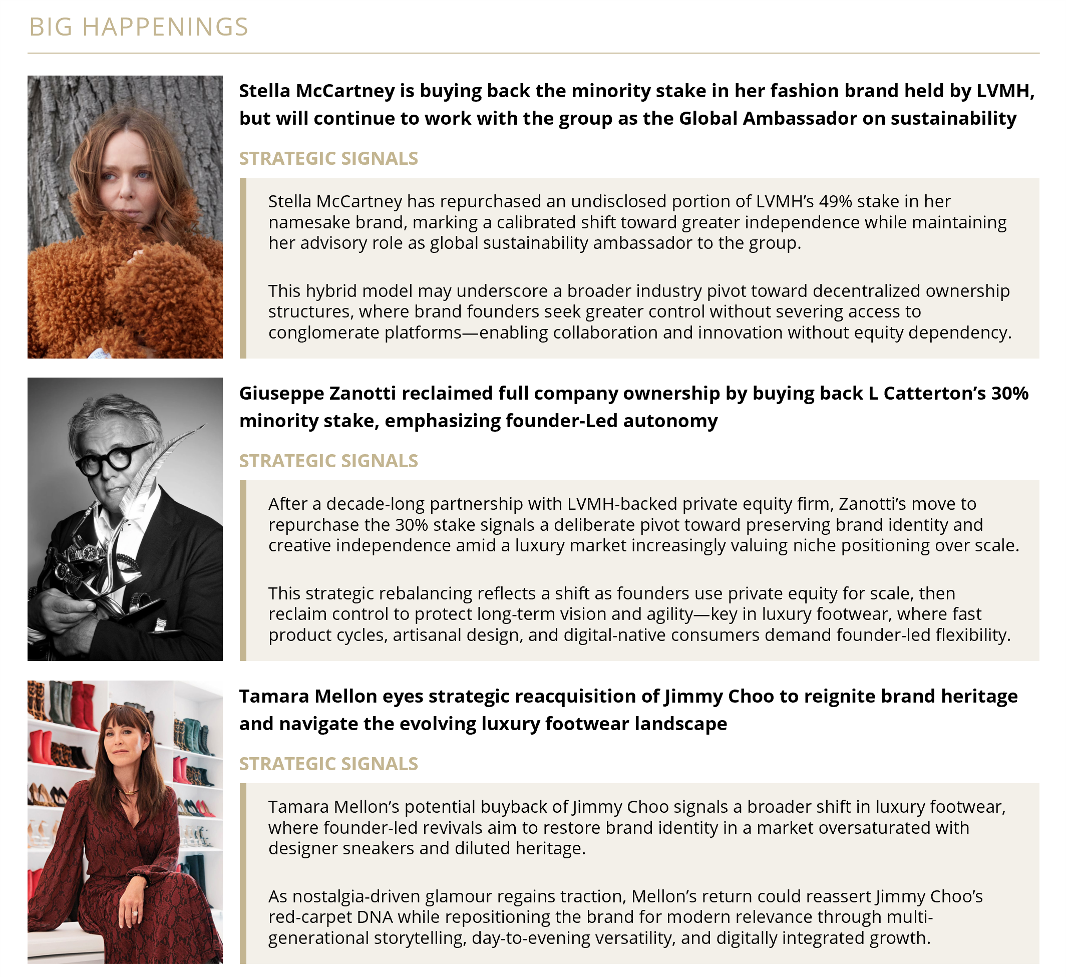 At the same time, founders are stepping back in—reclaiming equity stakes to preserve creative authorship and protect the soul of their brands, as scale, identity, and storytelling jostle for primacy in an evolving luxury landscape.