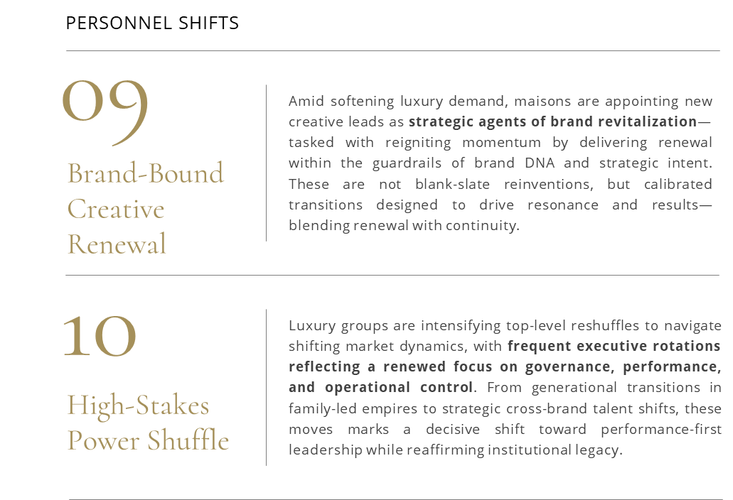 Heritage-led maisons such as Hermès and Chanel are set to deepen their investment in craftsmanship as a long-term anchor of brand value. Concurrently, Richemont will continue to elevate its focus on curating and narrating its savoir‑faire to convert artisanal mastery into enduring loyalty. Prada is expected to further amplify its “Made in Italy” identity as a core point of distinction, while groups like Kering stand at a pivotal juncture—tasked with demonstrating whether holistic reinvention can effectively counter market headwinds. LVMH, meanwhile, is to test whether family‑led centralization can leverage dynastic cohesion to sustain performance amid softening demand and external pressures.