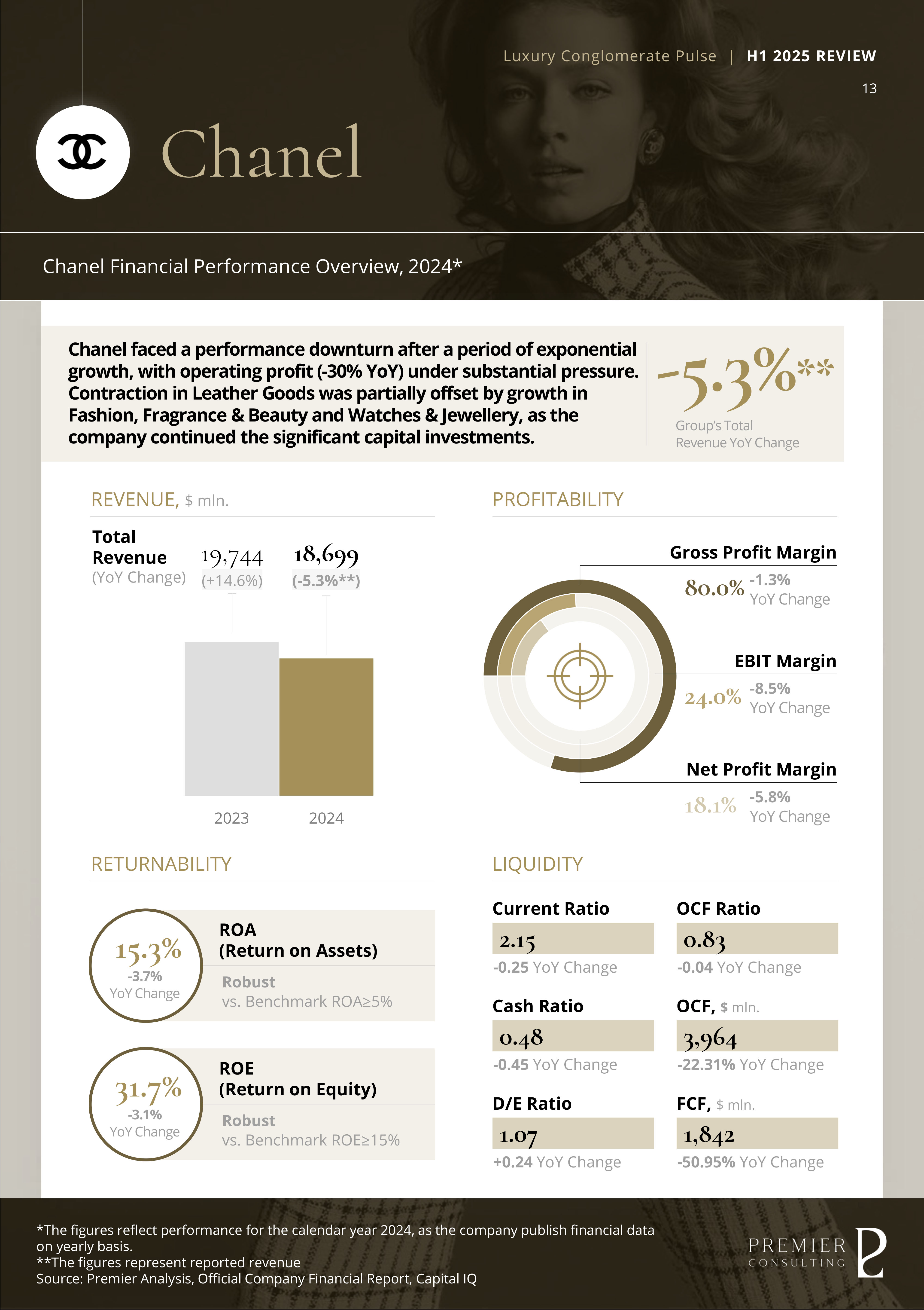 In 2024, the Group recorded its first simultaneous decline in both sales and profit, with operating income dropping nearly 30% year-on-year. Fragrance & Beauty and travel retail channels remained resilient, serving as key growth pillars amid the cyclical adjustment. Despite softening demand in the Chinese and American markets, the brand expanded capital expenditure to nearly $1.8 billion, advancing supply chain integration, boutique network expansion, and customer experience transformation — a clear demonstration of its steadfast commitment to long-term brand equity.