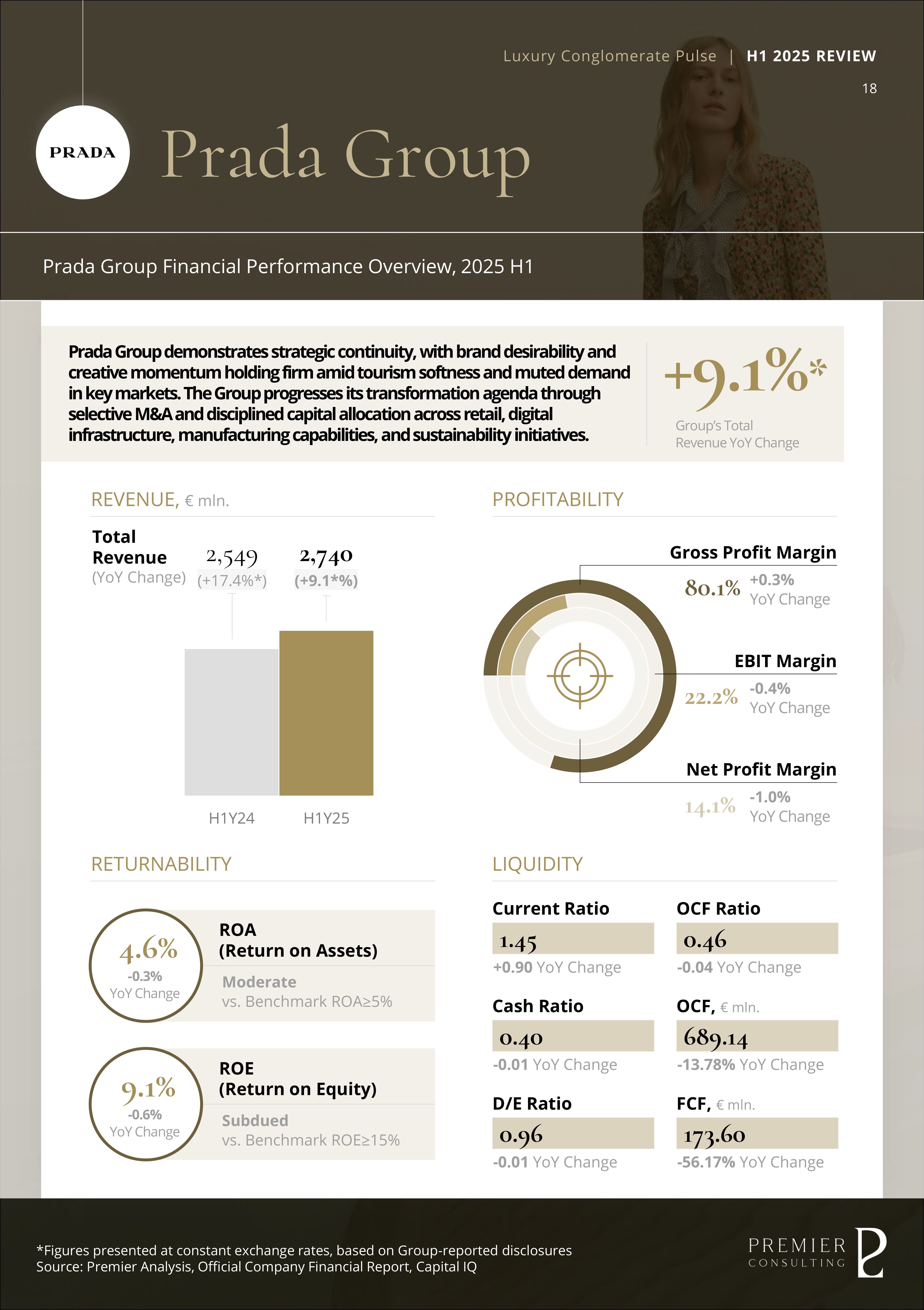Financial performance remained subdued, as a significant year-on-year sales decline in core brand Gucci weighed heavily on overall revenue. Segments such as beauty and eyewear sustained growth momentum, offering structural support amid broader weakness. Regional trends diverged, with downward pressure particularly pronounced in Asia. The Group accelerated its strategic overhaul, reshaping brand direction through leadership transitions and creative team renewals, while prioritizing cost discipline and channel rationalization to safeguard profitability.