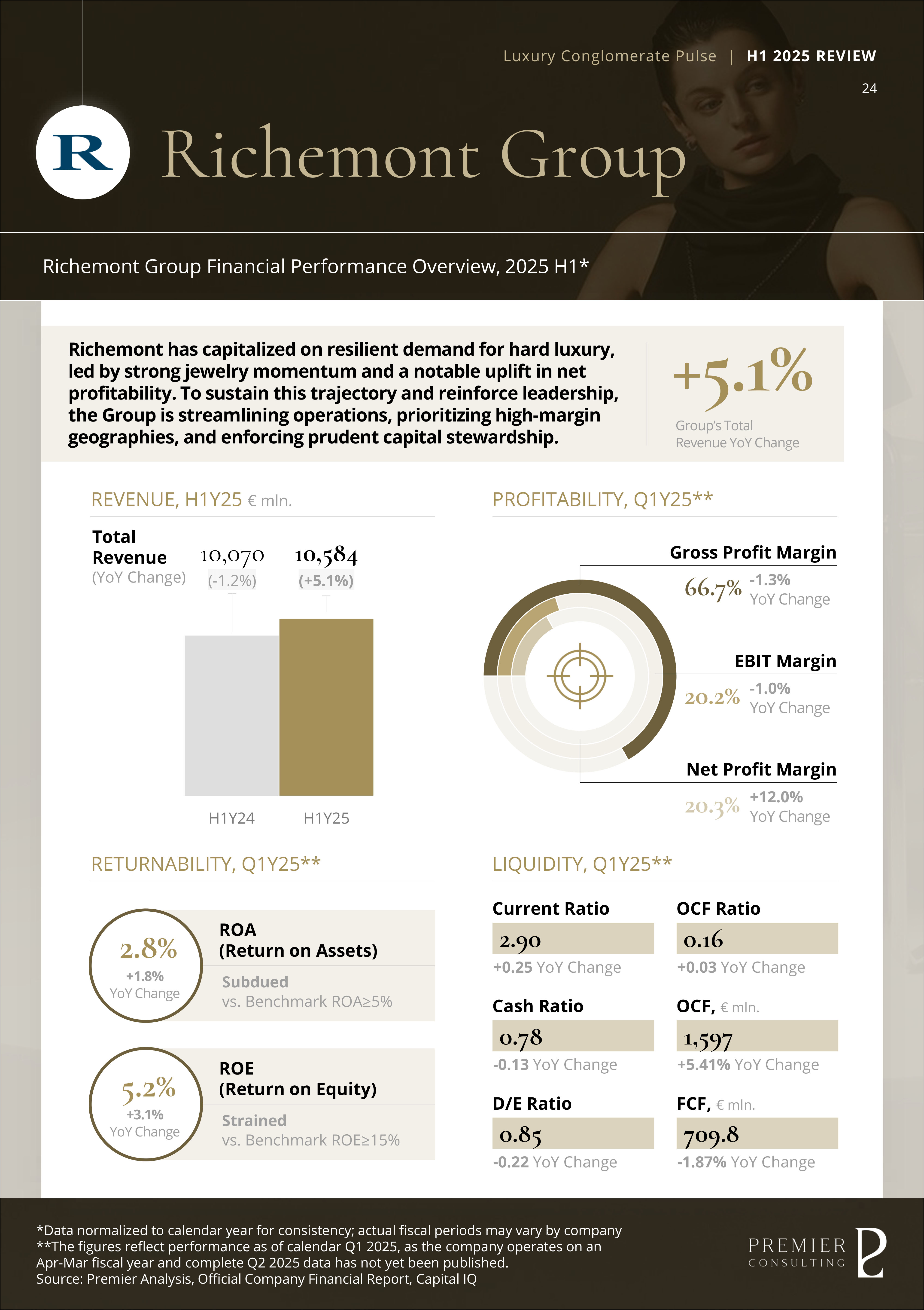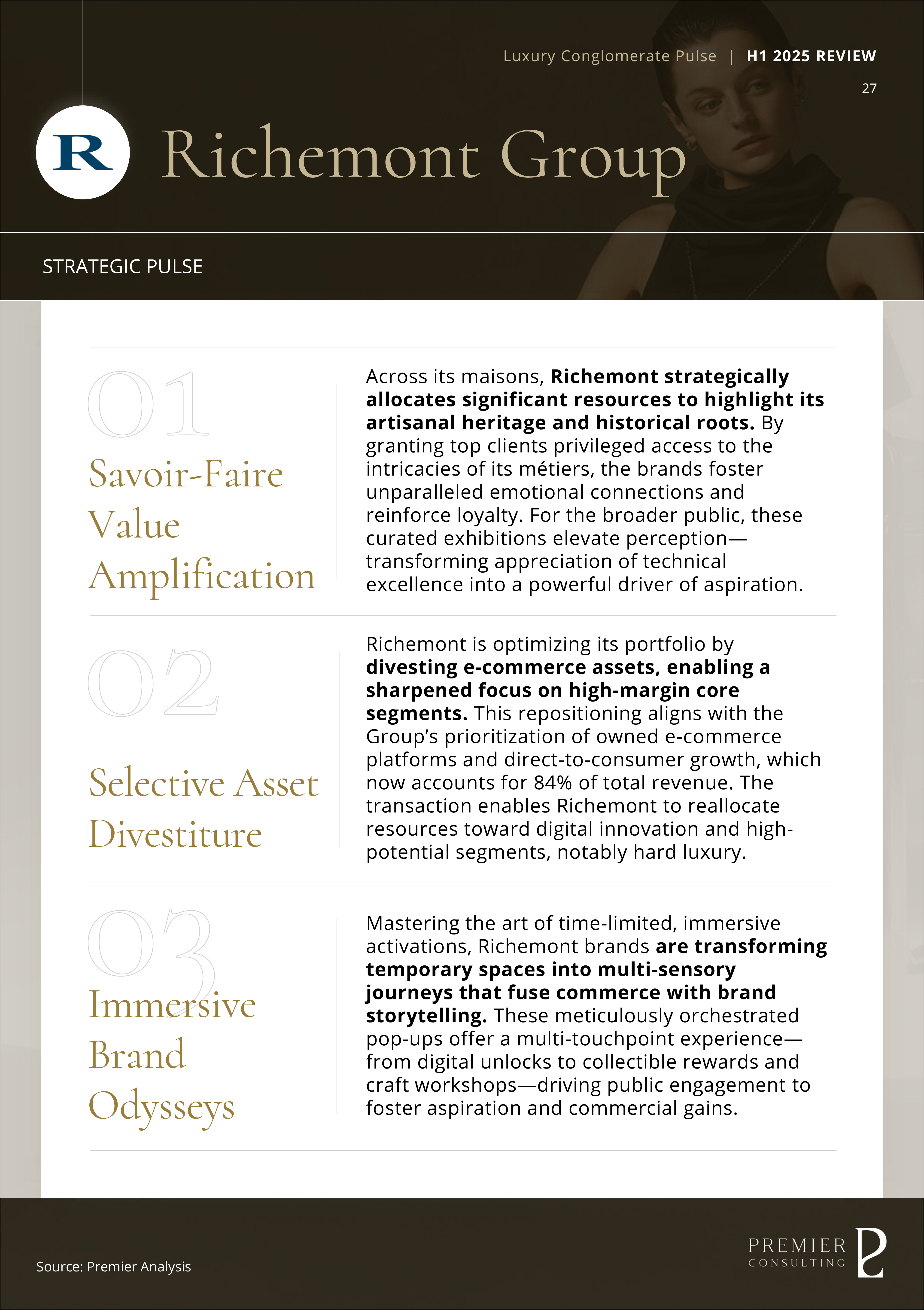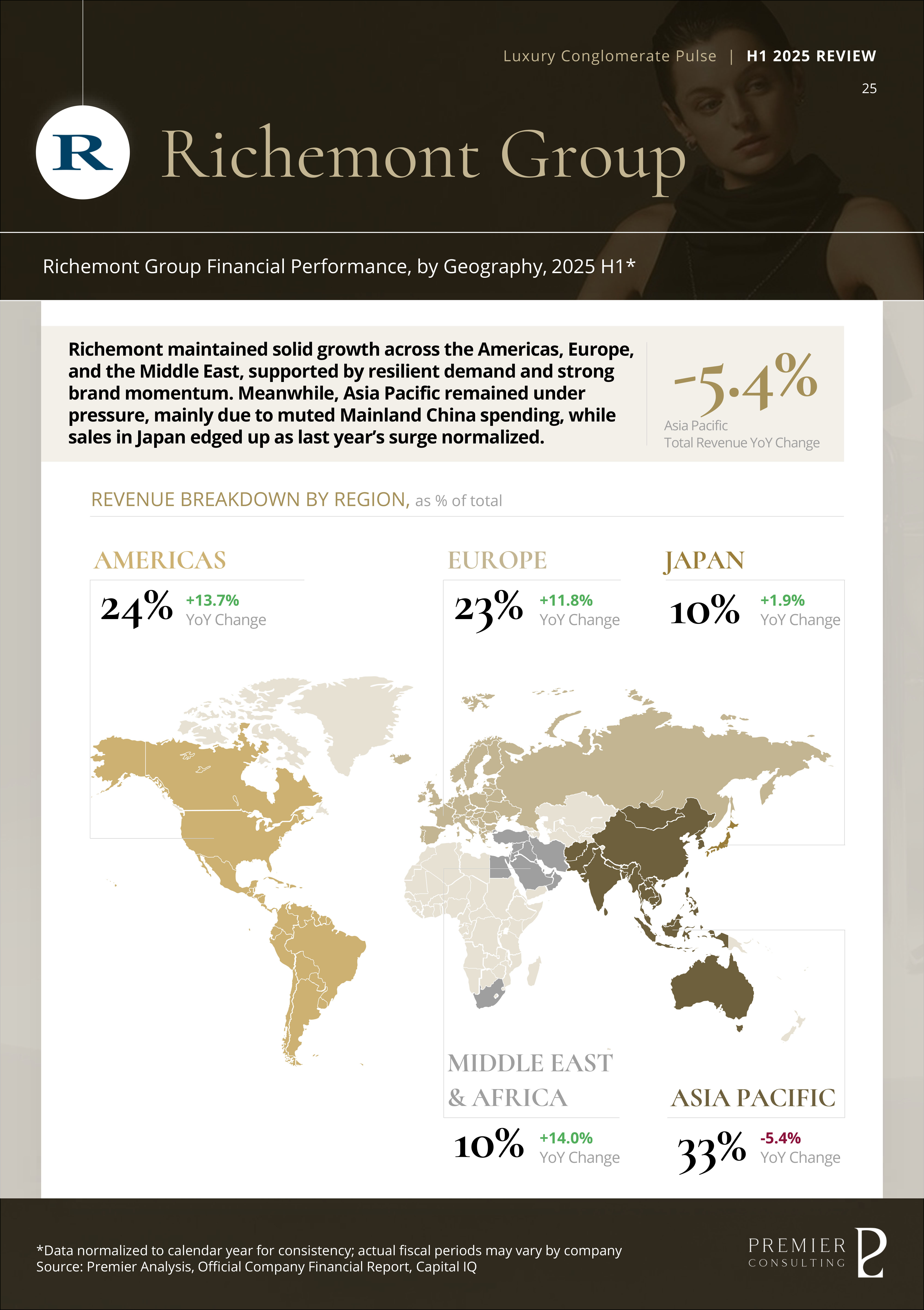 Revenue growth continued under the leadership of the Jewellery Maisons, while the Specialist Watchmakers segment entered a phase of transitional adjustment. Positive momentum persisted in Western markets, with Japan maintaining growth traction, though recovery in Greater China remained sluggish. By focusing on high-net-worth clientele, refining product value architecture, and recalibrating operational rhythms, the Group demonstrated resilience across cycles and a strong command of market dynamics.