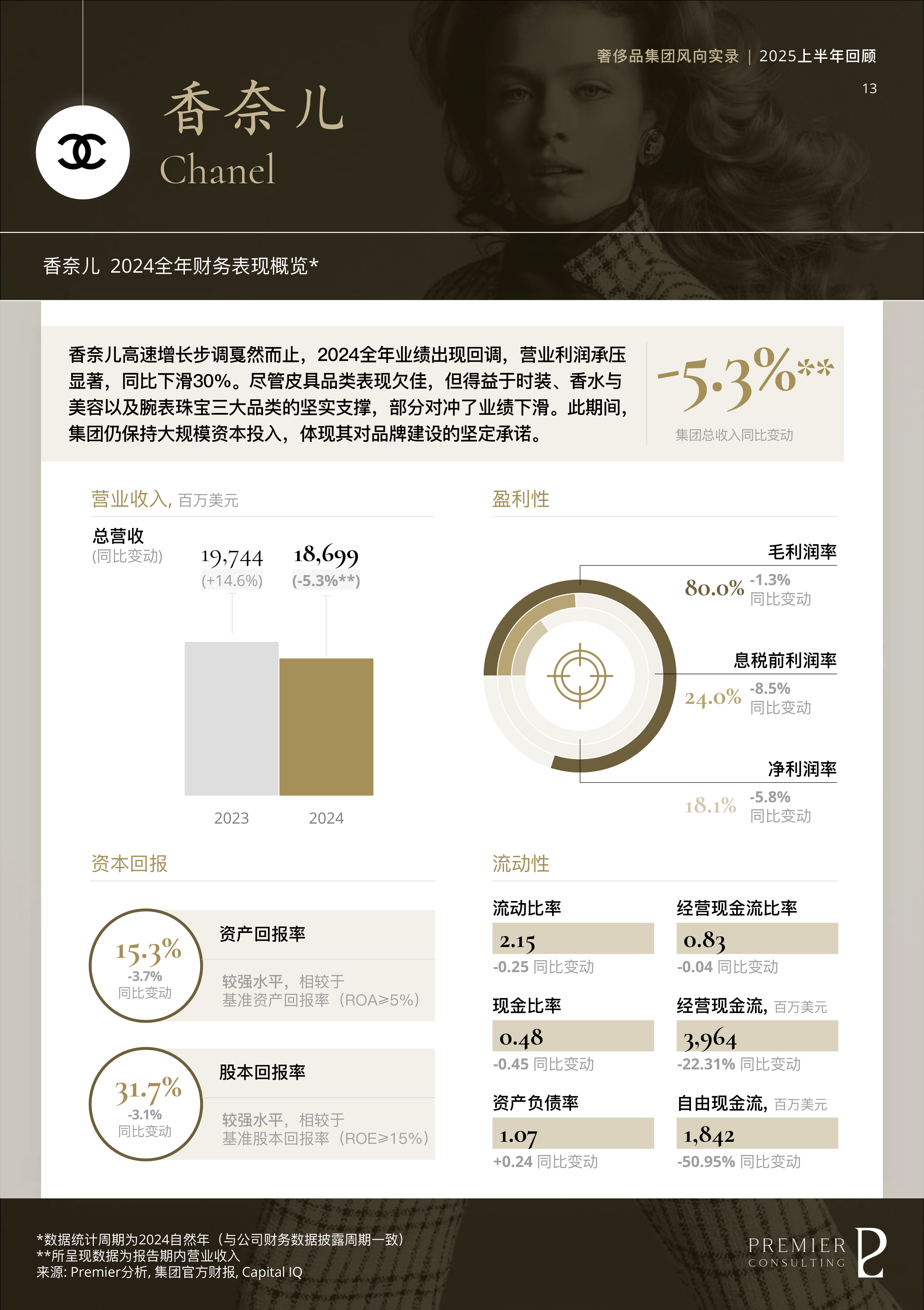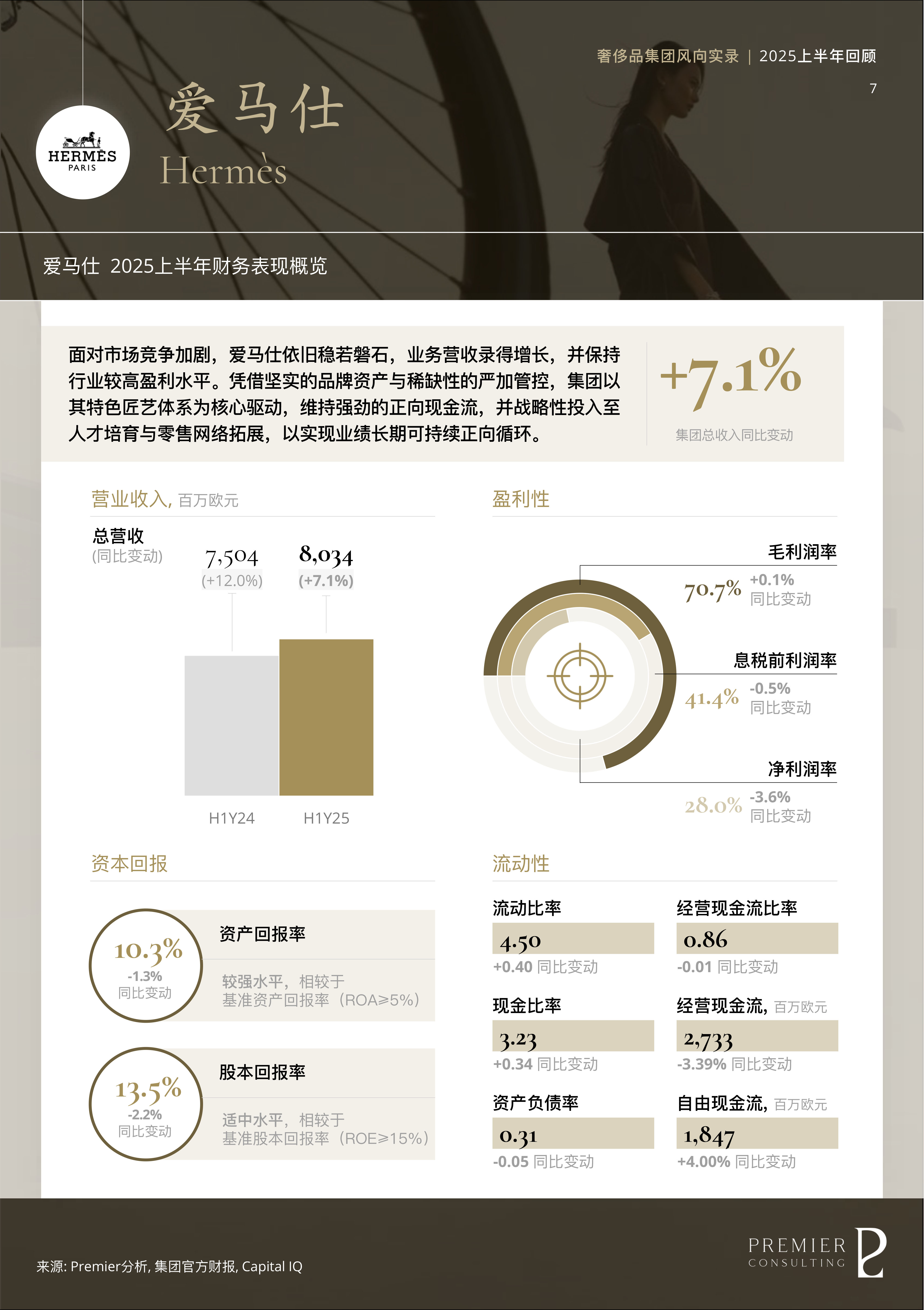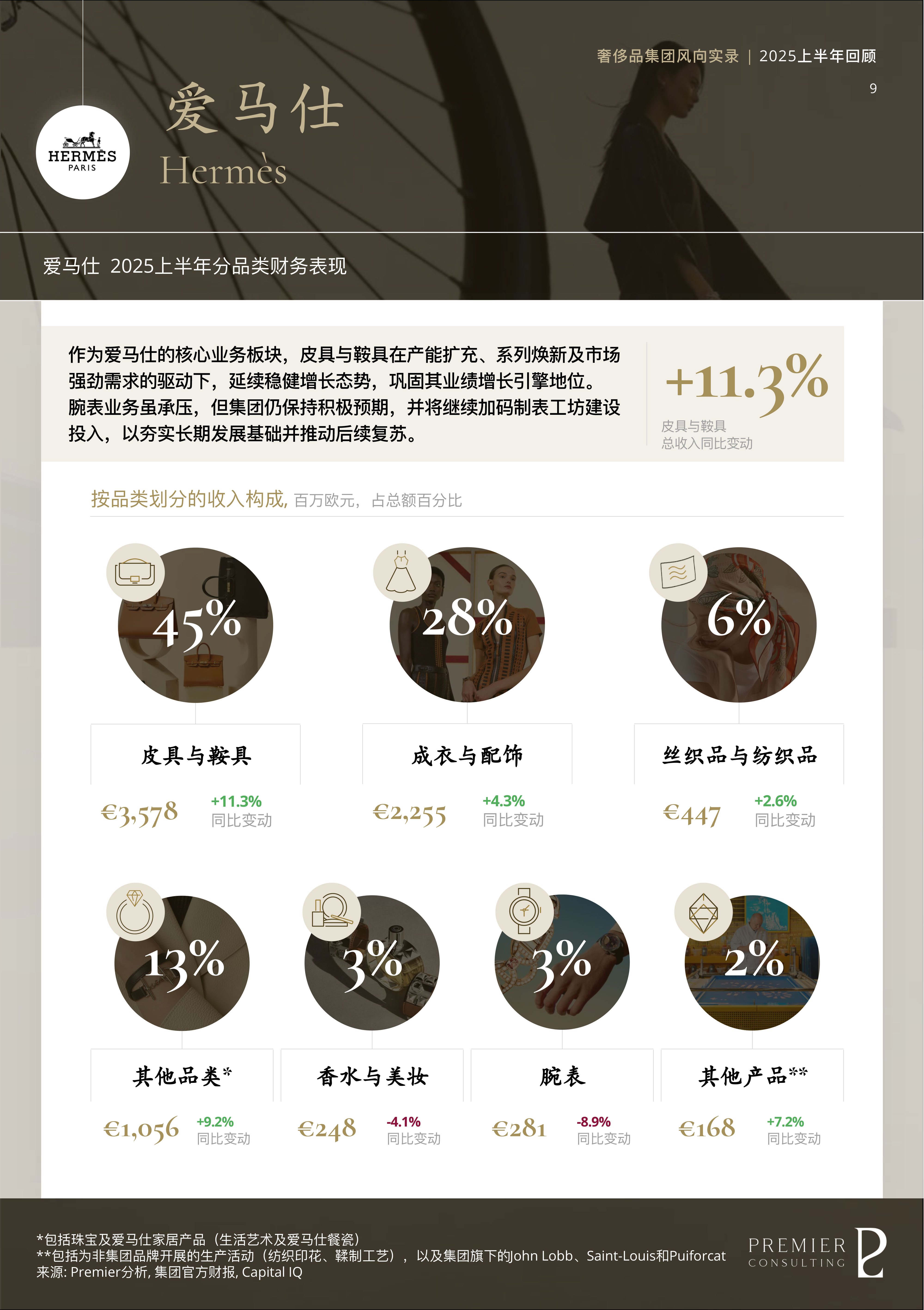 延续高势能增长轨道,营收与利润双双上扬,稳据行业首冕阵列。尽管中国市场滞增,品牌在美洲与中东展现强劲动能。集团通过节制产能扩张、聚焦核心品类与旗舰体验,维系其市值统御力与顶奢地位。
