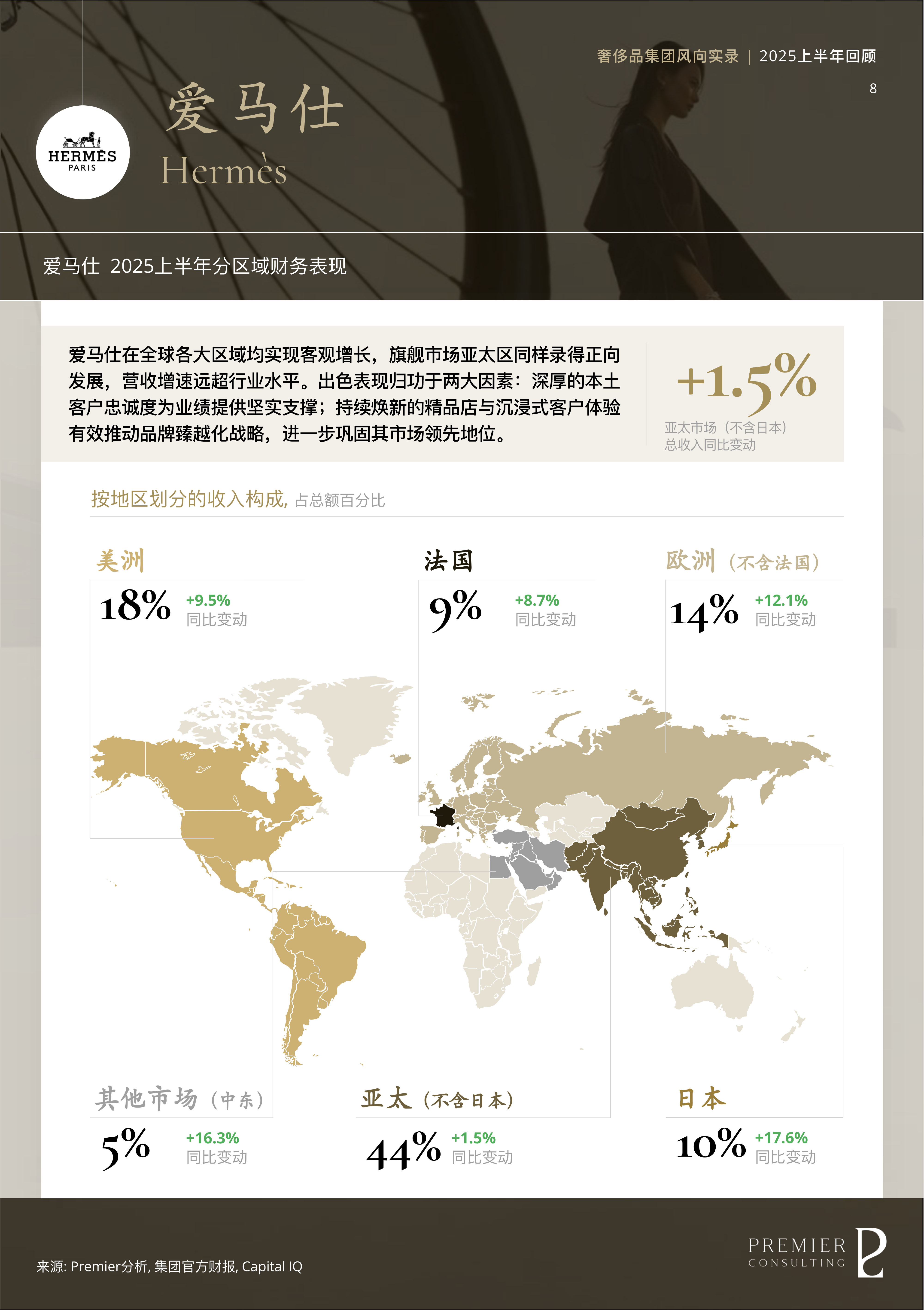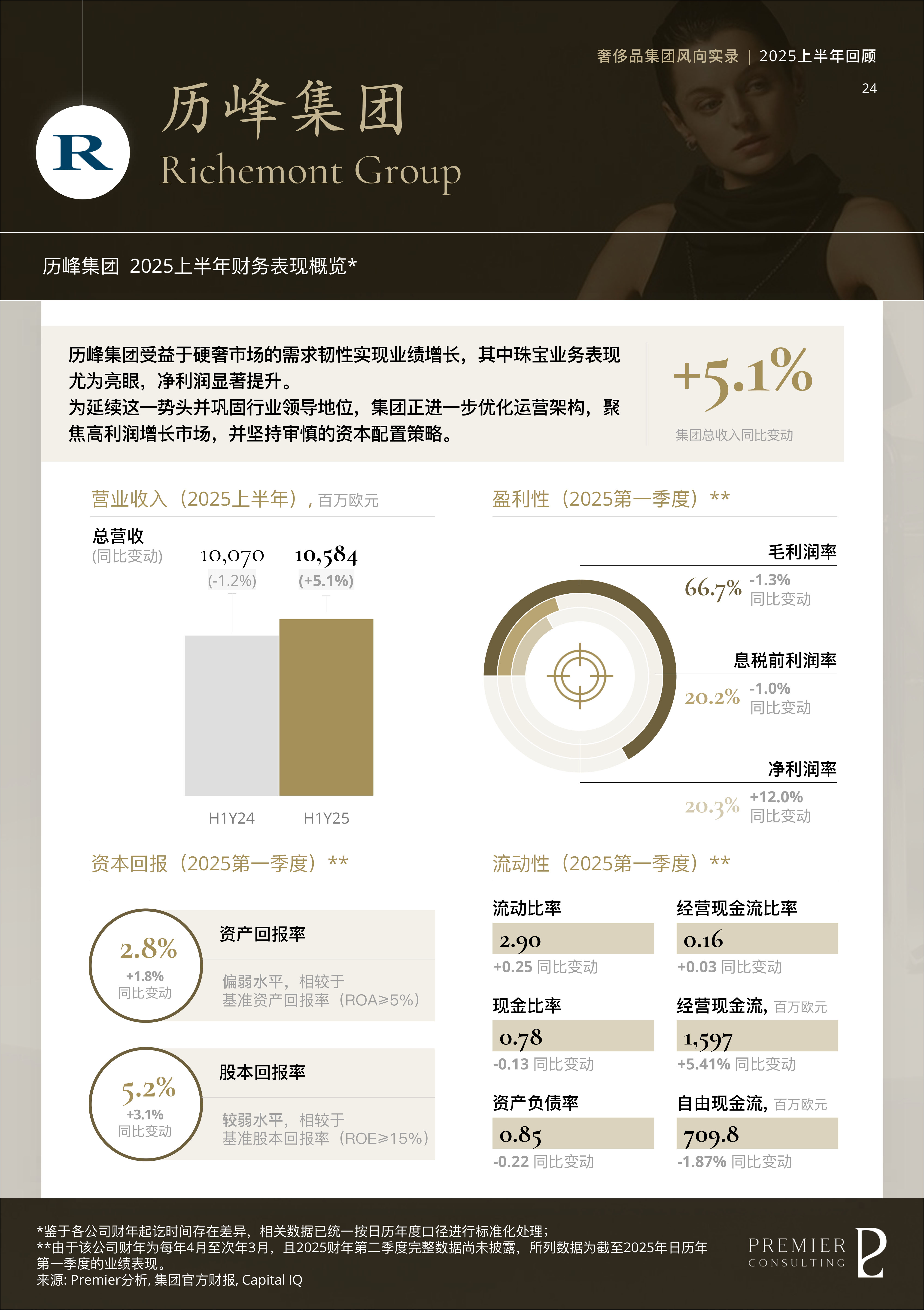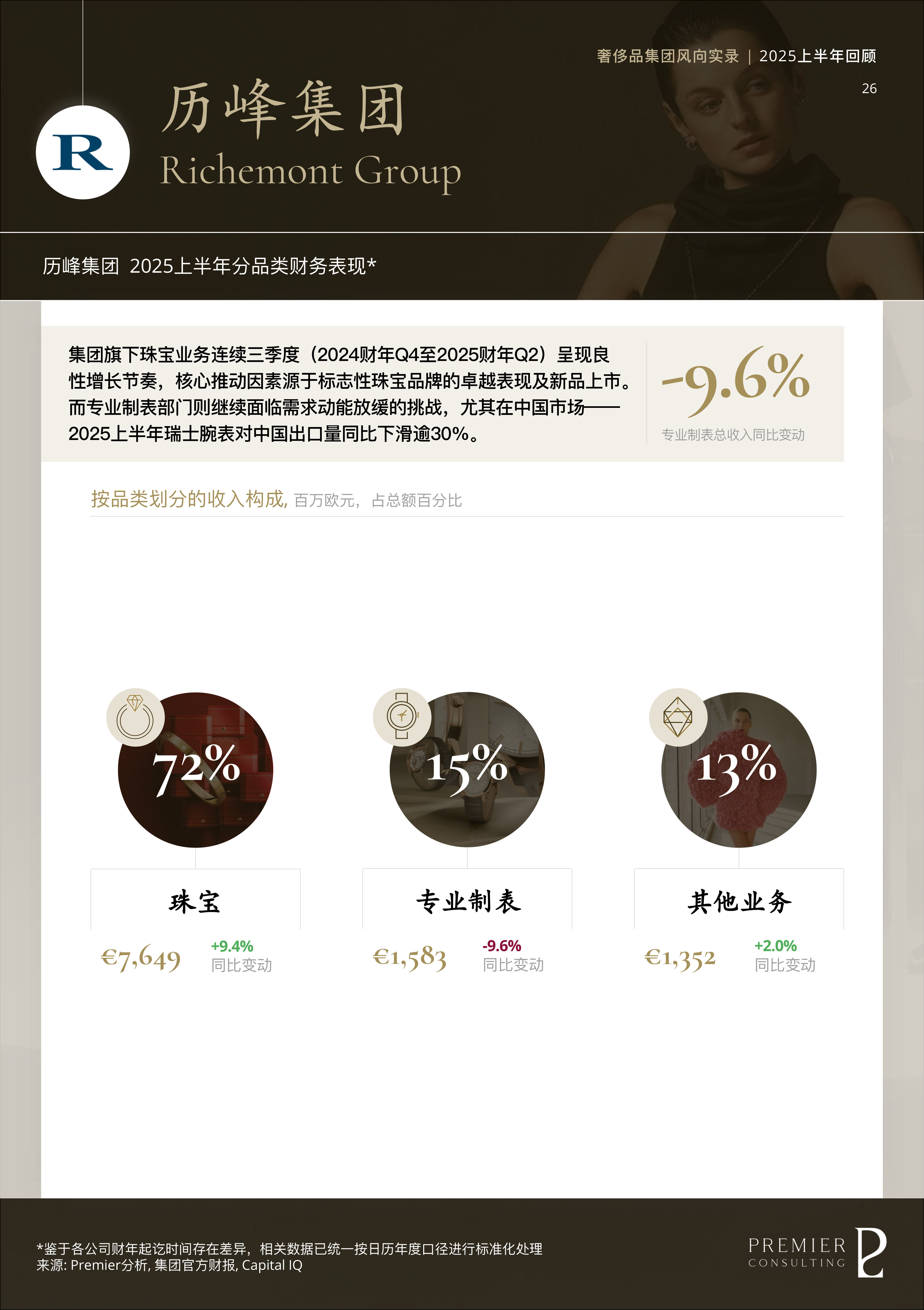 珠宝业务主导下延续营收增长,而专业制表业务面临阶段性调整。欧美市场延续积极态势,日本维持增长动能,大中华区复苏节奏仍显迟滞。集团通过聚焦高净值客群、调优产品价值结构与重塑运营节律,呈现抵御周期困圄的韧性与市场掌控力。
