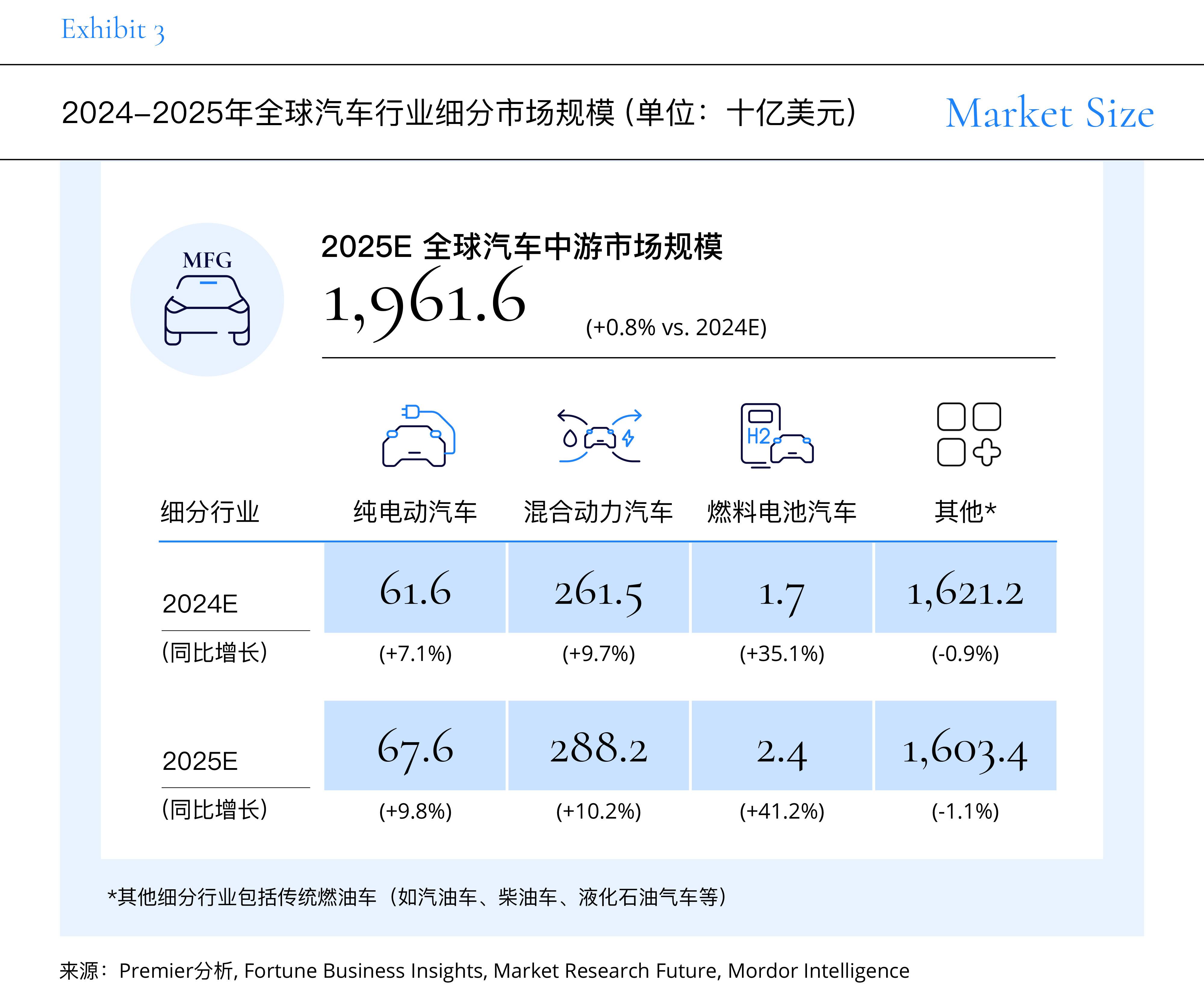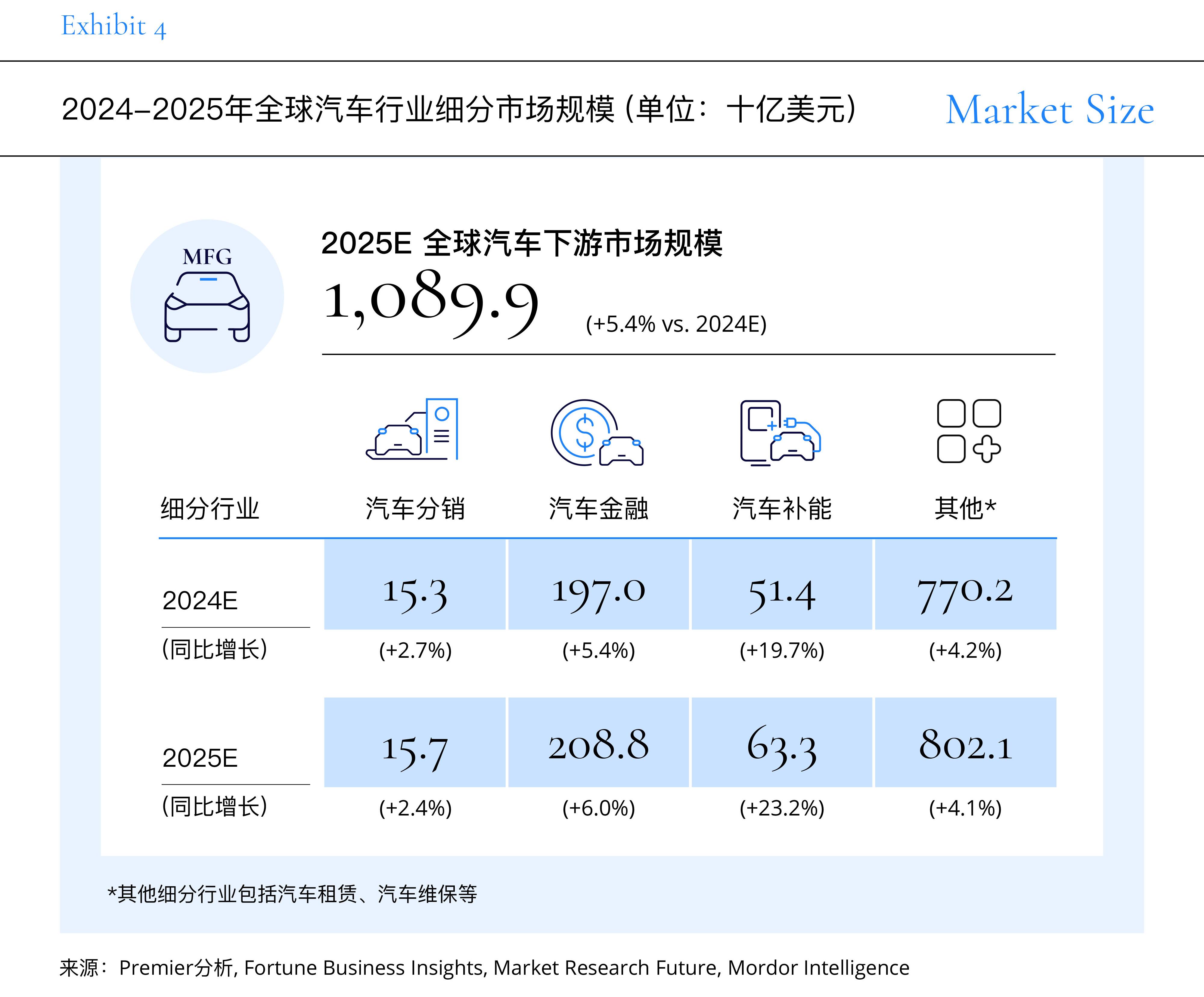 基于产业链划分观测,受原材料、车身零部件、动力电池行业的稳健发展,2025年上游市场规模预计达15,257亿美元,同比增长约3.3%。中游市场则受燃油车萎缩影响,预计仅增长0.8%至19,616亿美元。而下游市场则受益于补能行业的快速增长,市场规模达10,899亿美元,增长5.4%。