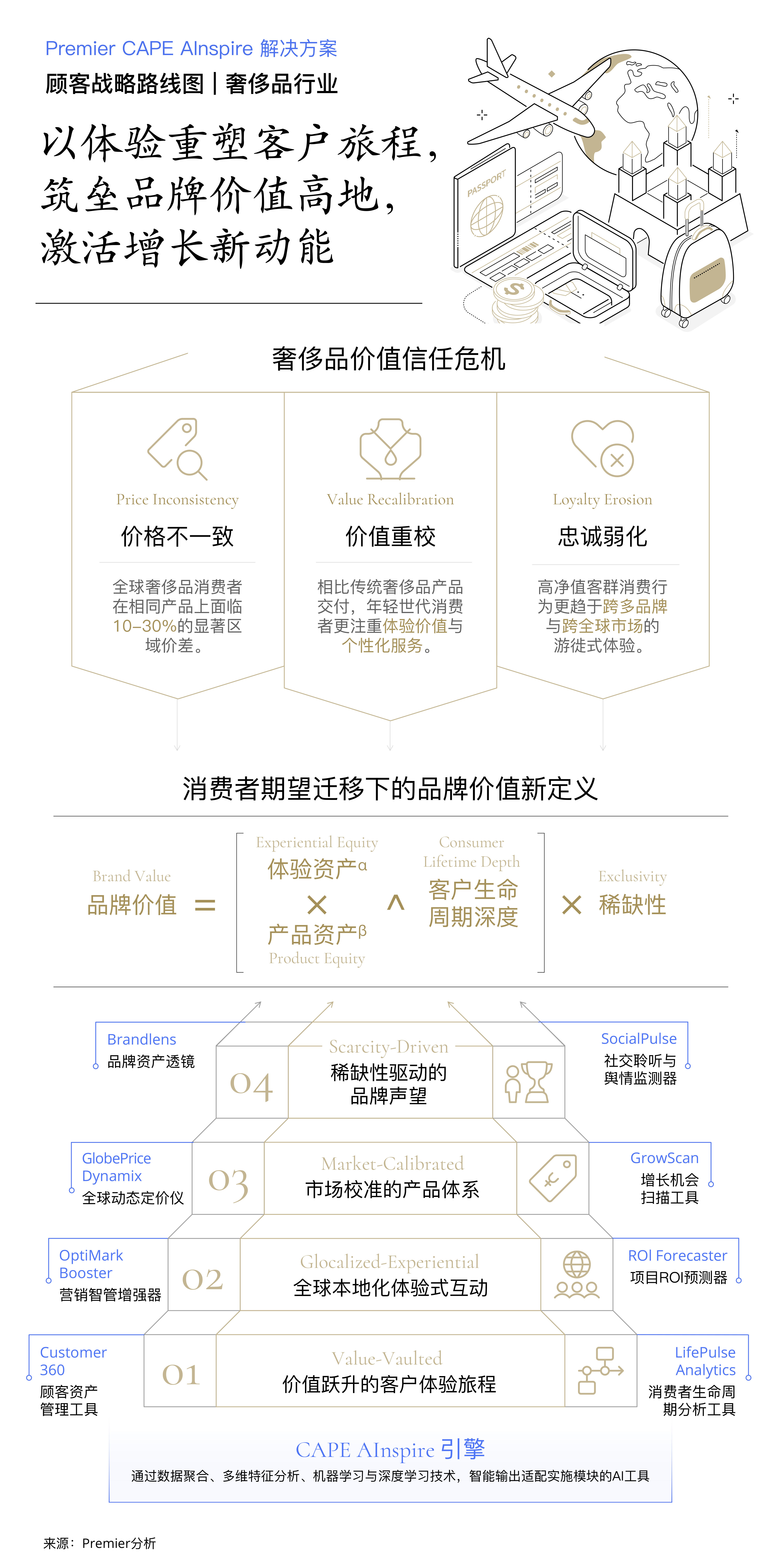 通过 CAPE AInspire 智能化解决方案,Premier助力品牌从消费者旅程优化、全球本地化精益运营、市场精准校准与品牌稀缺性塑造四大阶梯,拾级而上,实现品牌价值公式的臻实兑现。
