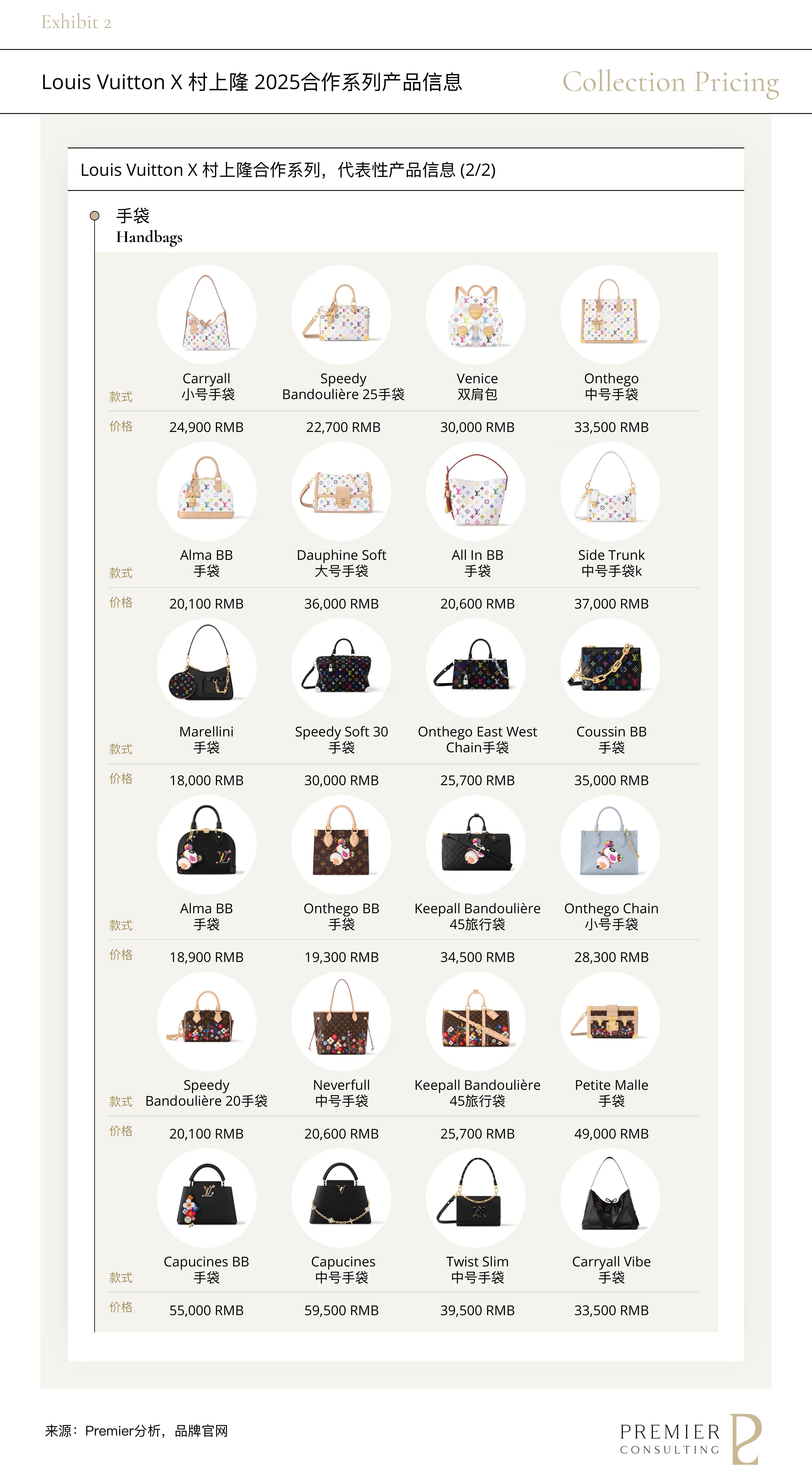 Premier研究统计,在品牌中国区官网发布的路易威登x村上隆合作系列中,单品定价低于15,000元的产品占比高达64%[Exhibit 1],其中5,000元以下的产品配置更超过50款。这一抽奖机制的设立,无疑大幅提升了入门级产品的购买率,推动消费者在原本的购物预算上增加投入。