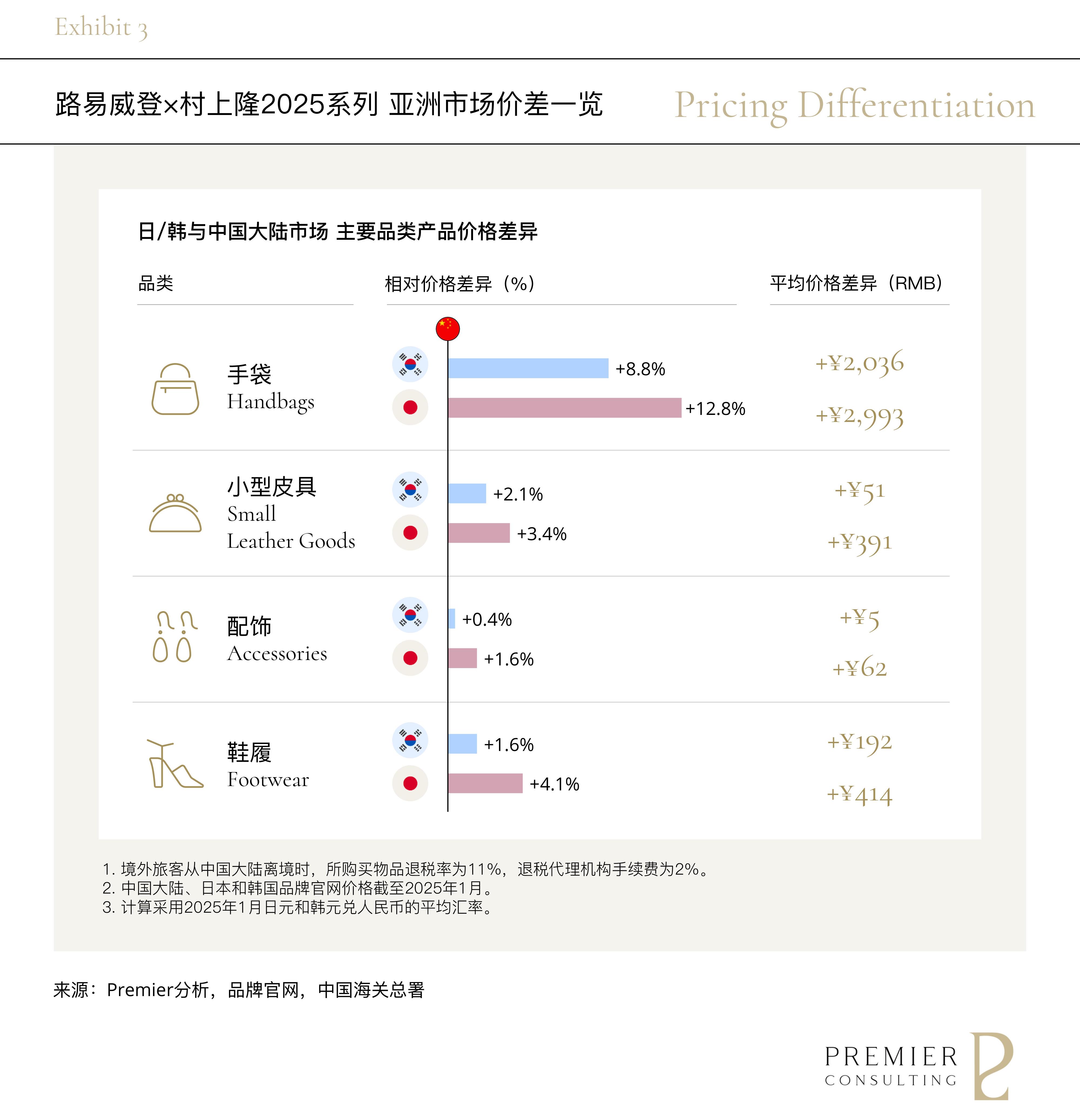 在亚洲市场格局中,路易威登 × 村上隆合作系列在韩国和日本的定价溢价明显。以手袋品类为例,韩国消费者在中国购买该系列,退税后价格较本国市场平均低8.8%,而日本消费者的价格优势更为显著,达12.8%[Exhibit 3]。与此同时,韩国路易威登官网的产品选择较为有限,进一步促使当地消费者转向更具吸引力的海外购物渠道。