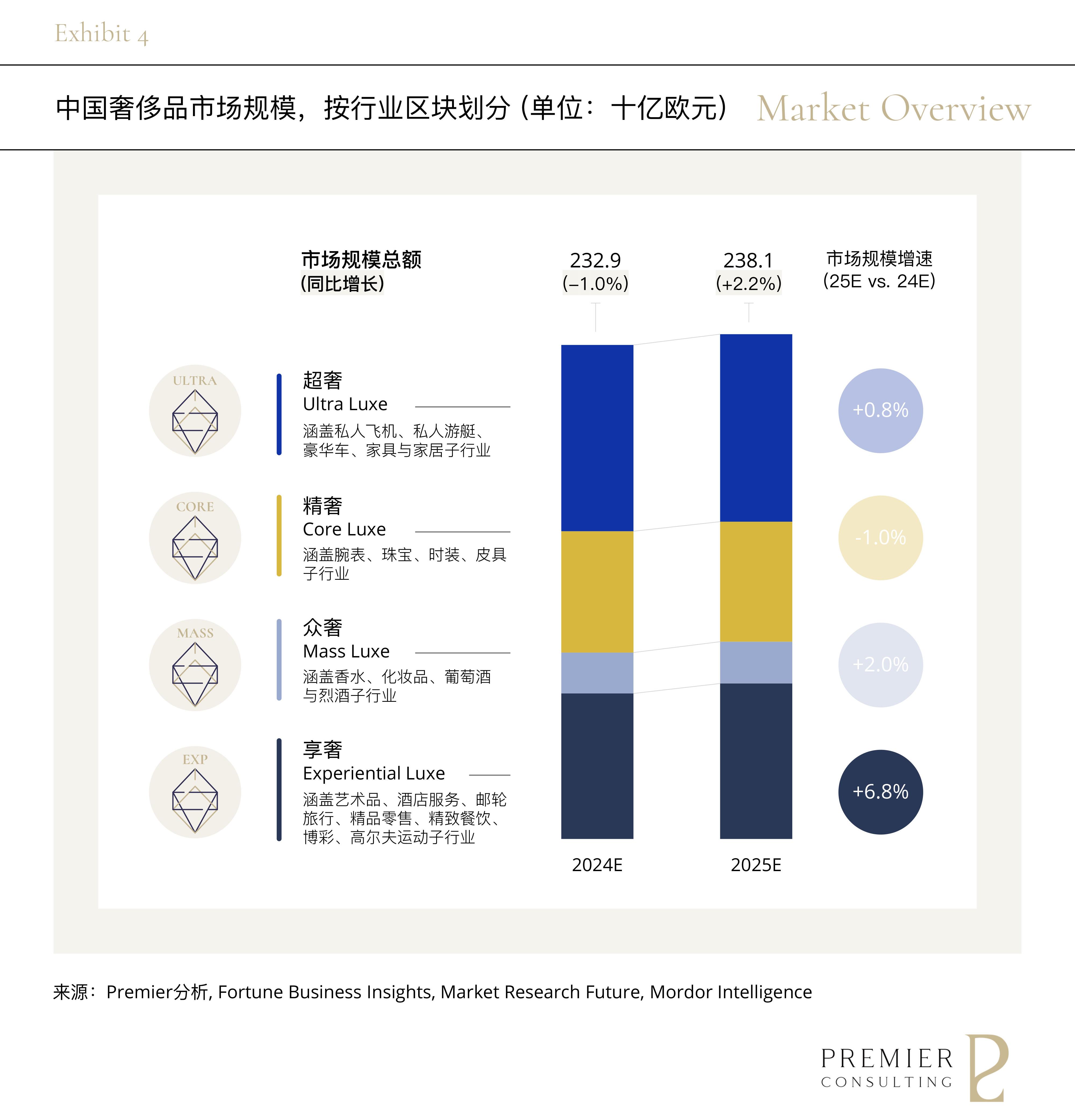 奢侈品的触点,正向全生活方式渗透。奢华酒店、精致餐饮、邮轮旅行、健康奢养、体育赛事以及独家文化体验,这些原本属于高端生活方式范畴的消费场景,如今正成为各大奢侈品集团争相投注的核心领域。Premier预计,到2025年,中国奢侈品行业的享奢市场将同比增长6.8%[Exhibit 4],远超其他奢侈品品类的增速,并进一步推动整体市场规模的回升。