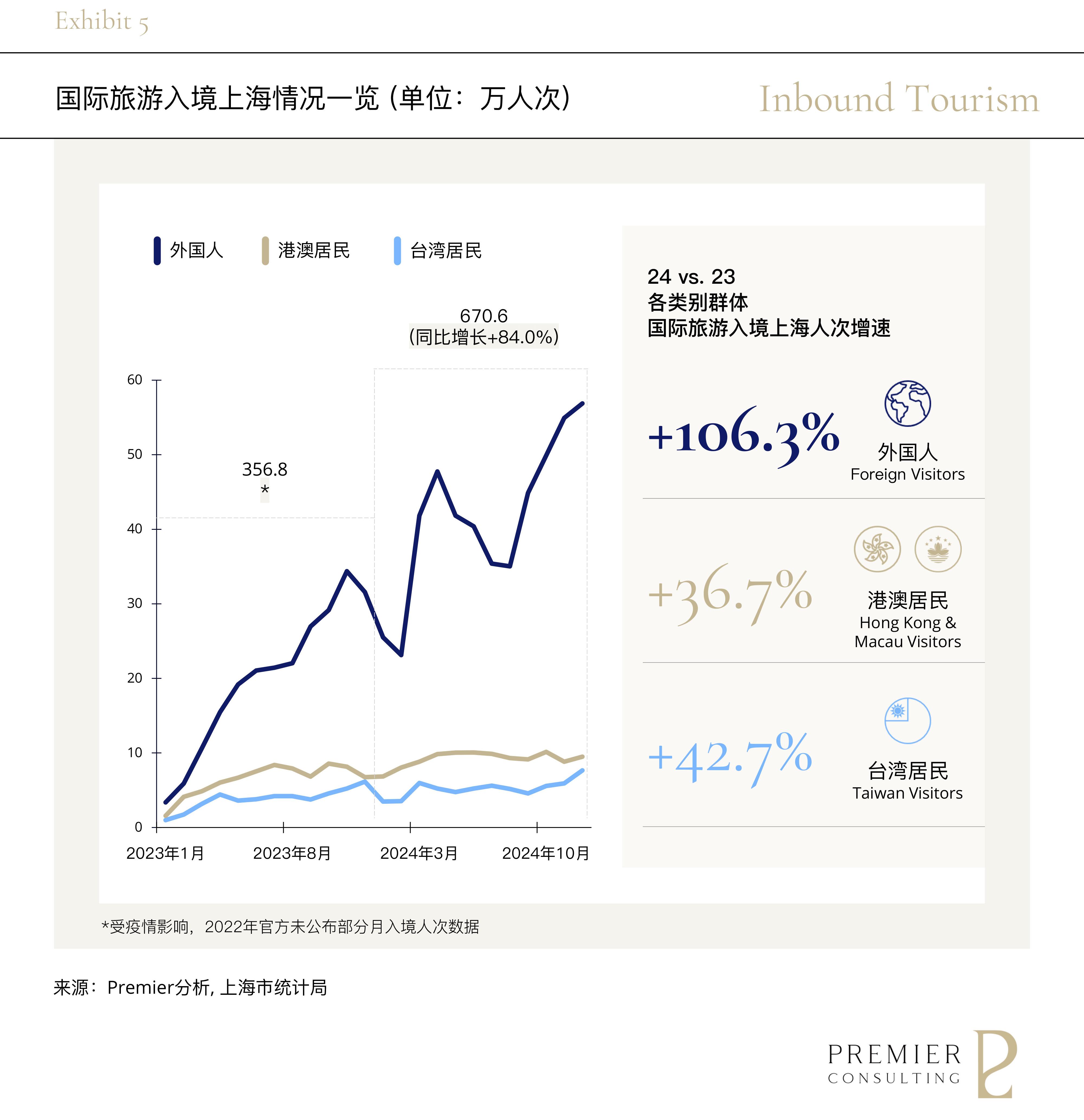 政策的放宽很快在数据上得到印证。2024年,国际旅客入境上海的数量达到670.6万人次,同比增长84%[Exhibit 5]。其中,外国游客的增长尤为惊人,增幅高达106.3%。不仅是欧美和东南亚市场的旅客,中国港澳台游客的回流趋势同样强劲。