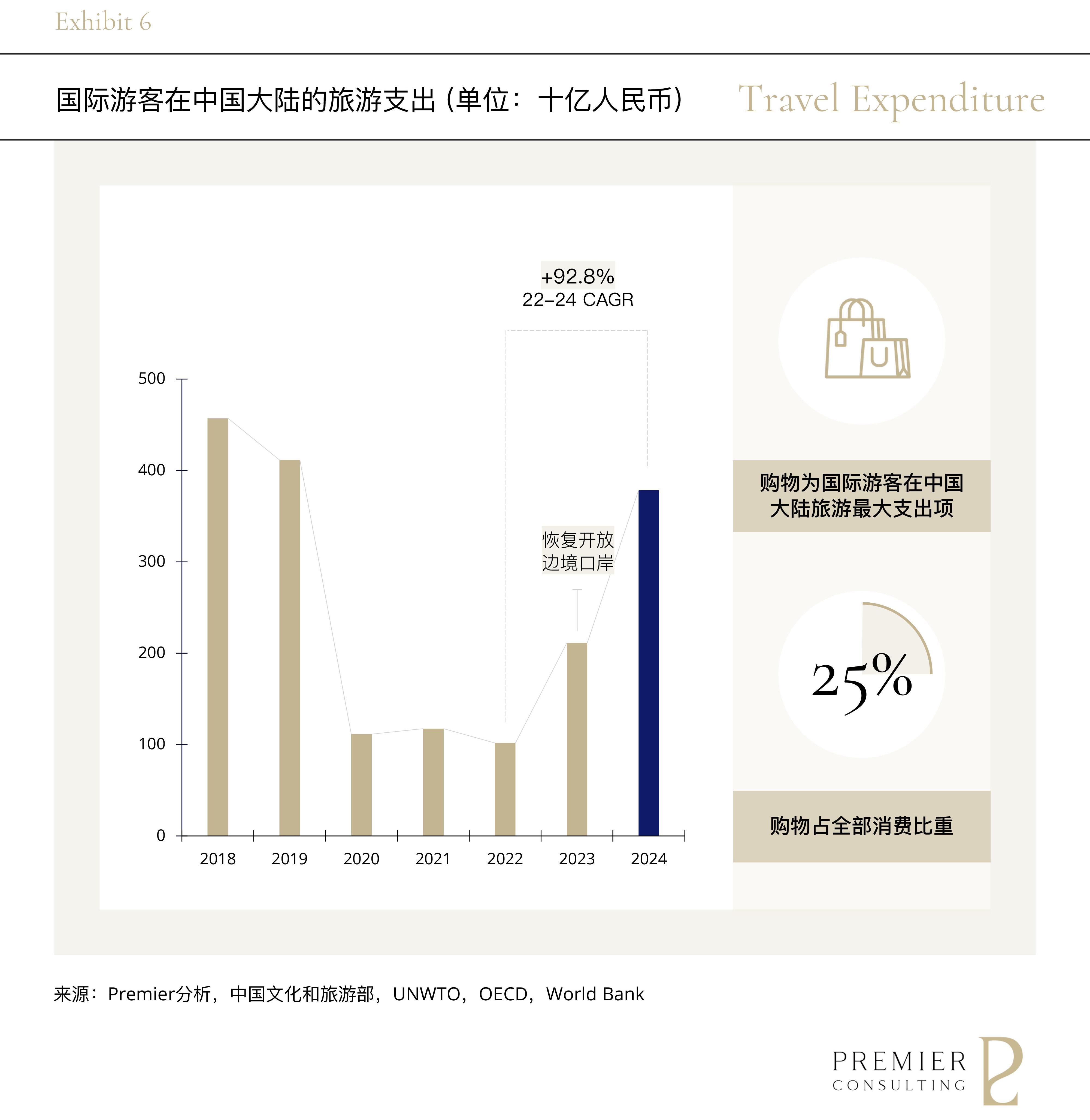 游客人群的雄厚消费实力亦不容忽视。2024年,国际游客在中国大陆的旅游支出年复合增长率高达92.8%,其中购物消费占比达到25%[Exhibit 6],成为游客支出的最大项。换言之,中国之旅不仅是一场风景观光与文化体验之旅,更为全球奢华品牌的境外消费拓展了市场广域。从精品店、机场免税店到奢华酒店内的专属购物体验,高端消费场景中蕴藏着巨大商机。