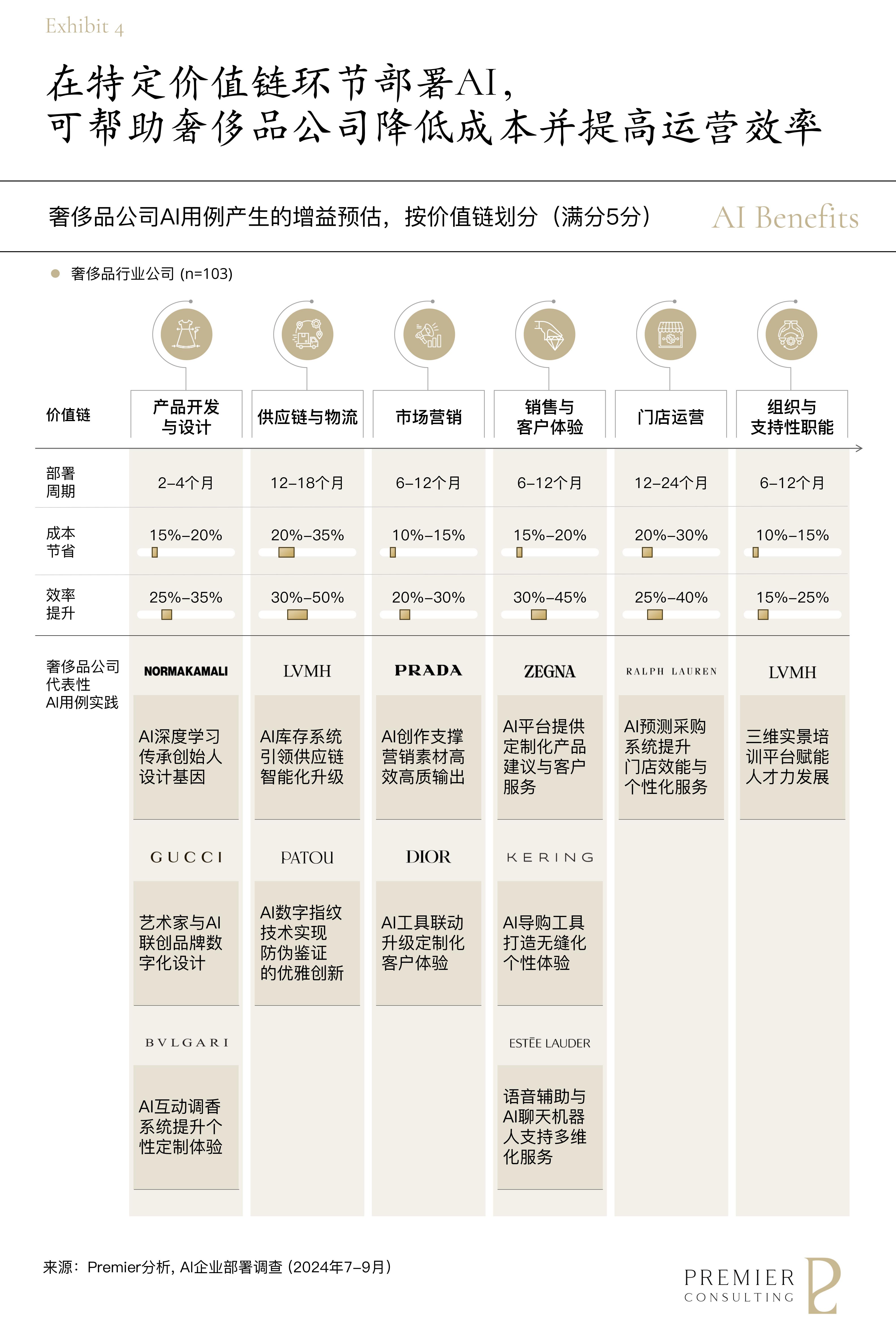 然而,整体行业对AI的投入增速依旧可观。GlobalData研究显示,奢侈品行业在过去三年对AI的累计投资逾3.6亿美元,较前三年期同比增长79%。Premier预计,2024至2028年间,全球奢侈品公司的AI相关投入CAGR将维持在约12.7%;至2028年,奢侈品行业企业级AI投入将达27亿美元[Exhibit 2],相当于同期全球奢侈品市场规模的1‰。