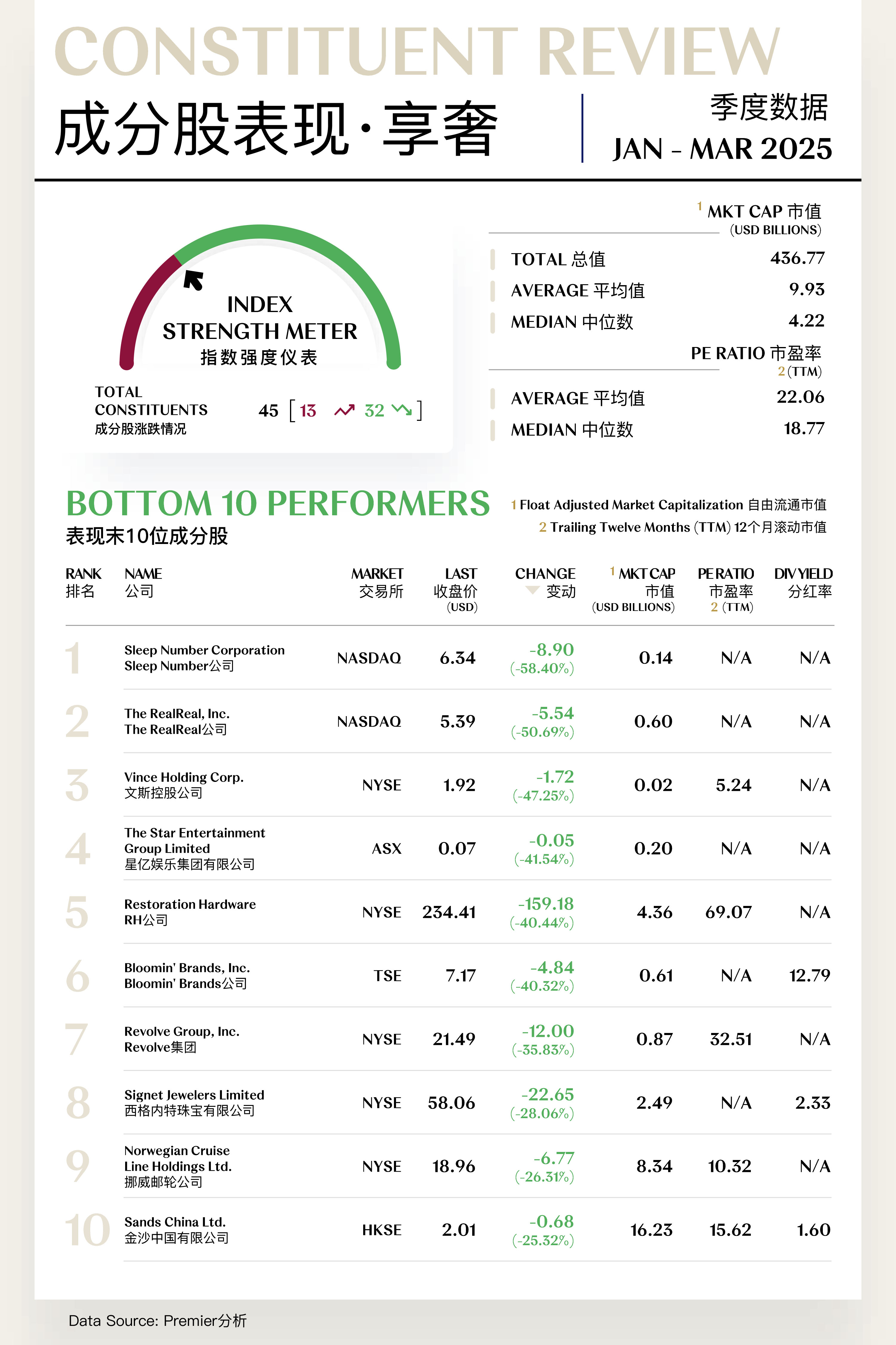 享奢指数(Experiential Luxe Index)共包括45支个股,其中13支上涨,32支下跌。