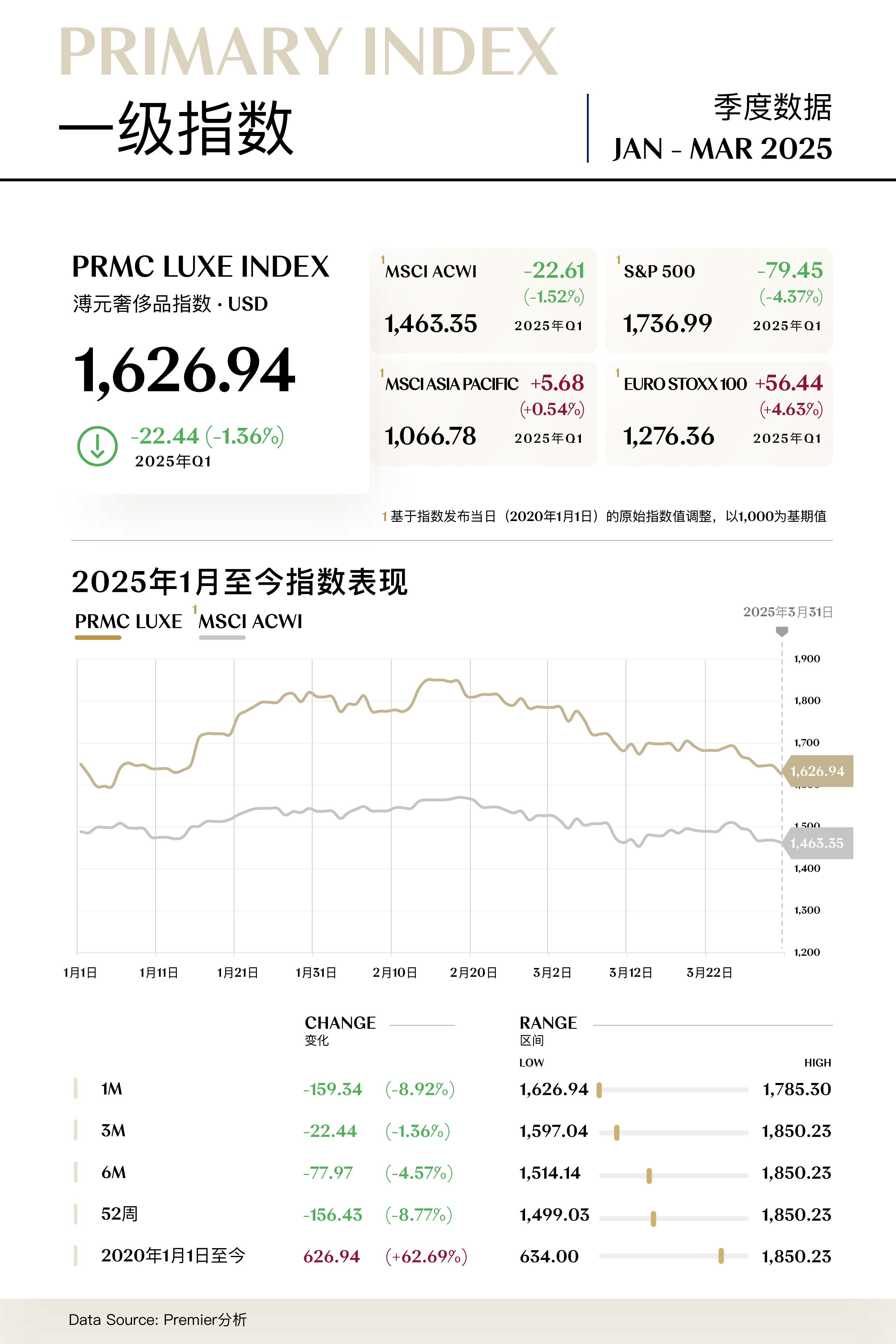 溥元奢侈品指数(PRMC Luxe Index)第一季度收于1,626.94点,季内下跌22.44点(-1.36%),表现逊于MSCI ASIA PACIFIC及EURO STOXX 100,但优于MSCI ACWI及S&P 500等全球主要指数。二级指数方面,精奢指数(+2.05%)逆势上行,众奢指数(+0.65%)运行稳定,超奢指数(-4.10%)略有下行,享奢指数(-12.79%)则大幅回退。