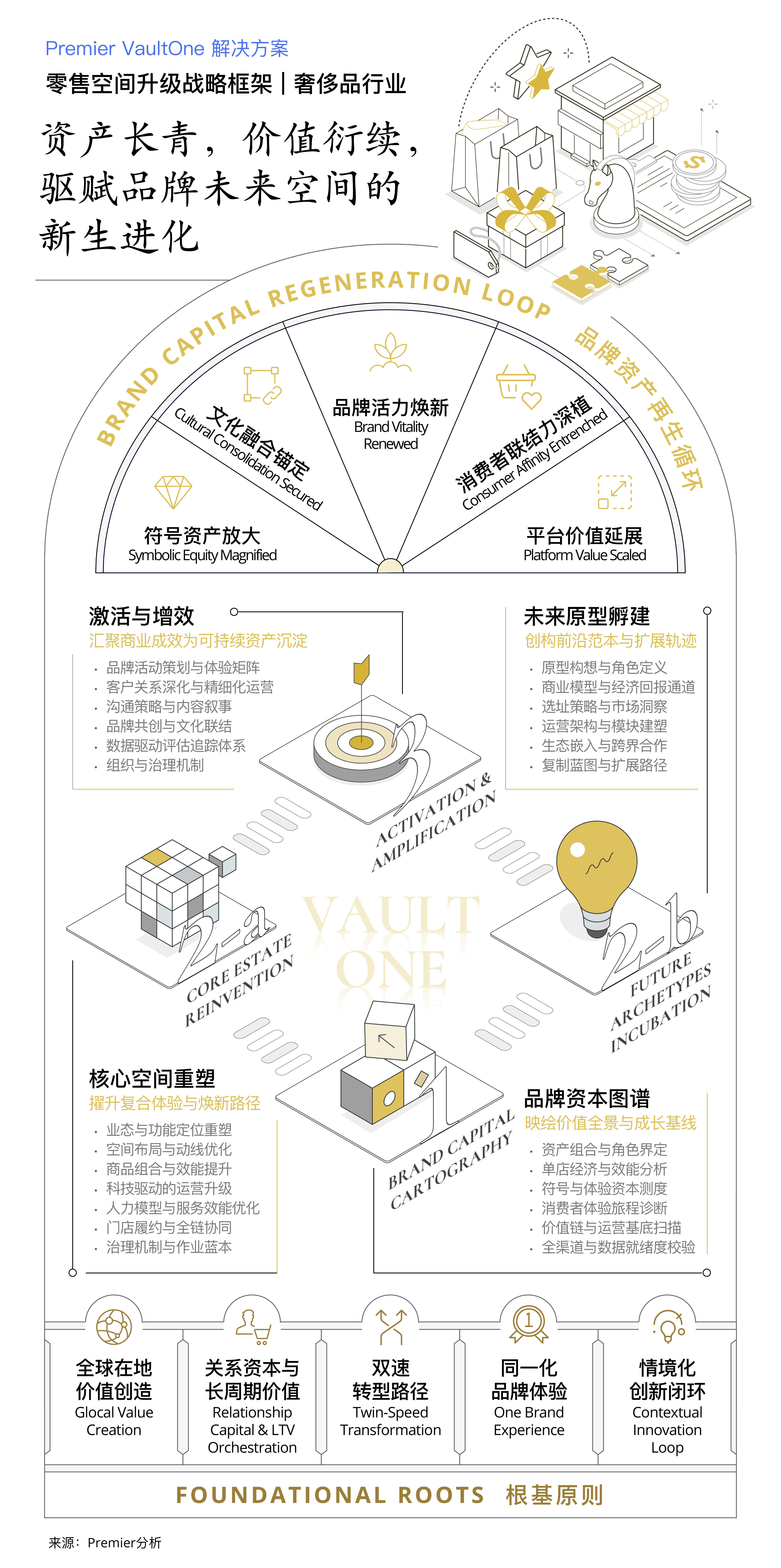 Premier提出的VaultOne奢侈品零售空间升级战略框架以五大根基原则为支点,确保空间升级具备稳定性、一致性与演进性。它们既稳固品牌资产的基座,又统一多元触点逻辑,并为未来留出迭代弹性。