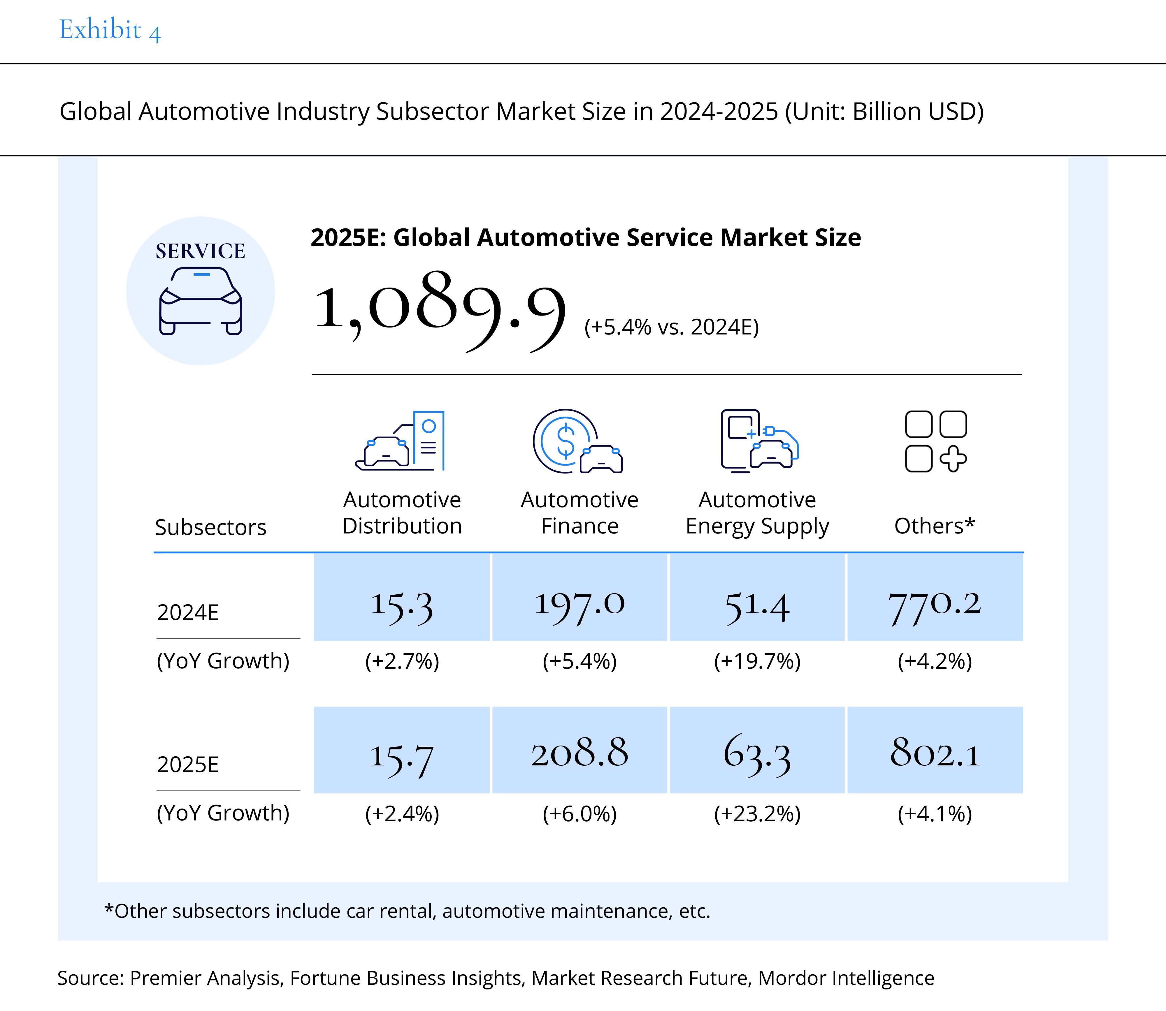 From an industry chain perspective, with the steady development of raw materials, body components, and power batteries, the upstream market is expected to reach $1,525.7 billion in 2025, growing by approximately 3.3%. The midstream market, however, is projected to grow only by 0.8% to $1,961.6 billion, affected by the decline of gasoline vehicles. In contrast, the downstream market, benefiting from the rapid growth of the energy replenishment industry, is expected to reach $1,089.9 billion, with a growth of 5.4%.