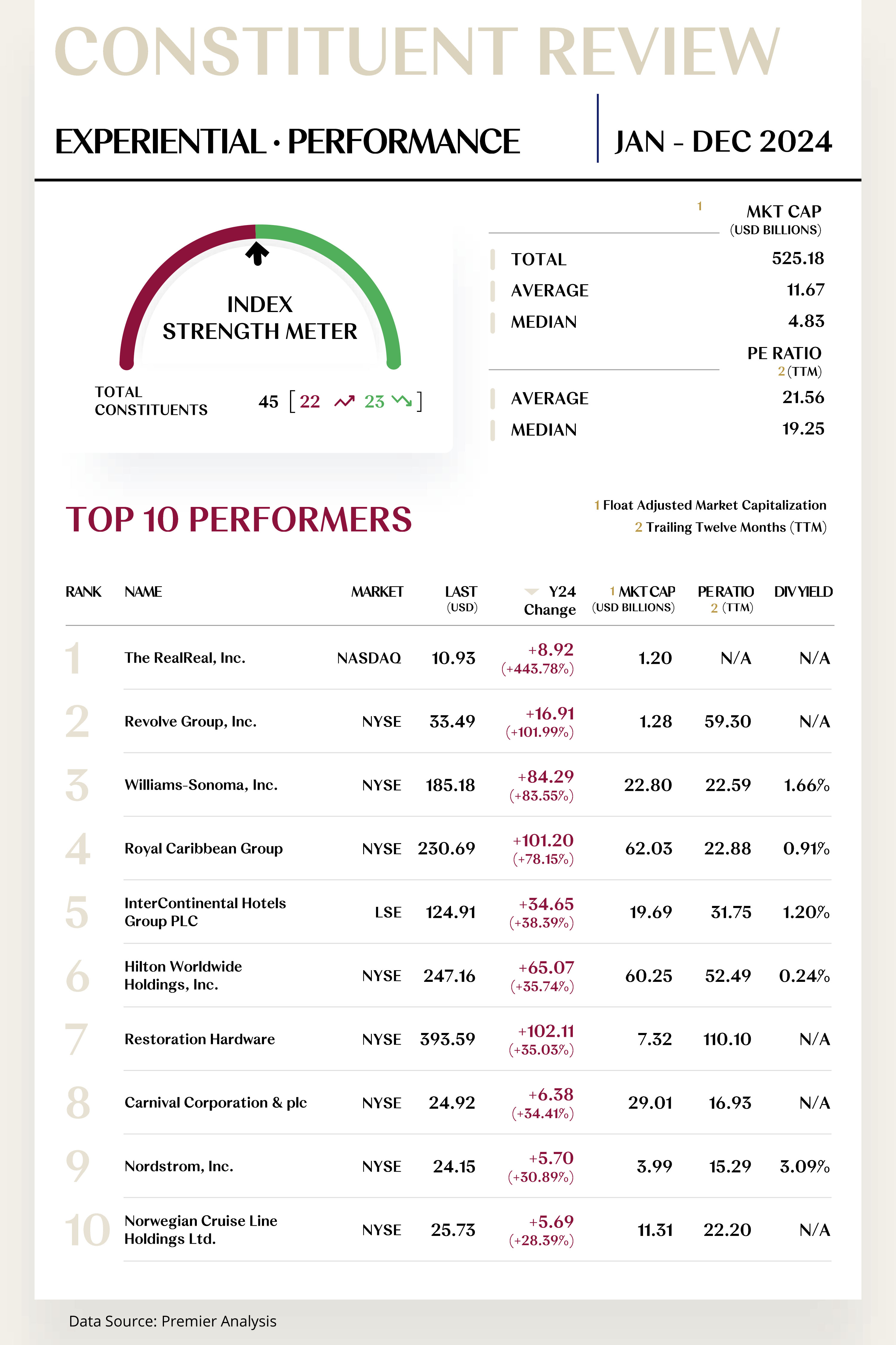 The Experiential Luxe Index comprises 45 stocks, with 22 rising and 23 falling.