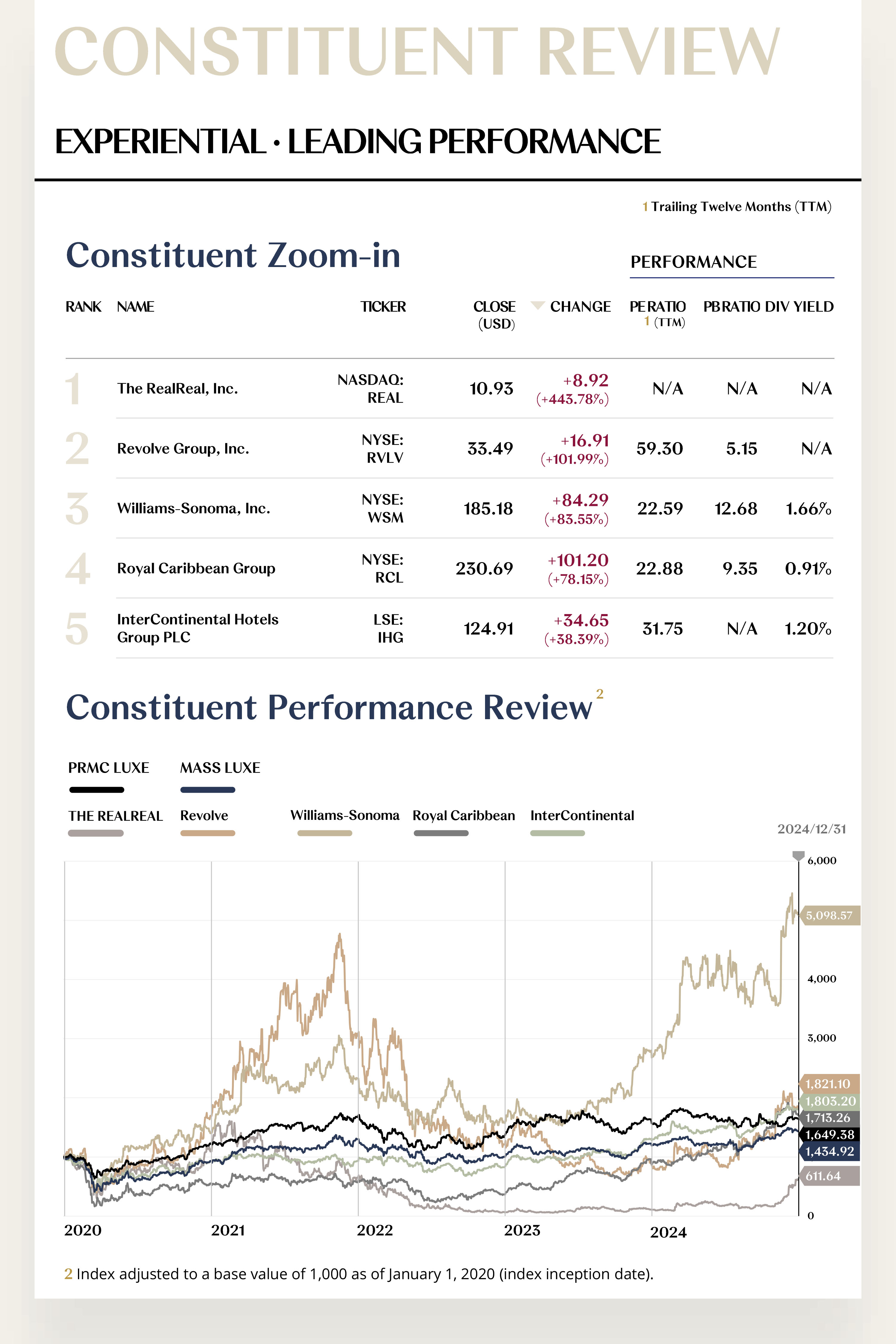 The Experiential Luxury Index closed the year at 1,434.92 points, up 208.12 points from the beginning of the year, marking a 16.96% year-over-year increase, the largest gain among secondary indices. Driven by the global rise of experiential consumption, strong performances from publicly listed companies in the cruise and retail sectors fueled stock price gains, boosting the index. Although geopolitical tensions from April to August temporarily dampened market confidence, leading to a brief pullback, the index entered a steady upward trajectory from September as the global economy recovered and consumer demand rebounded, nearing the 1,500-point threshold in December.