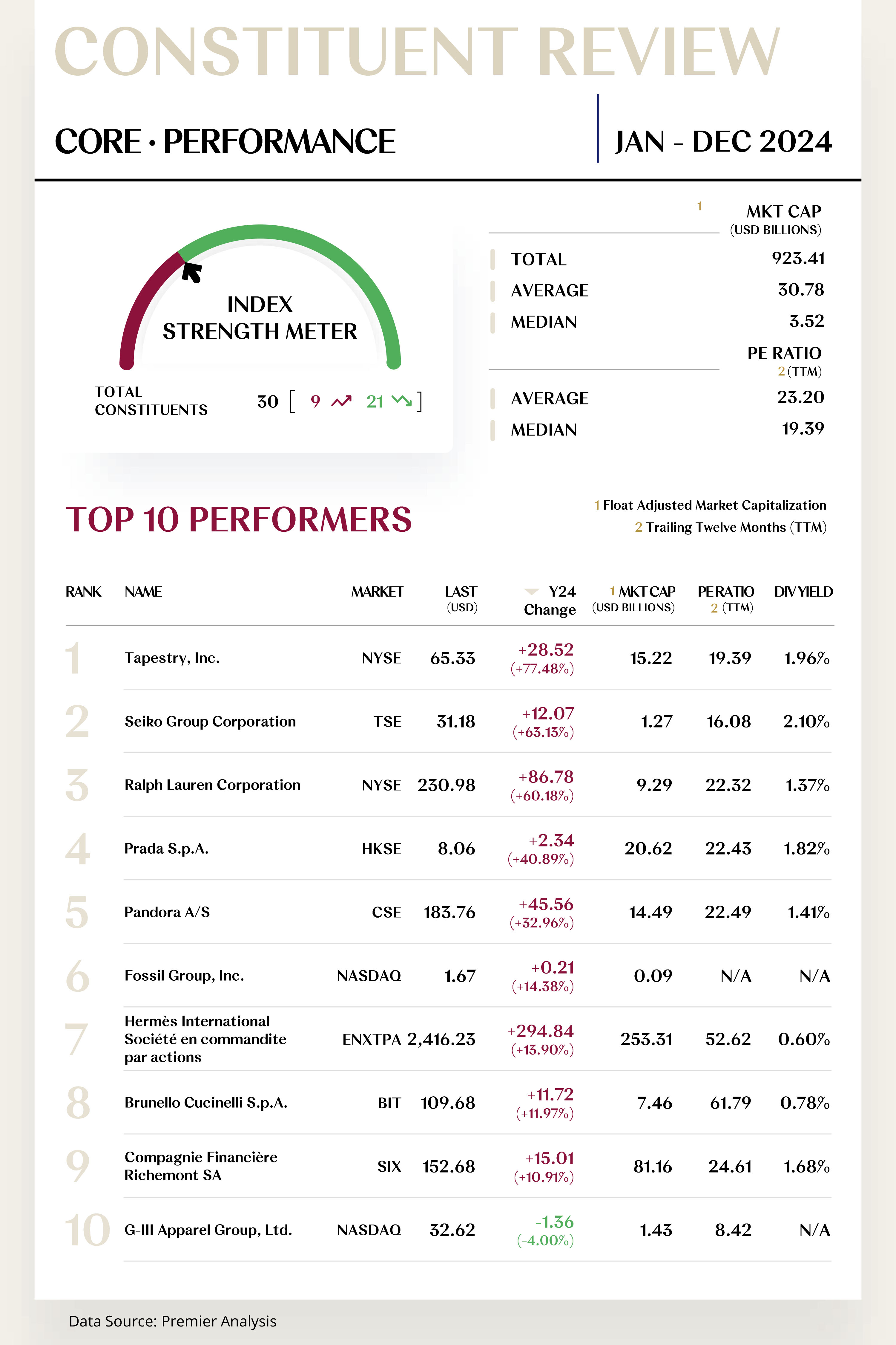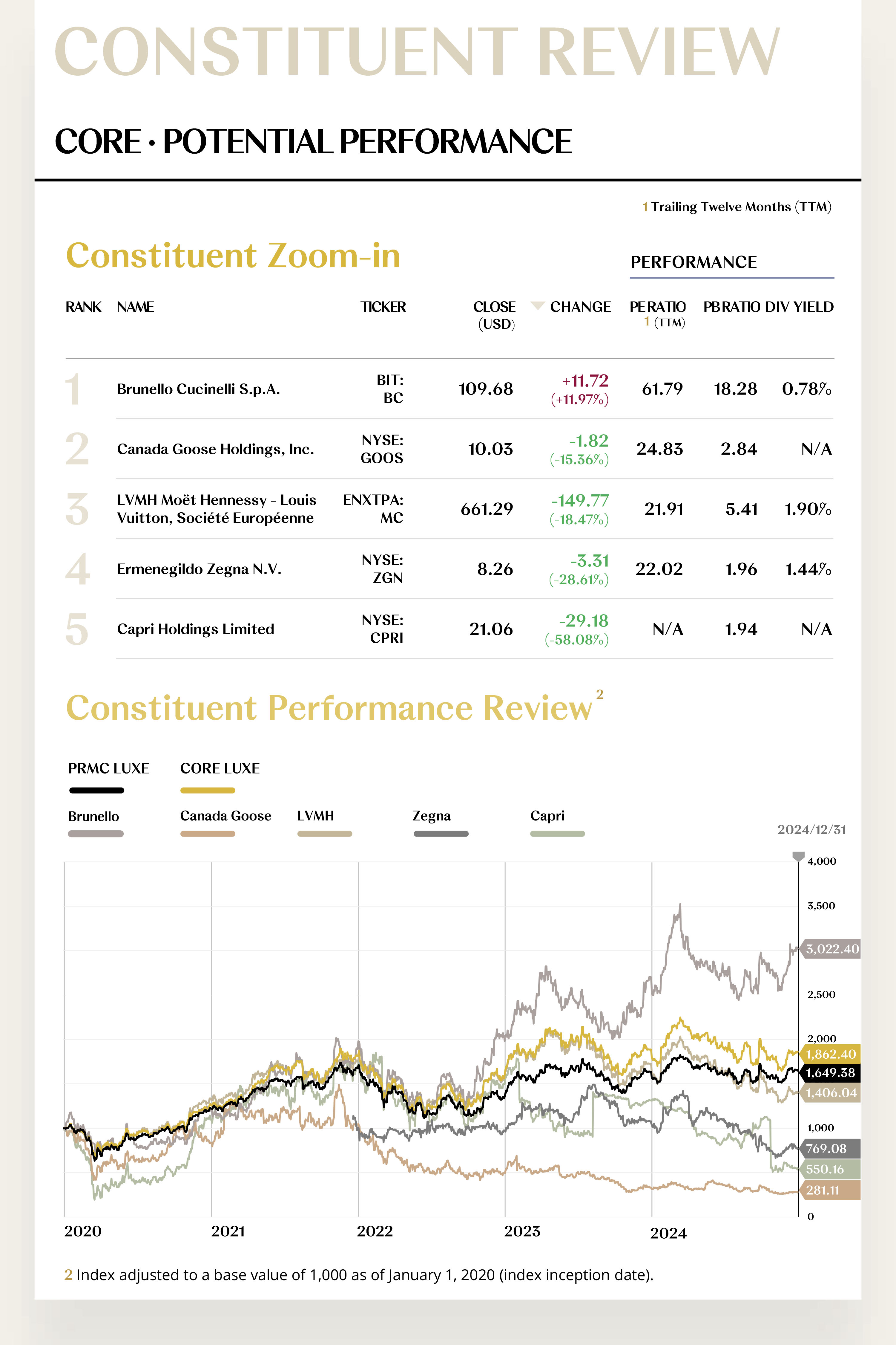 Looking ahead to 2025, the luxury industry is poised to enter a new phase where deepening globalization coexists with regional differentiation. The recovery of key global markets and the further expansion of emerging ones will provide continued momentum for industry growth. Meanwhile, "hyper-localization" and "digital co-creation" will emerge as central themes in luxury brand expansion. Investment strategies will increasingly focus on long-term trends, particularly category extensions and the continuous expansion of global market share among luxury brands. Companies that lead in mergers & acquisitions and supply chain innovation will gain a stronger competitive edge in 2025, becoming key drivers of index growth.