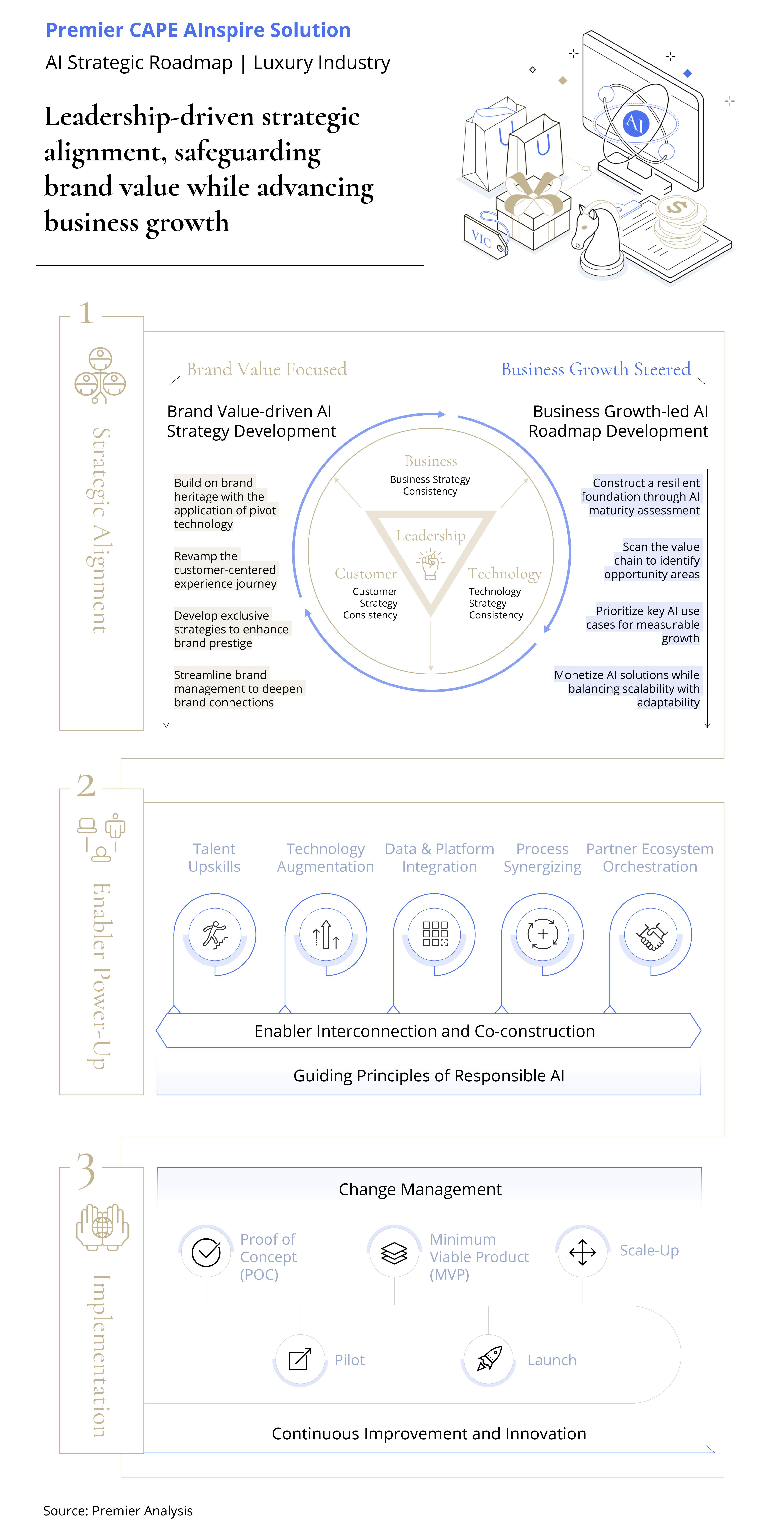 Tailored to the luxury industry’s focus on brand values, Premier’s CAPE AInspire solution breaks down leadership alignment into three strategic pillars: consistency in business strategy, alignment with customer strategy, and technological coherence. By optimizing implementation and integrating AI tools for direct impact, Premier helps businesses preserve their brand legacy while exploring technology-driven growth. This approach nurtures a balanced, symbiotic relationship between people, brand, and innovation.