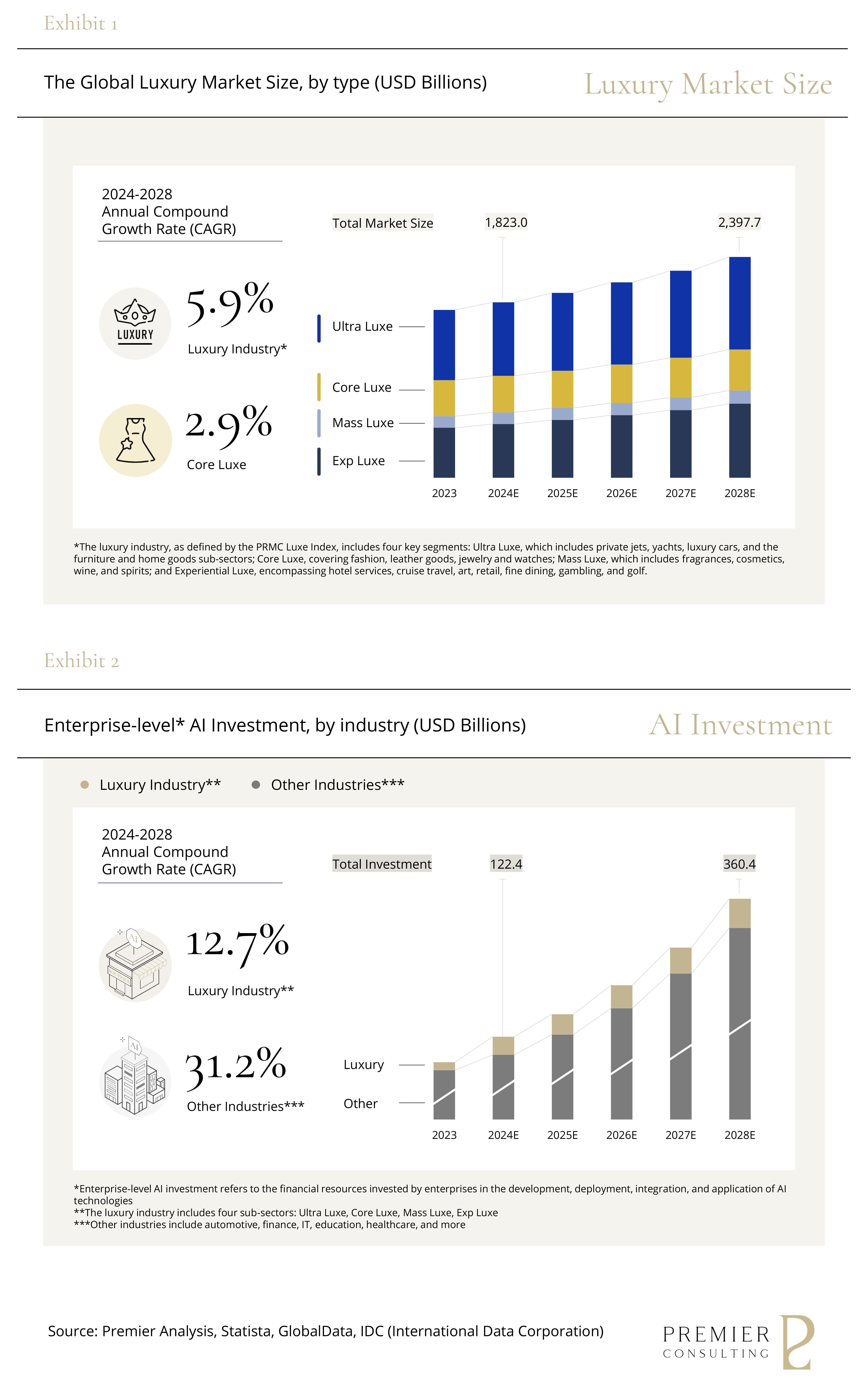 Amid the subdued economic climate of 2024, Premier forecasts that the global luxury market will grow at a compound annual growth rate (CAGR) of 5.9% through 2028 [Exhibit 1]. Within this market, the ultra-luxury segment, including giants like LVMH, Hermès, and Chanel, is particularly under pressure to sustain growth.
