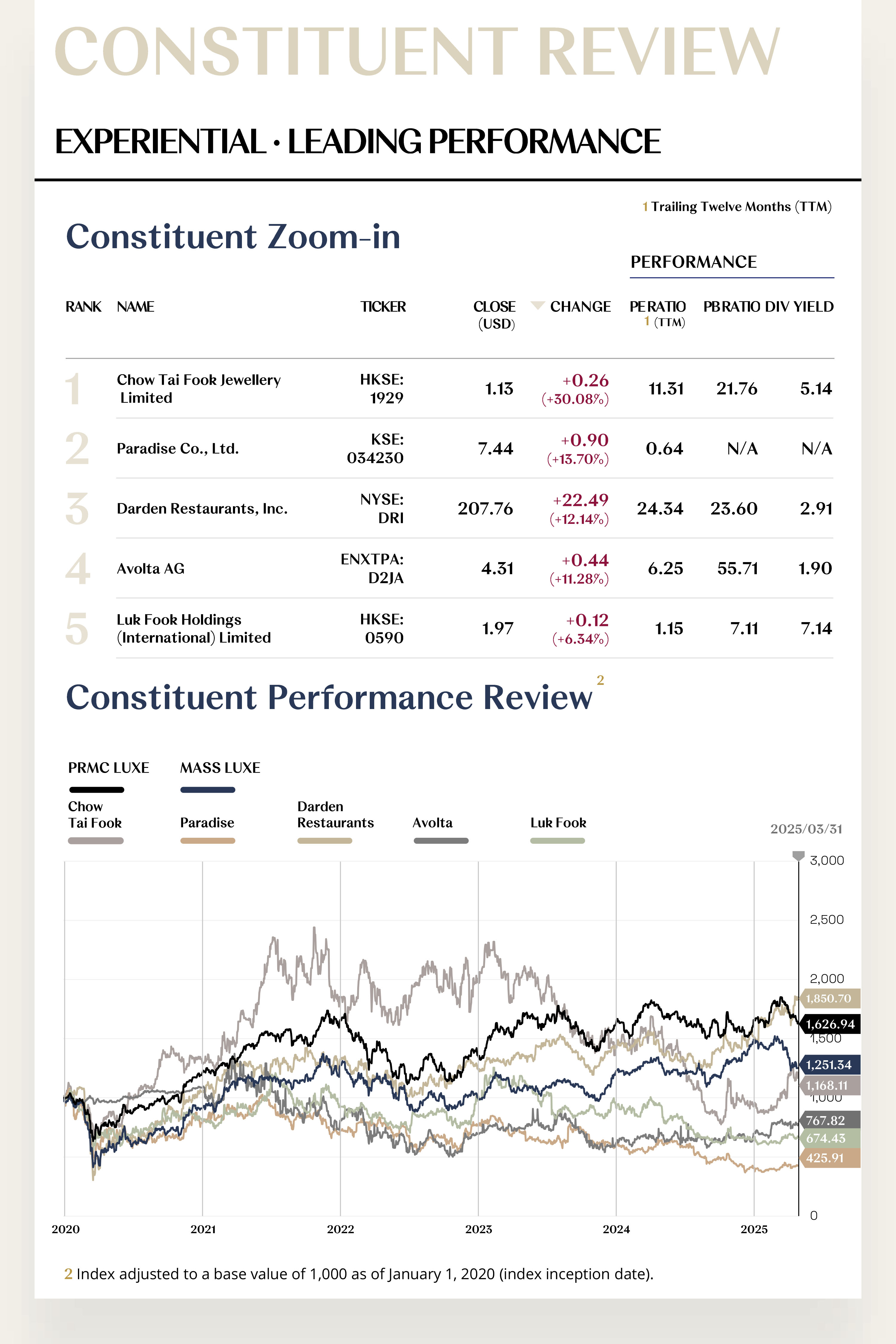 The Experiential Luxe Index closed at 1,251.34 points, down 183.58 points or 12.79%, marking the largest decline among secondary indices in Q1. The Experiential Luxe sector had previously benefited from the global tourism recovery and the deepening trend of experiential consumption, showing strong performance. However, since February 2025, rising global geopolitical tensions, coupled with escalating international trade friction, particularly affecting shipping and cross-border travel, have had a direct negative impact on high-experience service industries such as hotels and cruises. This has significantly dampened investor sentiment and triggered a sharp decline in the index. Looking ahead to Q2, although market confidence will take time to recover, the Experiential Luxe Index is expected to enter a period of stabilization and gradual recovery, supported by the ongoing recovery in experiential consumption.