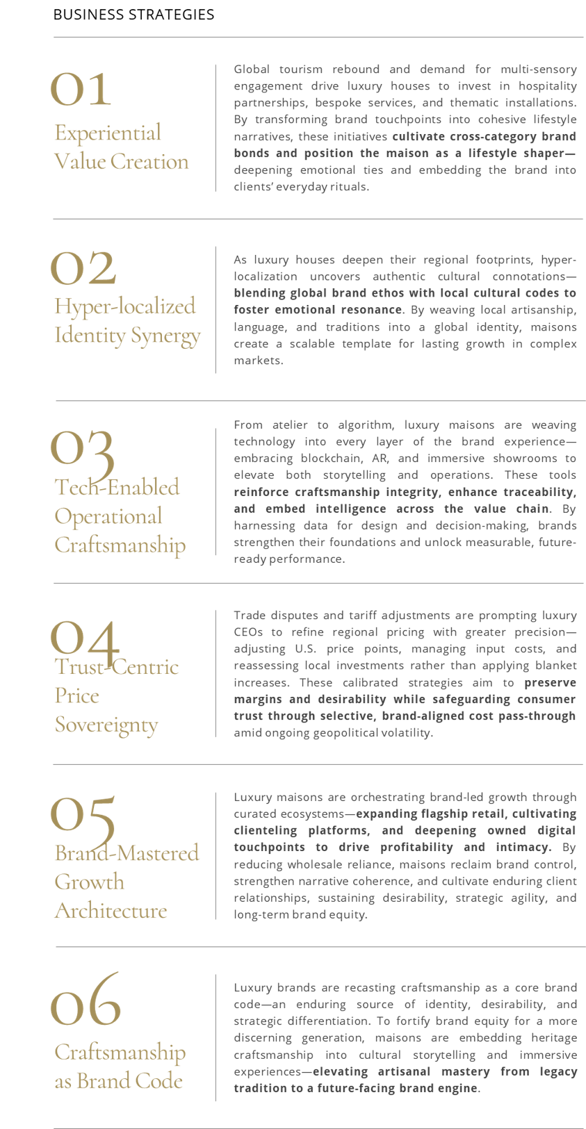 To that end, leading brands are reconfiguring their strategies—leveraging agile pricing, immersive storytelling, localized authenticity, and digital innovation to preserve margin integrity and brand desirability. By integrating these levers into their operating models, maisons are not merely withstanding short-term pressures, but also establishing resilient foundations for sustained performance and future expansion.